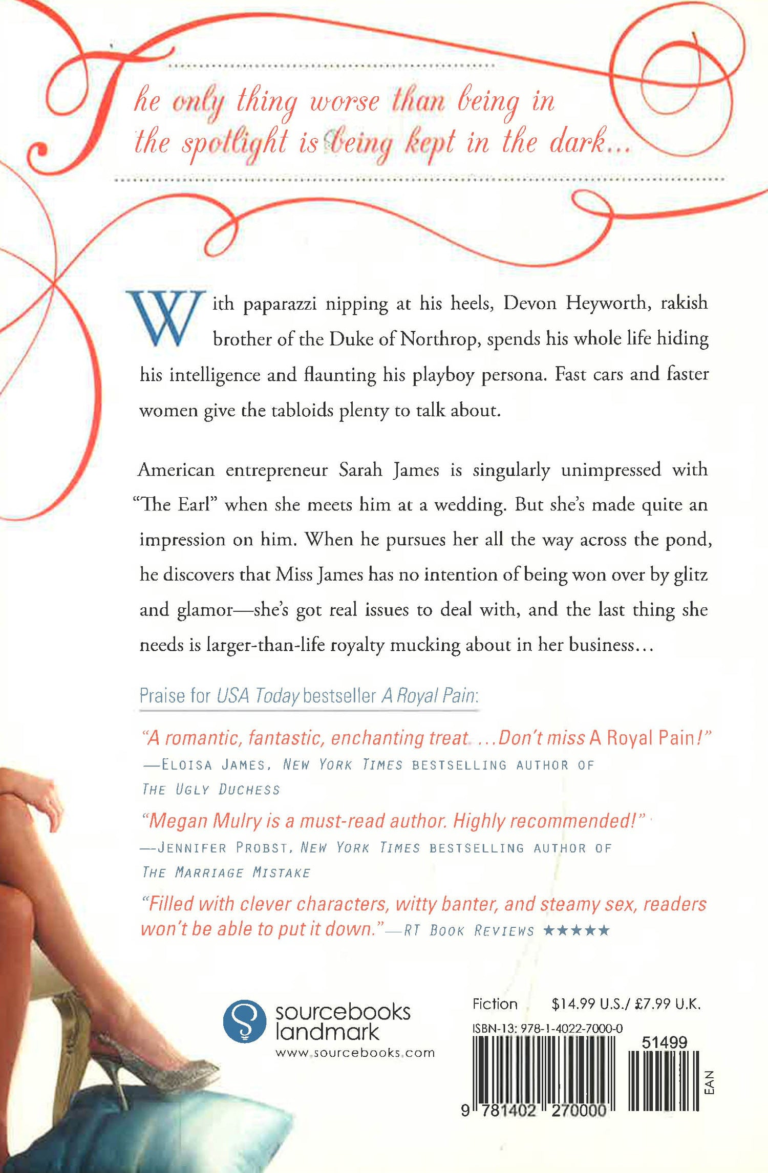 American entrepreneur Sarah James is singularly unimpressed with "The Earl" when she meets him at a wedding. But she's made quite an impression on him. When he pursues her all the way across the pond, he discovers that Miss James has no intention of being won over by glitz and glamorshe's got real issues to deal with, and the last thing she needs is larger-than-life royalty mucking about her business...