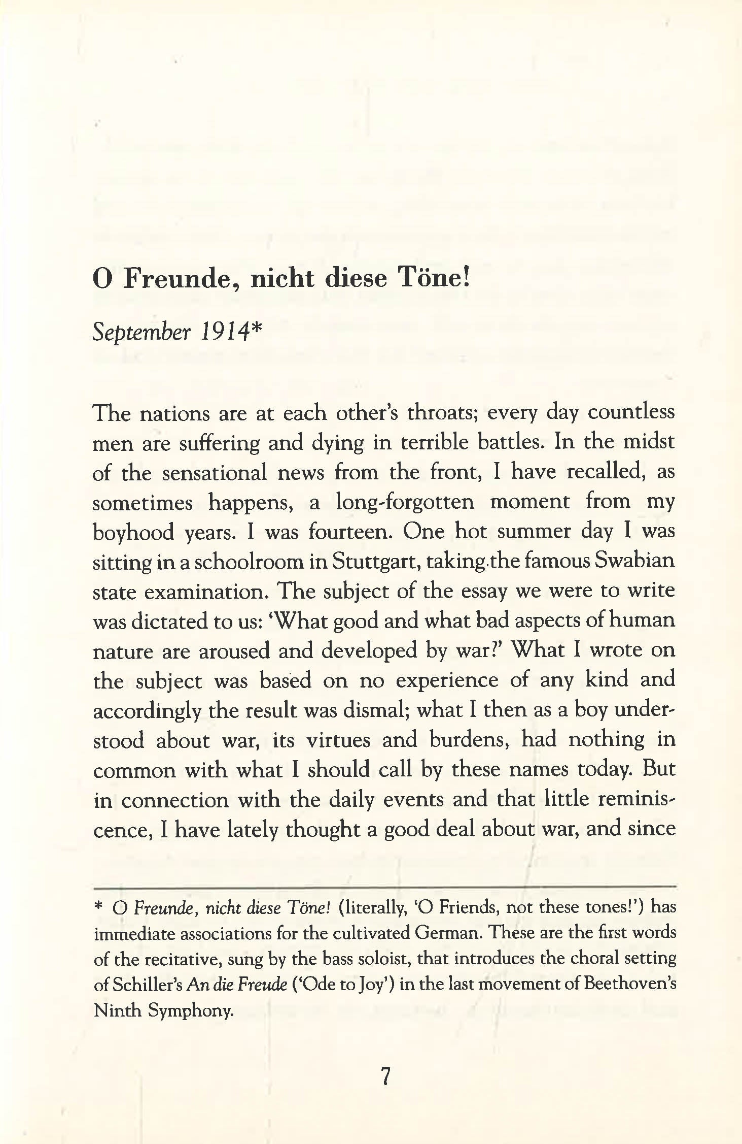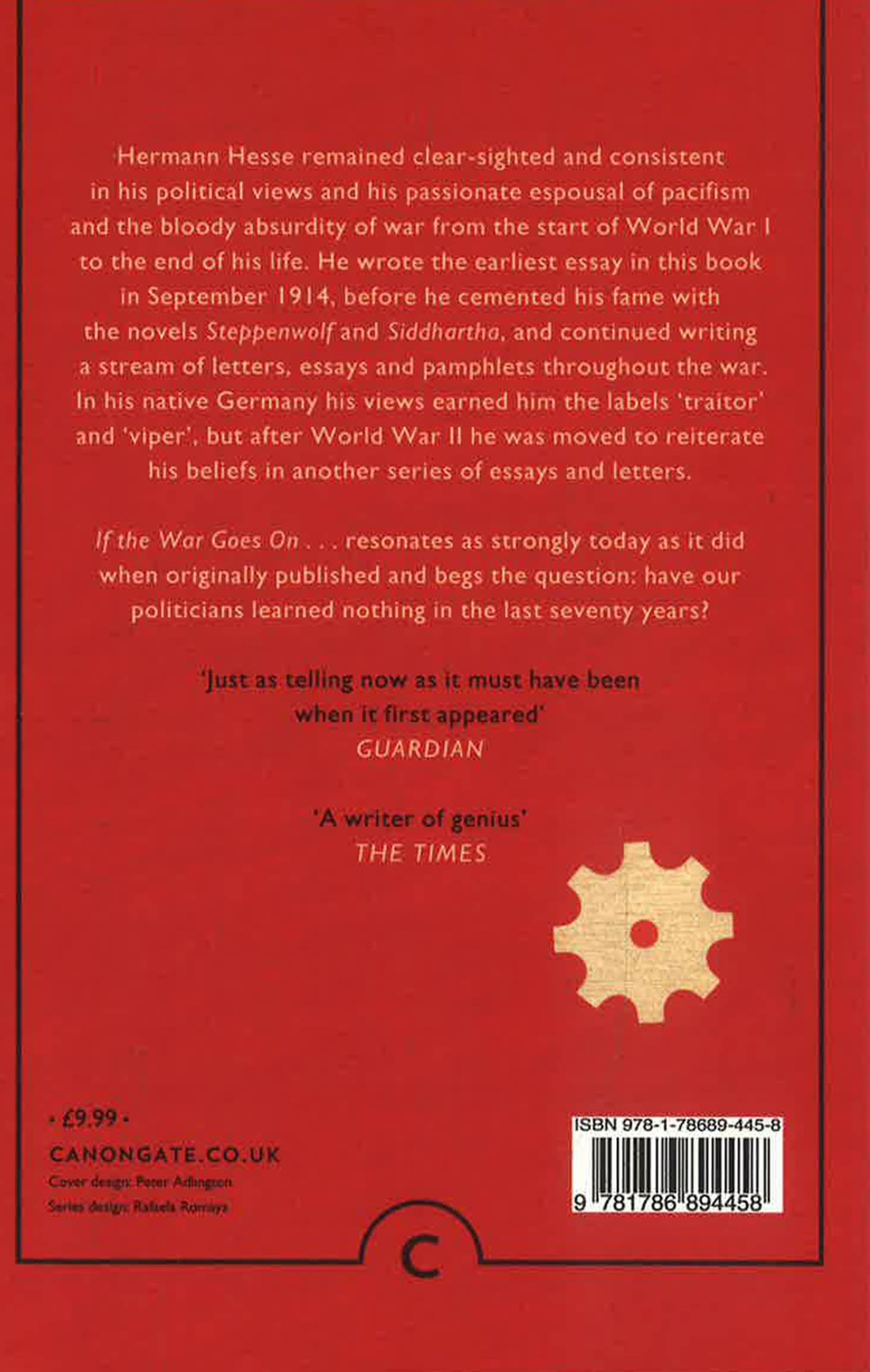Herman Hesse remained clear-sighted and consistent in his political views and his passionate espousal of pacifism and the bloody absurdity of war from the start of the First World War to the end of his life. He wrote the earliest essay in this book in September 1914, before he cemented his fame with the novels Steppenwolf and Siddhartha, and continued writing a stream of letters, essays and pamphlets throughout the war. In his native Germany his views earned him the labels 'traitor' and 'viper', but after World War II he was moved to reiterate his beliefs in another series of essays and letters.