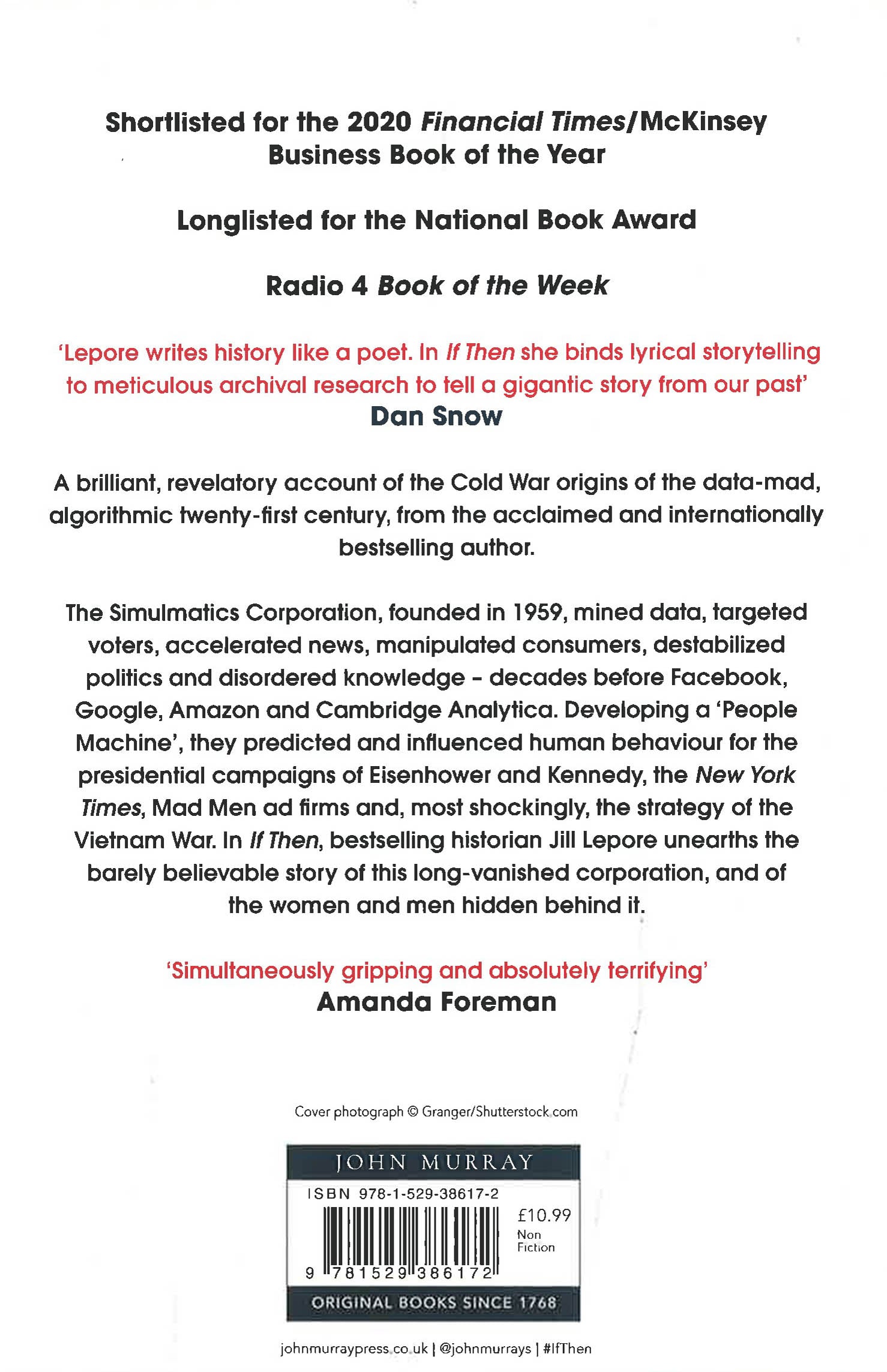 Radio 4's Book of the WeekA Financial Times Book of the YearShortlisted for the 2020 Financial Times / McKinsey Business Book of the YearLonglisted for the National Book Award 'The story of the original data science hucksters of the 1960s is hilarious, scathing and sobering - what you might get if you crossed Mad Men with Theranos' David RuncimanThe Simulmatics Corporation, founded in 1959, mined data, targeted voters, accelerated news, manipulated consumers, destabilized politics, and disordered knowledge--decades before Facebook, Google, Amazon, and Cambridge Analytica. Silicon Valley likes to imagine it has no past but the scientists of Simulmatics are the long-dead grandfathers of Mark Zuckerberg and Elon Musk. Borrowing from psychological warfare, they used computers to predict and direct human behavior, deploying their "People Machine" from New York, Cambridge, and Saigon for clients that included John Kennedy's presidential campaign, the New York Times, Young & Rubicam, and, during the Vietnam War, the Department of Defence. In If Then, distinguished Harvard historian and New Yorker staff writer, Jill Lepore, unearths from the archives the almost unbelievable story of this long-vanished corporation, and of the women hidden behind it. In the 1950s and 1960s, Lepore argues, Simulmatics invented the future by building the machine in which the world now finds itself trapped and tormented, algorithm by algorithm.'A person can't help but feel inspired by the riveting intelligence and joyful curiosity of Jill Lepore. Knowing that there is a mind like hers in the world is a hope-inducing thing' George Saunders, Man Booker Prize-winning author of Lincoln in the Bardo'An authoritative account of the origins of data science, a compelling political narrative of America in the Sixties, a poignant collective biography of a generation of flawed men' David Kynaston'If Then is simultaneously gripping and absolutely terrifying' Amanda Foreman