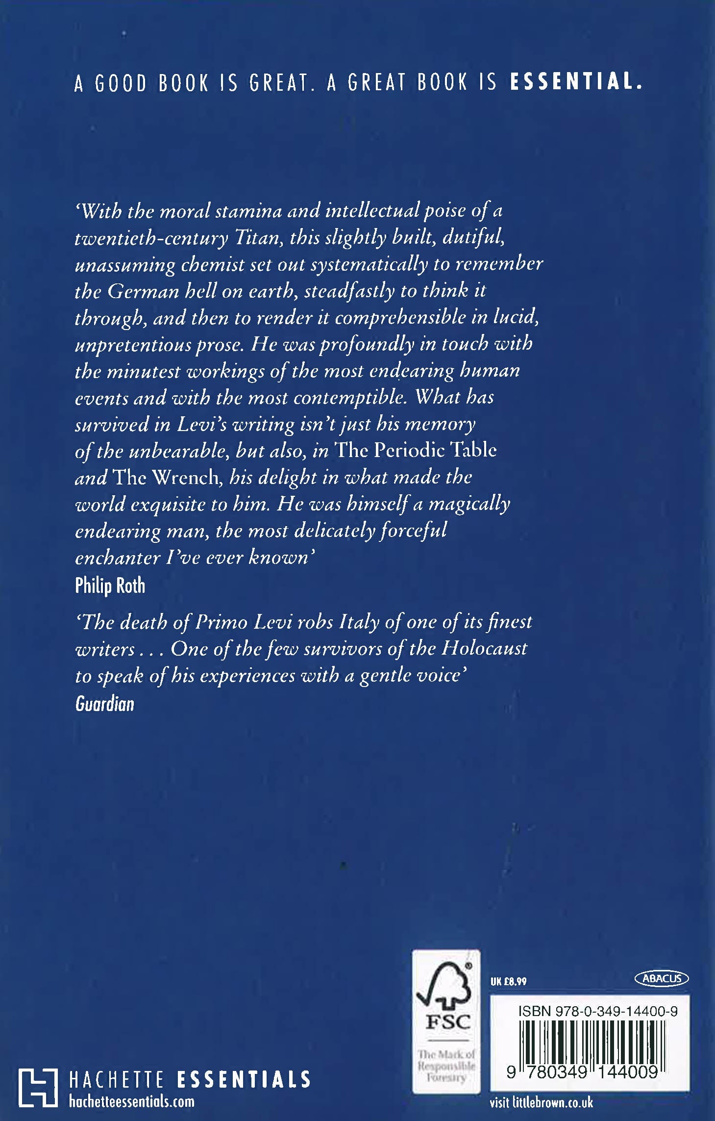 The Hachette Essentials series comprises a collection of titles that are regarded as modern classics. A carefully and lovingly curated selection of distinctive, ground-breaking fiction and non-fiction titles published since 1950. Timeless. Relevant. Passionate. Unified as a series - distinctive as books. A good book is great. A great book is essential.With the moral stamina and intellectual pose of a twentieth-century Titan, this slightly built, duitful, unassuming chemist set out systematically to remember the German hell on earth, steadfastly to think it through, and then to render it comprehensible in lucid, unpretentious prose. He was profoundly in touch with the minutest workings of the most endearing human events and with the most contempible. What has survived in Levi's writing isn't just his memory of the unbearable, but also, in THE PERIODIC TABLE and THE WRENCH, his delight in what made the world exquisite to him. He was himself a "magically endearing man, the most delicately forceful enchanter I've ever known" - PHILIP ROTH