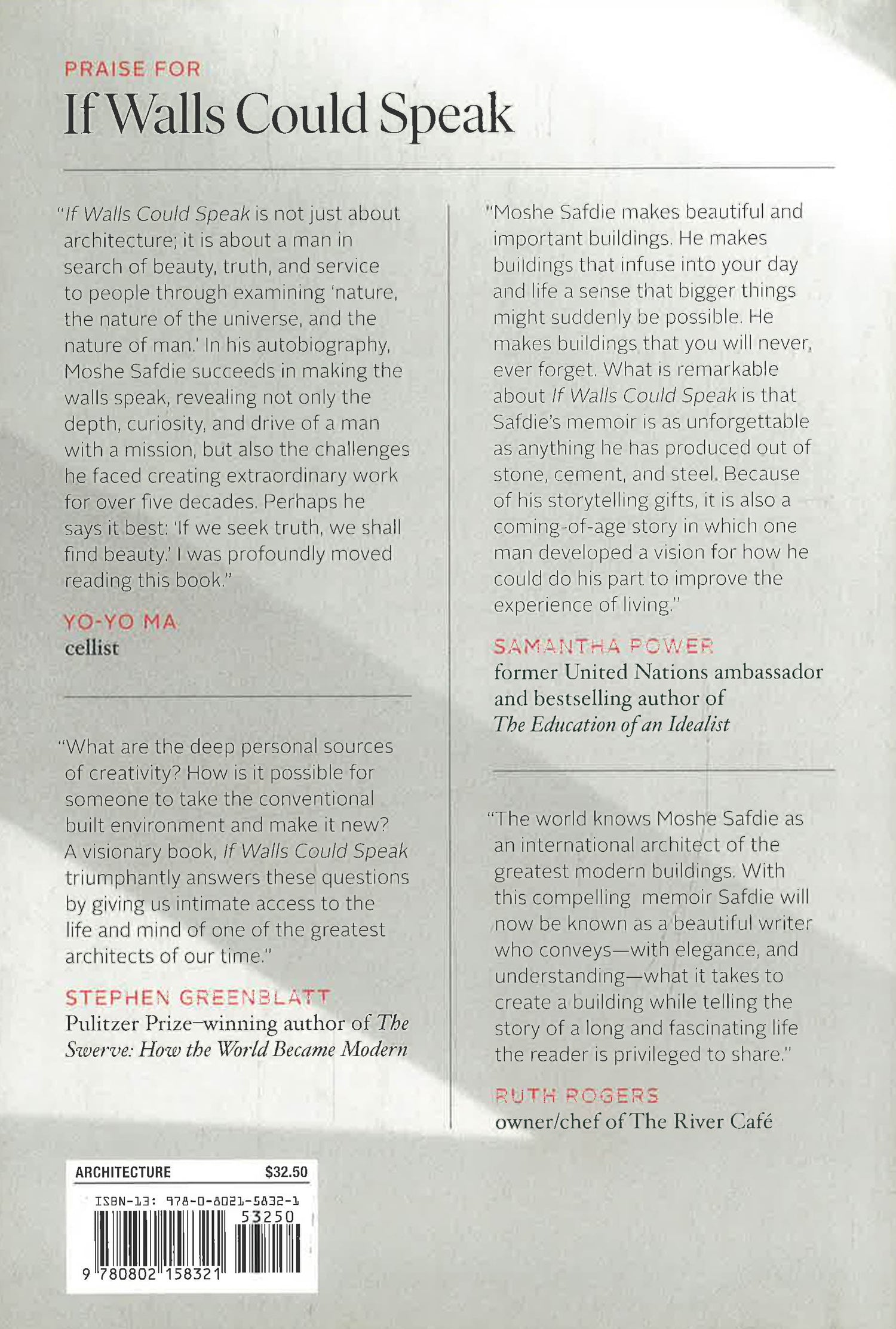 One of the world's greatest and most thoughtful architects recounts his extraordinary career and the iconic structures he has built--from Habitat in Montreal to Marina Bay Sands in Singapore--and offers a manifesto for the role architecture should play in societyOver more than five decades, legendary architect Moshe Safdie has built some of the world's most influential and memorable structures--from the 1967 modular housing scheme in Montreal known as "Habitat" and the Yad Vashem memorial in Israel, to the Crystal Bridges Museum in Arkansas and the Marina Bay Sands development and extraordinary Jewel Changi airport interior garden and waterfall in Singapore. For Safdie, the way a space functions is fundamental; he is deeply committed to architecture as a social force for good, believing that any challenge, including extreme population density and environmental distress, can be addressed with solutions that enhance community and uplift the human spirit. Safdie always refers to the "silent client" an architect must ultimately serve: the people who live in, work in, or experience a building.If Walls Could Speak takes readers behind the veil of an essential yet mysterious profession to explain through Safdie's own experiences how an architect thinks and works--"from the spark of imagination through the design process, the model-making, the politics, the engineering, the materials." Relating memorable stories about what has inspired him--from childhoods in Israel and Montreal to the projects and personalities worldwide that have captured his imagination--Safdie reveals the complex interplay that underpins every project and his vision for the role architecture can and should play in society at large. Illustrated throughout with drawings, sketches, photographs, and documents from his firm's voluminous archives that illuminate his stories, If Walls Could Speak ends with a chapter outlining seven projects Safdie would pursue around the world if resources and will were no issue and the choices were his to make.A book like no other, If Walls Could Speak will forever change the way you look at and appreciate any built structure.