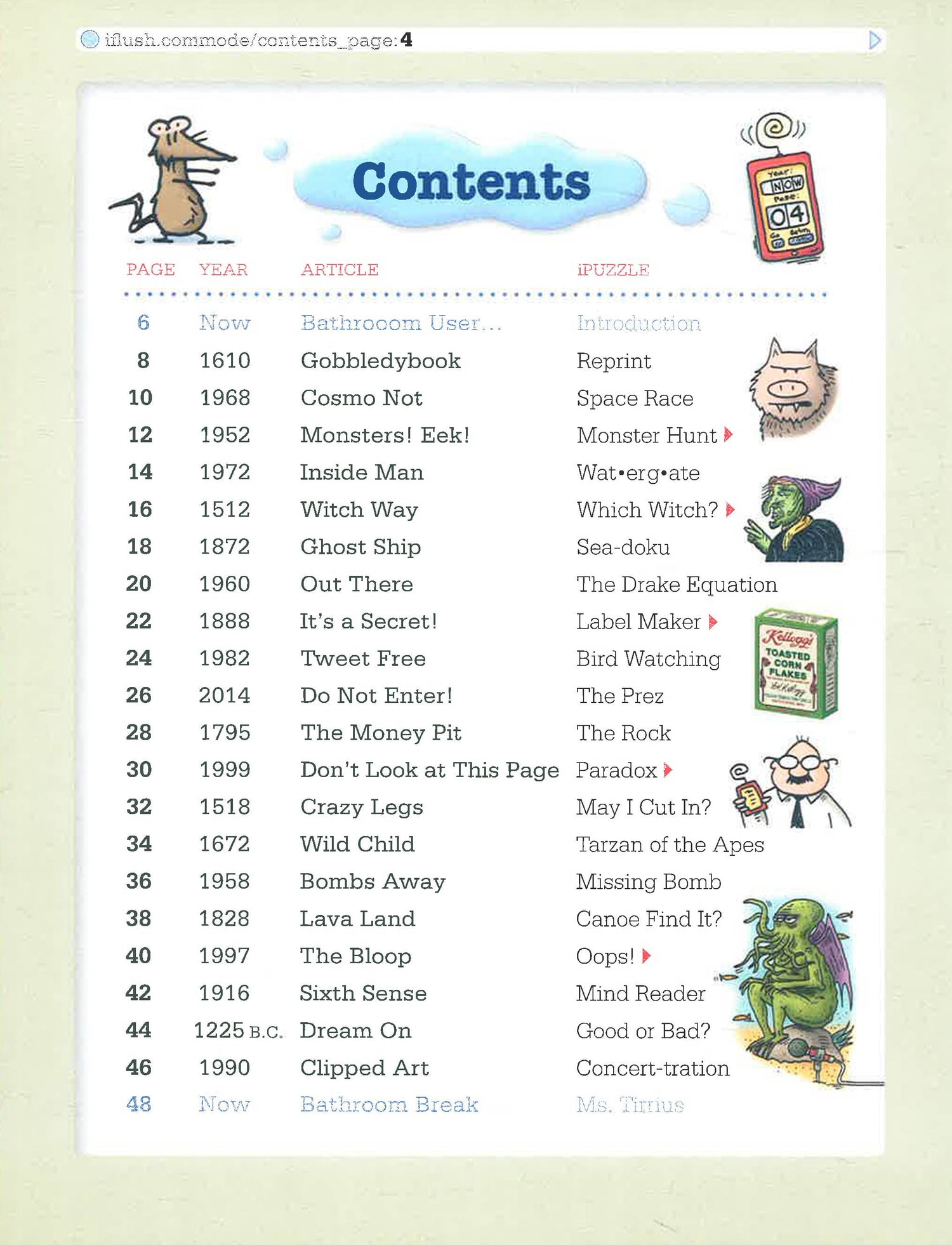 Ever meet a reader who didn’t love a mystery? Neither has Uncle John. That’s why he’s sending our lovable iFlush host Dwayne the lab rat on a new mission: find the most baffling mysteries of all time. How? By piloting the S.S. Throne through the Interpipe! What’s the S. S. Throne? We thought you’d never ask. It’s a one-rat toilet sub invented by Uncle John’s four mad-scientist-plumbers (Plumb Bob, Phyllis Tanks, P. Liddy, and Portia Potty). Now, with one flush of a turbo-charged toilet, Dwayne can plunge readers through 96 pages of interactive Interpipe adventures without getting wet (or covered in sewer sludge)!