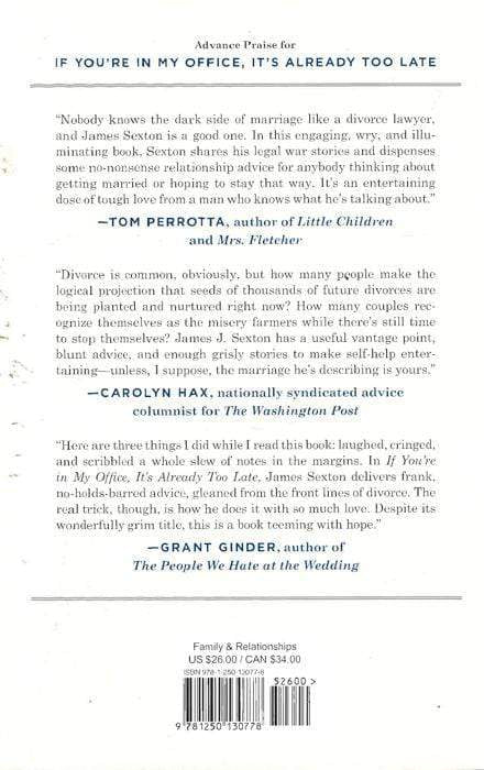 If You're in My Office, It's Already Too Late. James Sexton knows this. After dealing with more than a thousand clients whose marriages have dissolved over everything from an ill-advised threesome with the nanny to the uneven division of carpool duties, he also knows all of the what-not-to-dos for couples who want to build--and consistently work to preserve--a lasting, fulfilling relationship. Described by former clients as a "courtroom gunslinger" and "the sociopath you want on your side," Sexton tells the unvarnished truth about relationships, diving straight into the most common marital problems. These usually derive from dishonest--or nonexistent--communication. Even when the alleged reason for separation is one spouse's new "personal trainer," there's likely a communication problem that predates the fitness kick. Symptom and root cause get confused all the time.