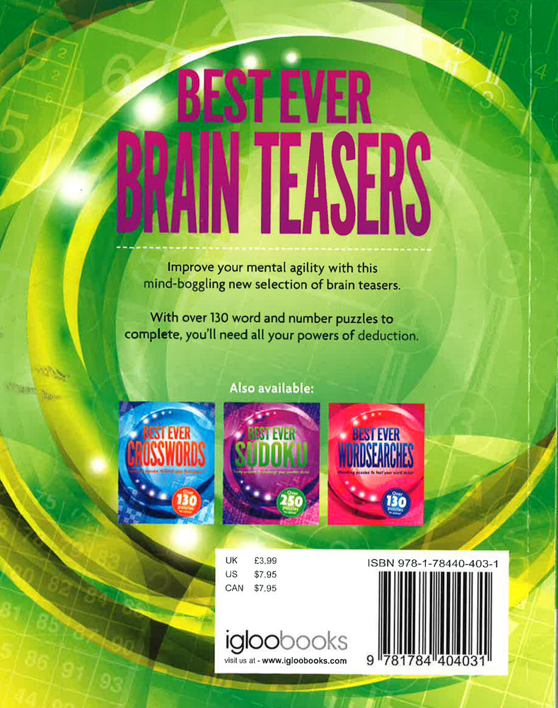 Best Ever Brain Teasers give your brain a workout with this fantastic new collection of brain-teasers. From Kriss Kross to Kakuro, there's never a dull moment! Bursting with over 130 puzzles designed to put your logic through its paces!
