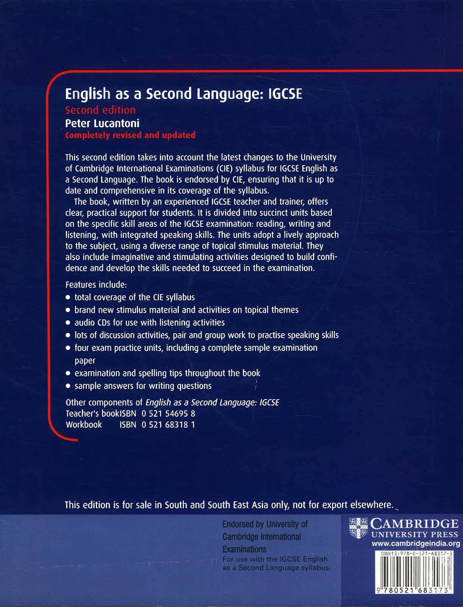 This textbook matches the requirements of the CambridgeInternational Examinations syllabus. It offers clear, practical support forteachers and students. It is divided into 20 succinct units based on thespecific skill areas of the IGCSE Examination: reading, reading and writing,writing, listening and exam practice. The units adopt a lively approach to thesubject utilising a diverse range of stimulus material.