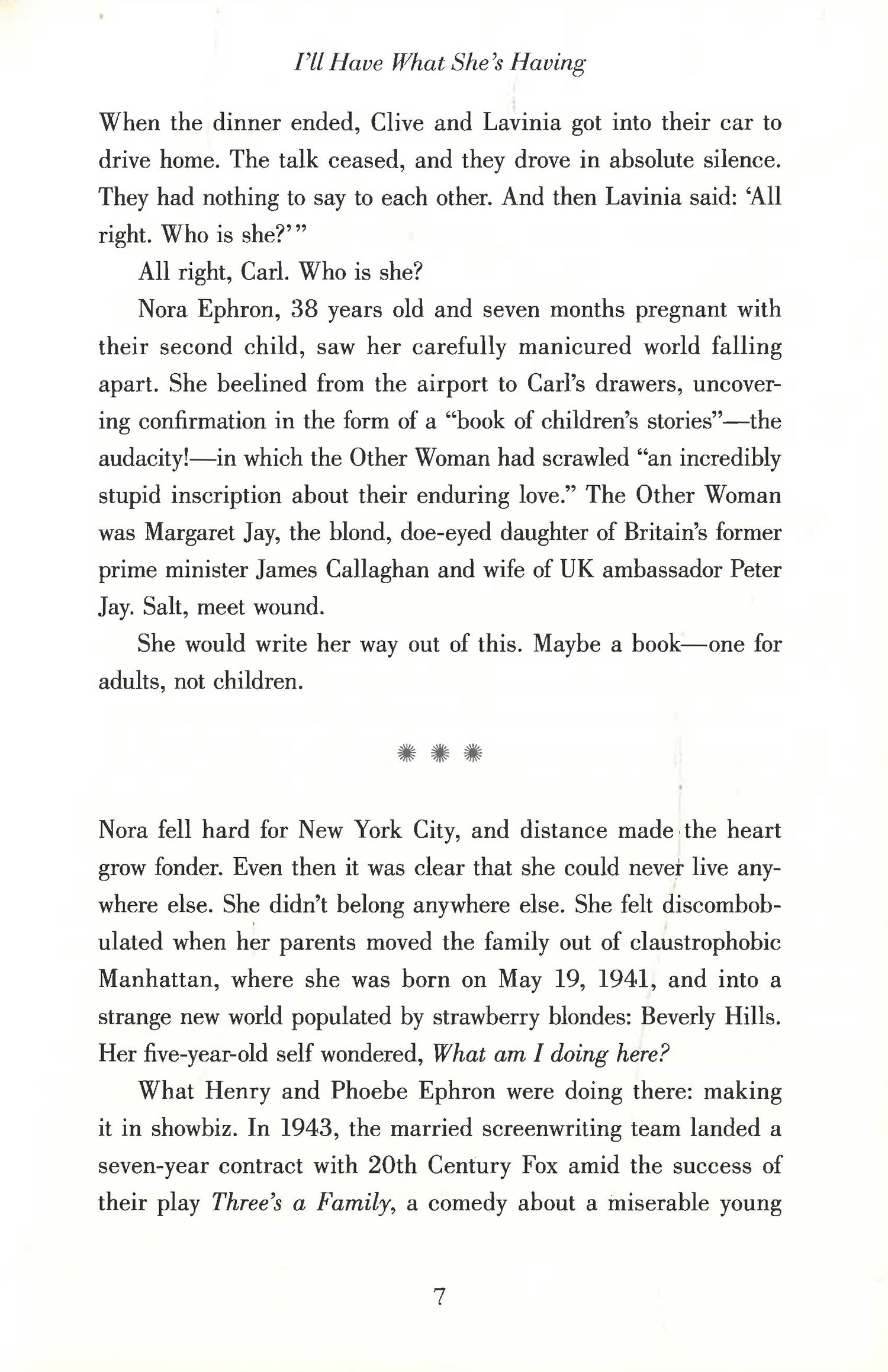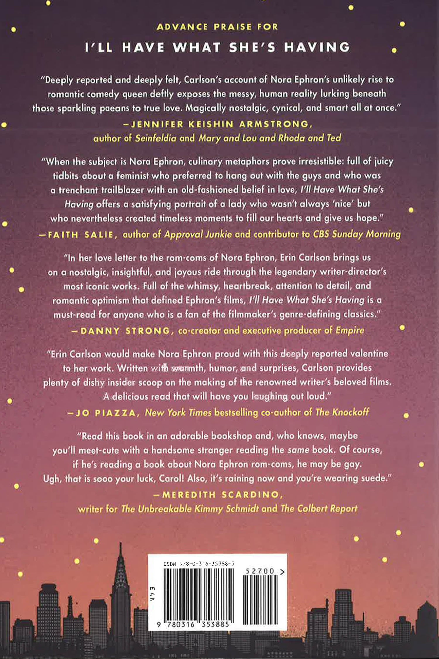 A backstage look at the making of Nora Ephron's revered trilogy--When Harry Met Sally, You've Got Mail, and Sleepless in Seattle--which brought romantic comedies back to the fore, and an intimate portrait of the beloved writer/director who inspired a generation of Hollywood women, from Mindy Kaling to Lena Dunham.In I'll Have What She's Having entertainment journalist Erin Carlson tells the story of the real Nora Ephron and how she reinvented the romcom through her trio of instant classics. With a cast of famous faces including Rob Reiner, Tom Hanks, Meg Ryan, and Billy Crystal, Carlson takes readers on a rollicking, revelatory trip to Ephron's New York City, where reality took a backseat to romance and Ephron--who always knew what she wanted and how she wanted it--ruled the set with an attention to detail that made her actors feel safe but sometimes exasperated crew members. Along the way, Carlson examines how Ephron explored in the cinema answers to the questions that plagued her own romantic life and how she regained faith in love after one broken engagement and two failed marriages. Carlson also explores countless other questions Ephron's fans have wondered about: What sparked Reiner to snap out of his bachelor blues during the making of When Harry Met Sally? Why was Ryan, a gifted comedian trapped in the body of a fairytale princess, not the first choice for the role? After she and Hanks each separately balked at playing Mail's Kathleen Kelly and Sleepless' Sam Baldwin, what changed their minds? And perhaps most importantly: What was Dave Chappelle doing ... in a turtleneck? An intimate portrait of a one of America's most iconic filmmakers and a look behind the scenes of her crowning achievements, I'll Have What She's Having is a vivid account of the days and nights when Ephron, along with assorted cynical collaborators, learned to show her heart on the screen.
