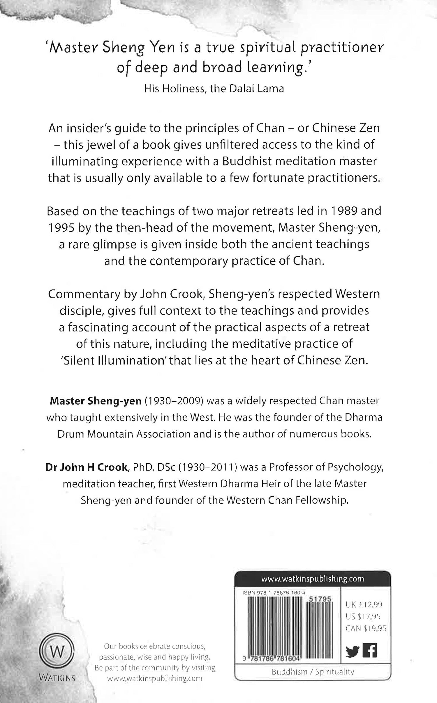 An insider's guide to the principles of Chan – or Chinese Zen – this book gives unfiltered access to the kind of illuminating experience with a Zen Master that is usually only available to a few fortunate practitioners.Having originated in China in the 6th century, Chan Buddhism is now growing rapidly in popularity, much of which can be attributed to its open, accepting attitude and its focus on a choice of meditative practices to best suit each individual. With the bulk of the text made up of edited transcripts of the teachings at two major retreats led in Wales in 1989 and 1995 by the then-head of the movement, Master Sheng Yen, this jewel of a book offers a rare glimpse inside both the ancient teachings and the contemporary practice of Chan.Commentary by Sheng Yen's much respected Western disciple John Crook gives full context to the teachings and provides a fascinating account of the practical aspects of a retreat of this nature, including the meditative practices of watching the breath, counting the breath and of 'Silent Illumination' that lies at the heart of Chinese Zen. In so doing the atmosphere of such a retreat is powerfully evoked, especially when Crook recounts the experiences and impacts of his own years of practice.