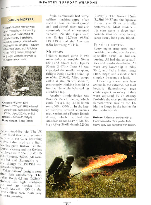 This is a comprehensive directory of the military weapons used in World War Two, from field artillery and tanks to torpedo boats and night fighters, with more than 180 photographs. It covers all the main weaponry of the Allies and the opposing military alliance, with specification boxes providing information on each technology. It is a visual guide to the technologies used during World War Two, illustrated throughout with compelling photographs taken during the conflict. It is divided into three sections on the Army, Air Force and Navy. It describes all the most effective weapons of war, from escort carriers and heavy cruisers to rockets and the atom bomb. It features at-a-glance statistics for every weapon, such as crew, rate of fire, weight, length, height, muzzle velocity, speed, range, engine and armament. This comprehensive book brings together all the main weapons and technologies that were used during the war. The weapons are grouped chronologically and divided into three sections. The first, Army Weapons, features weapons used by the armies, such as Assault Guns, Heavy Mortars and V-Weapons. This is followed by Air Force Weapons, which includes Night Fighters, Fighters and Jet Aircraft, and finally Naval Weapons, featuring Heavy Cruisers, Torpedo Boats and Midget Submarines. A brief history describes when and how each was used, the successes and failures, and lists the key specifications. This magnificent guide to the weapons used during World War Two is illustrated with more than 180 evocative photographs taken during the war, and is a fascinating reference book ideal for both general and specialist readers.