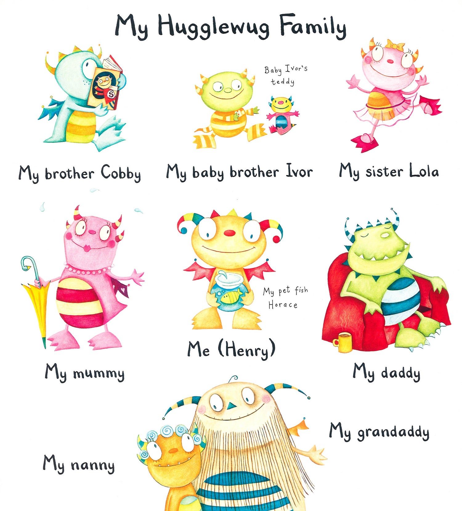 Meet the Hugglewugs, a brand-new family. Follow them as they go about their everyday lives - singing, eating, going to school, running, sliding, skipping and, of course, hugging! This title offers an introduction to first words and counting for the very young, and features illustrations that bring these characters to life.