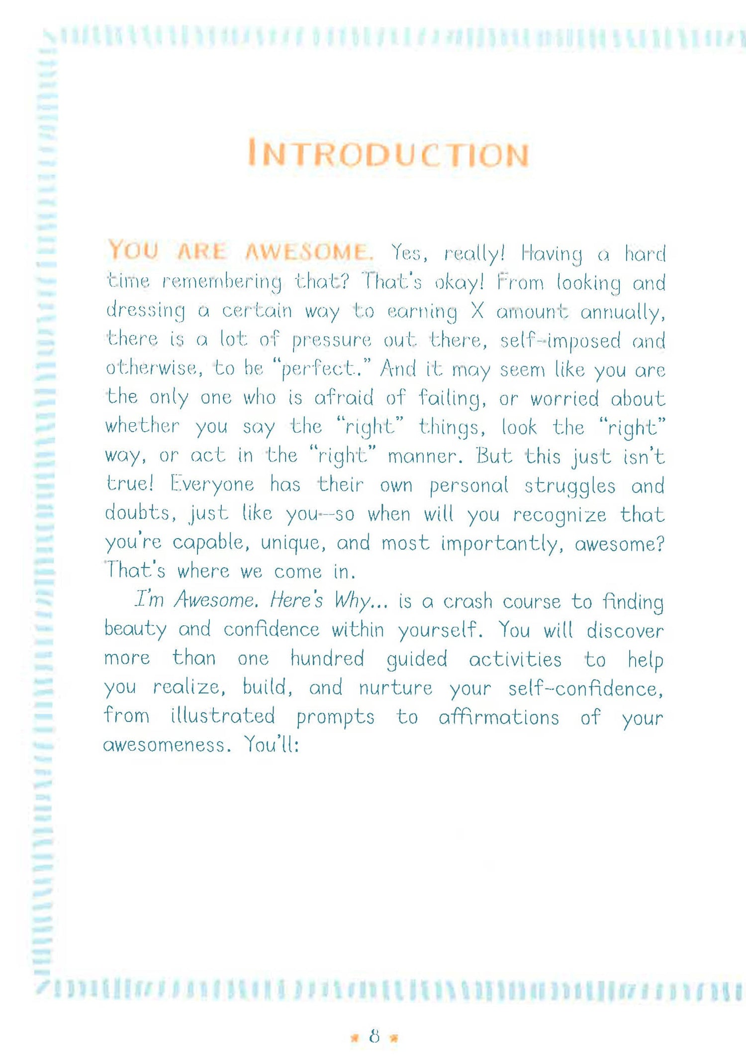 With prompts, exercises, lists, and activities, I'm Awesome: Here's Why will help remind you of all the reasons why you are unique, cool-and yes, awesome. Through fun prompts and writing exercises like listing ten things you're proud of, drawing your idea of the perfect Friday night, creating your own personal affirmations to read out loud, and delivering an acceptance speech for an award of your choice, you'll learn to celebrate what makes you, you.