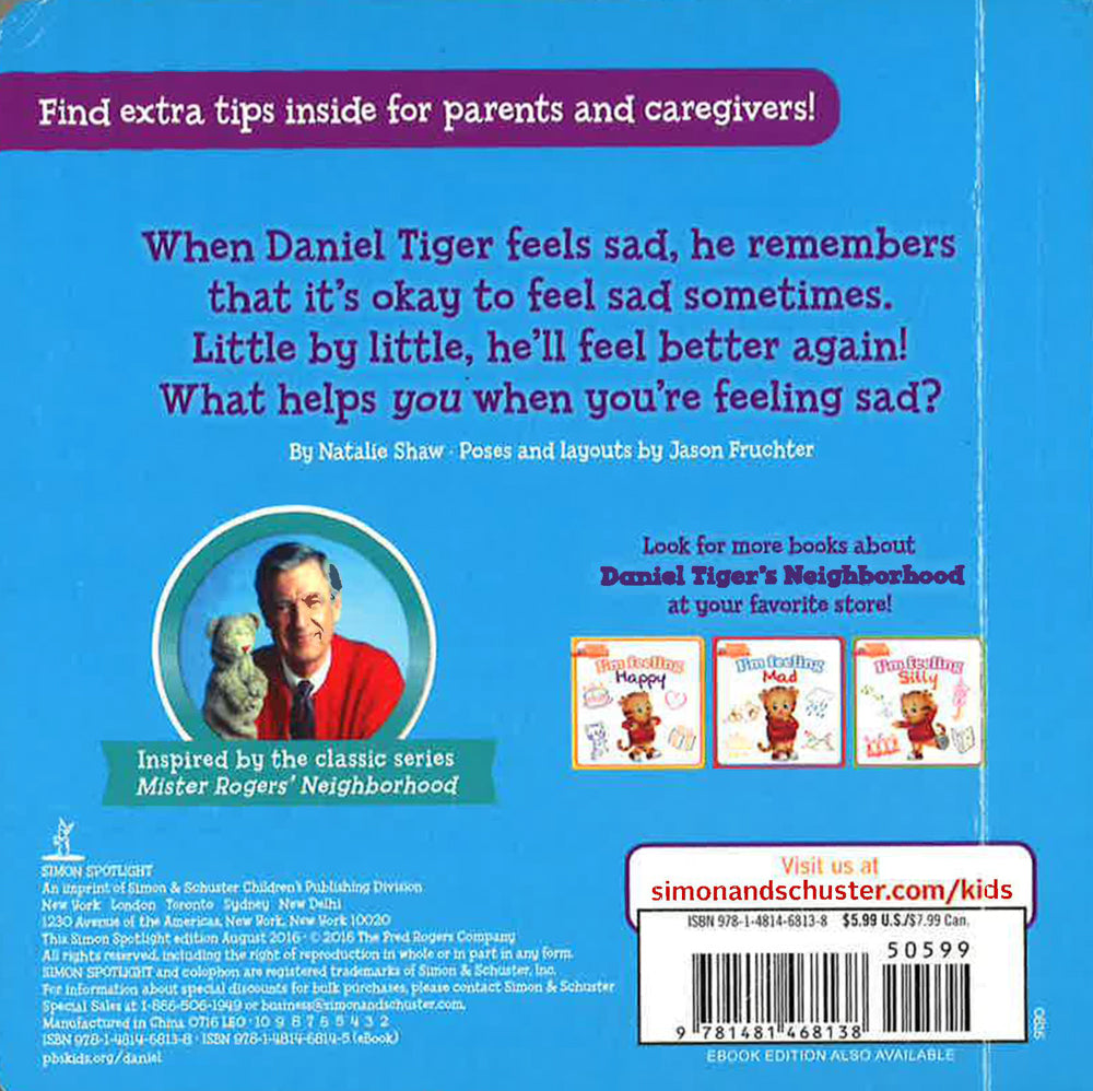 A new generation of children love Daniel Tiger's Neighborhood, inspired by the classic series Mister Rogers' Neighborhood! What makes Daniel Tiger feel sad? Find out in this chunky board book that's part of a new Daniel Tiger's Neighborhood feelings subseries. It's okay to feel sad sometimes, little by little, you'll feel better again. Everyone feels sad sometimes, even Daniel Tiger. When he feels sad, he remembers that it's okay to feel that way. Soon, he'll feel better! Come along with Daniel as he and his friends learn how to deal with their feelings. This adorable book includes tips for parents and caregivers to help guide little ones through their emotions. Look for the companion titles, I'm Feeling Mad, I'm Feeling Happy, and I'm Feeling Silly! (c) 2016 The Fred Rogers Company.