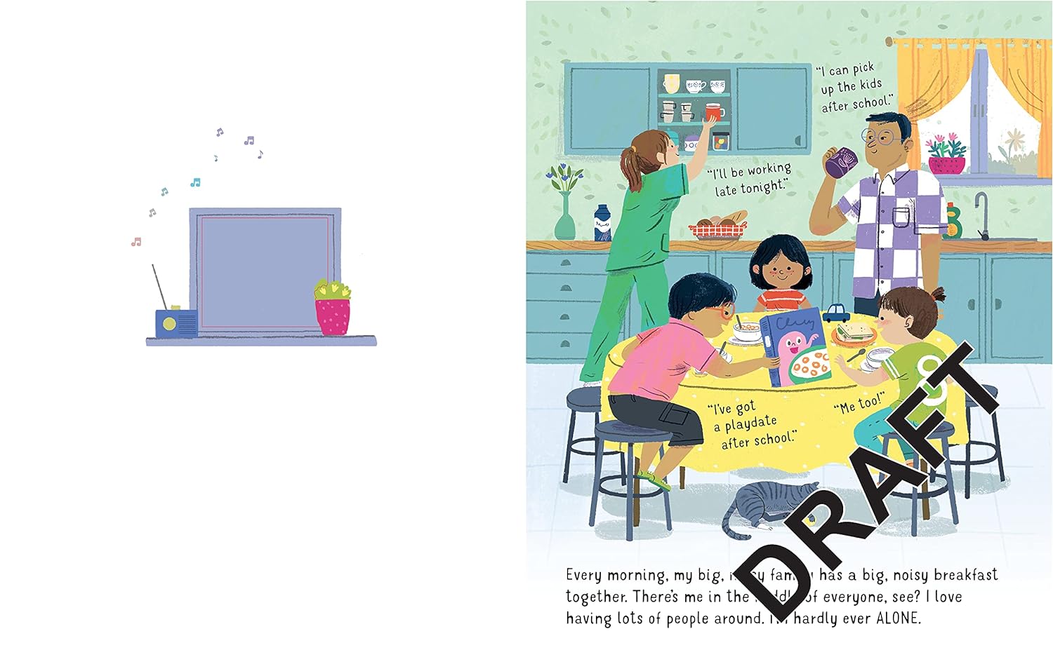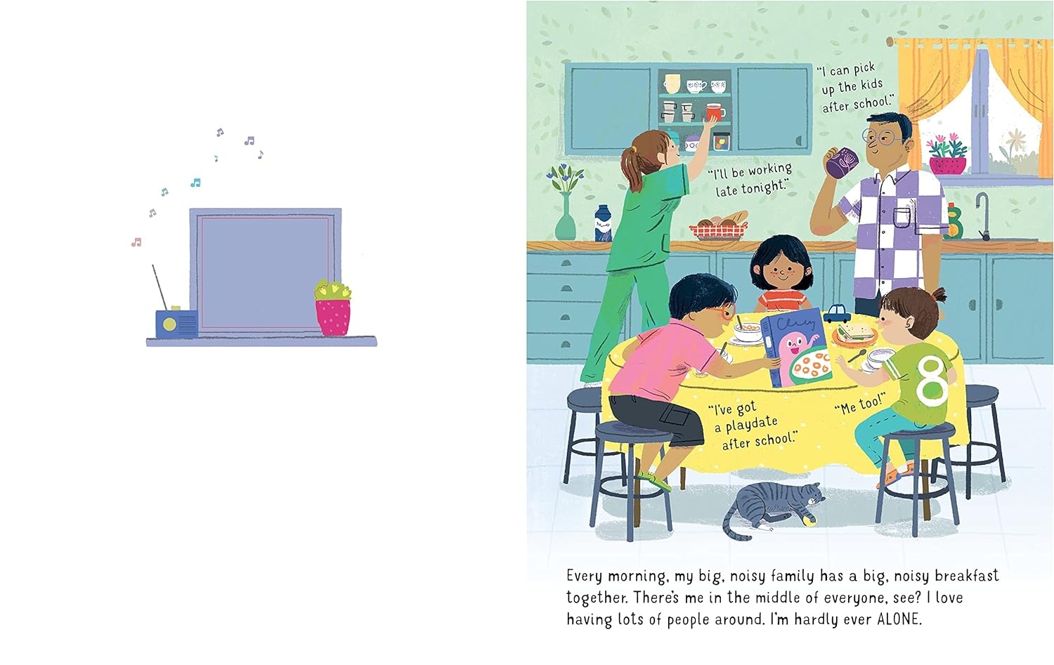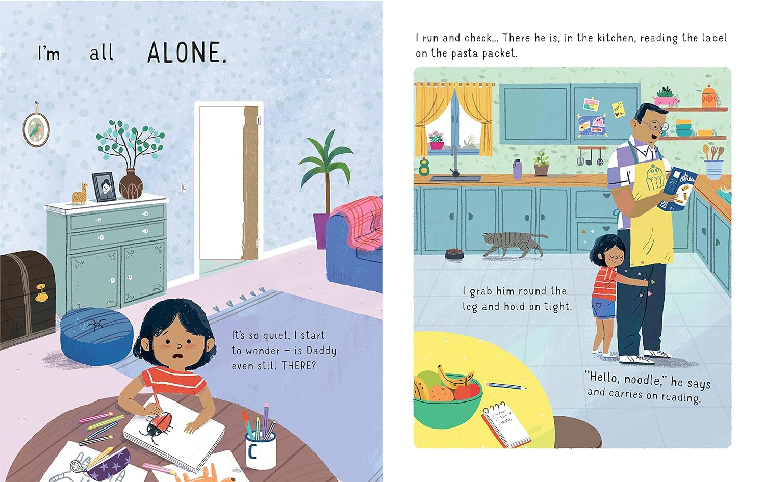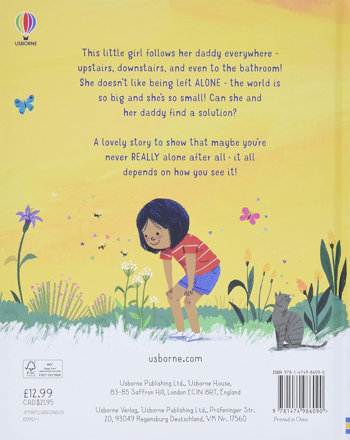 A little girl doesn't like being left alone in a room in her house, even though her daddy is just in the next room. Told from the little girl's perspective, the story explores a worry common to young children in a gentle, humorous way, coming to a lovely, comforting conclusion that might help allay any similar fears a reader may have. Beautiful laser cut holes emphasise her feeling of being alone and her feeling of connectedness to her father throughout the book. Gorgeous, characterful illustrations bring the little girl and her family warmly to life.