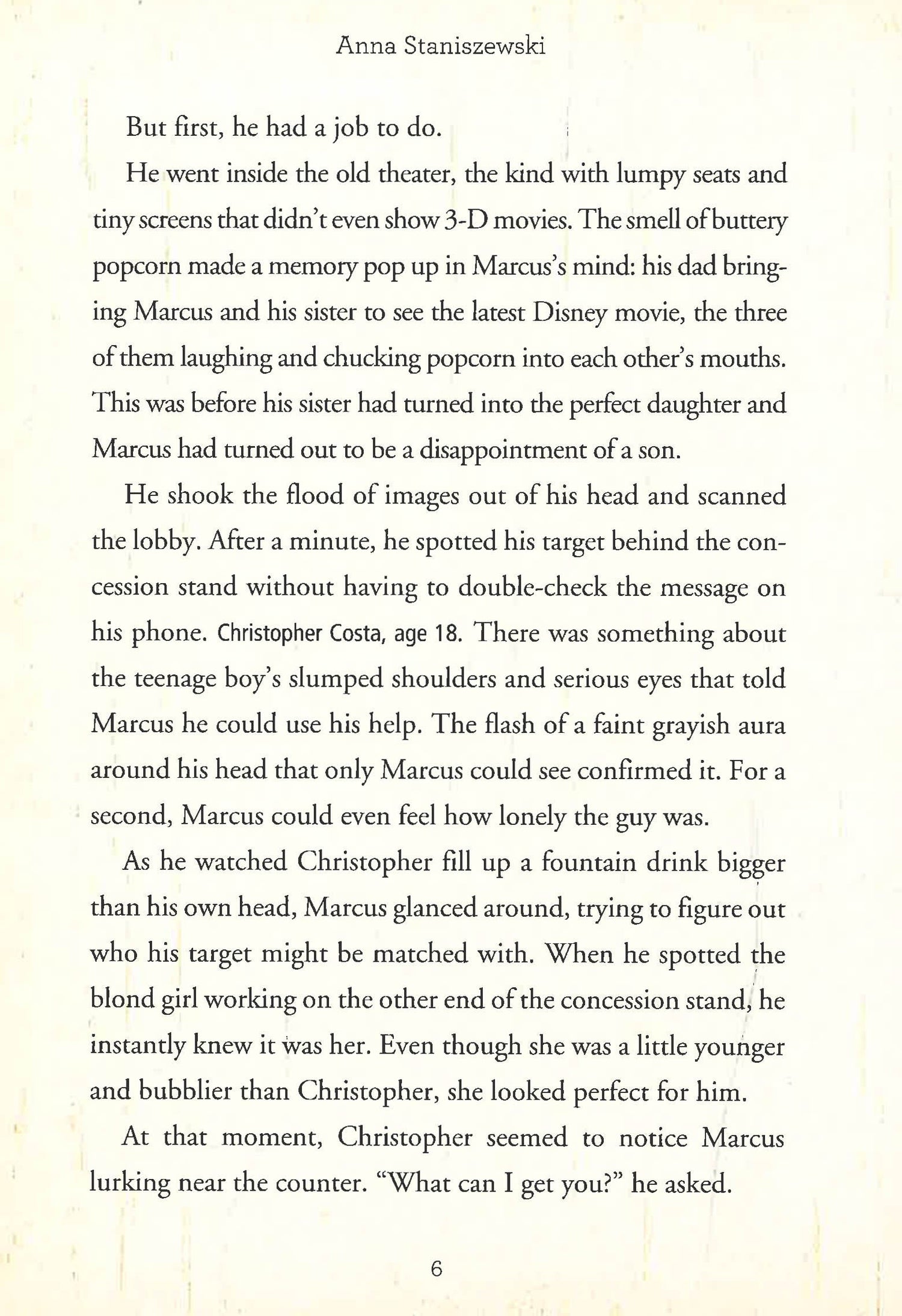 Marcus is a Cupid. Lena is a Reaper. Opposites attract in the exciting new Switched At First Kiss series by the acclaimed author of The Dirt Diary. Dared to kiss the adorkable Marcus Torelli at a party, Lena thinks it's the perfect opportunity to cross First Kiss off her list of "Things to Accomplish Before I Turn Fourteen." It's only when she gets sent on an assignment the next day she realizes something went horribly wrong. That ZING she felt wasn't the thrill of her first kiss--she and Marcus have swapped powers! Lena is not your average eighth grader, she's a soul collector with an serious job to do. And Marcus turns out to be a supernatural matchmaker (like cupid, but without the diaper). Now logical Lena finds herself with the love touch, and sweet, sentimental Marcus has death at his fingertips. The truth is that Lena should never have taken that dare...because one little kiss has Lena and Marcus in a whole lotta trouble.