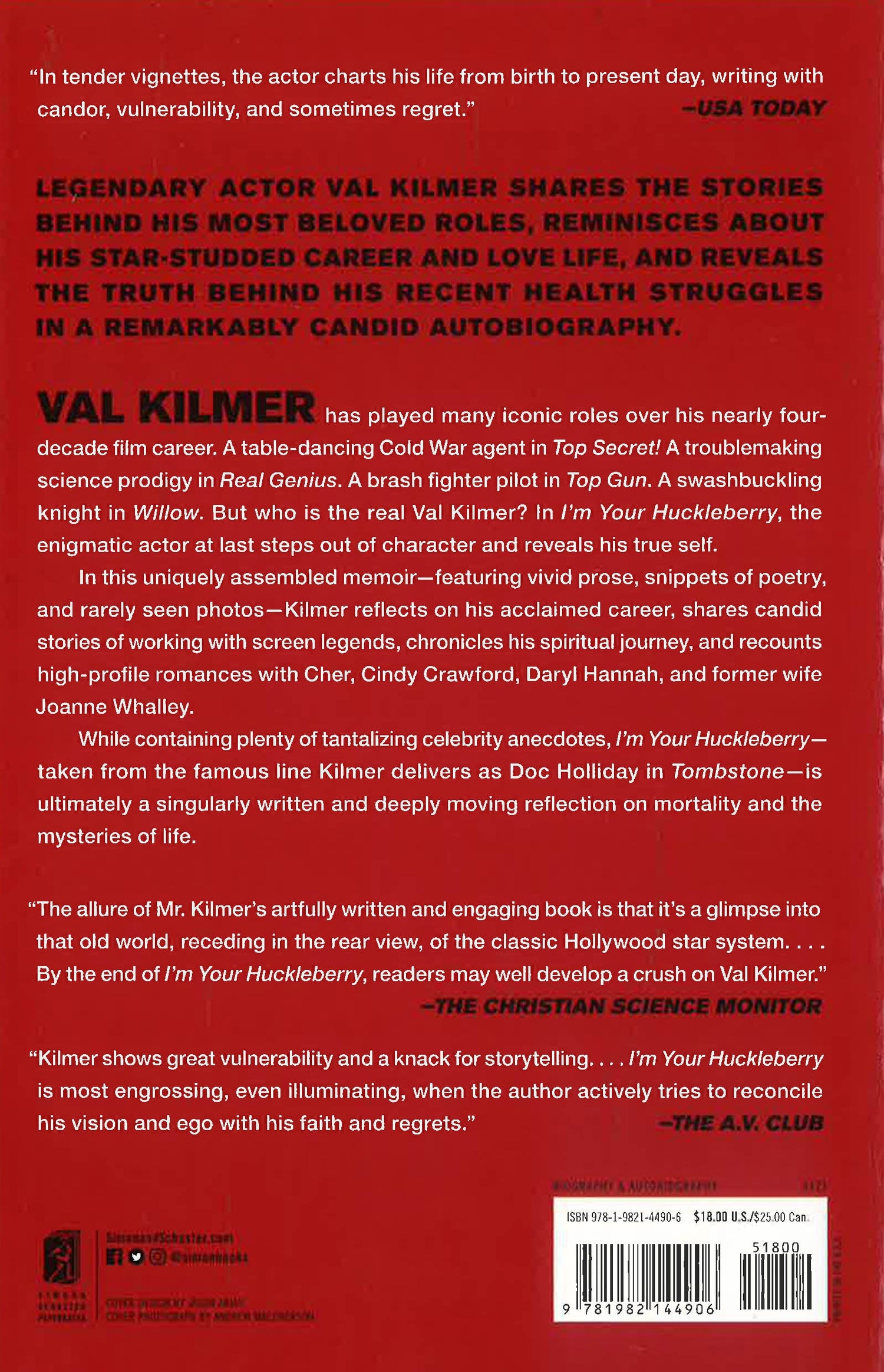 In this uniquely assembled memoir—featuring vivid prose, snippets of poetry and rarely-seen photos—Kilmer reflects on his acclaimed career, including becoming the youngest actor ever admitted to the Juilliard School’s famed drama department, determinedly campaigning to win the lead part in The Doors, and realizing a years-long dream of performing a one-man show as his hero Mark Twain. He shares candid stories of working with screen legends Marlon Brando, Tom Cruise, Robert Downey Jr. and Robert De Niro, and recounts high-profile romances with Cher, Cindy Crawford, Daryl Hannah, and former wife Joanne Whalley. He chronicles his spiritual journey and lifelong belief in Christian Science, and describes travels to far-flung locales such as a scarcely inhabited island in the Indian Ocean where he suffered from delirium and was cared for by the resident tribe. And he reveals details of his recent throat cancer diagnosis and recovery—about which he has disclosed little until now.