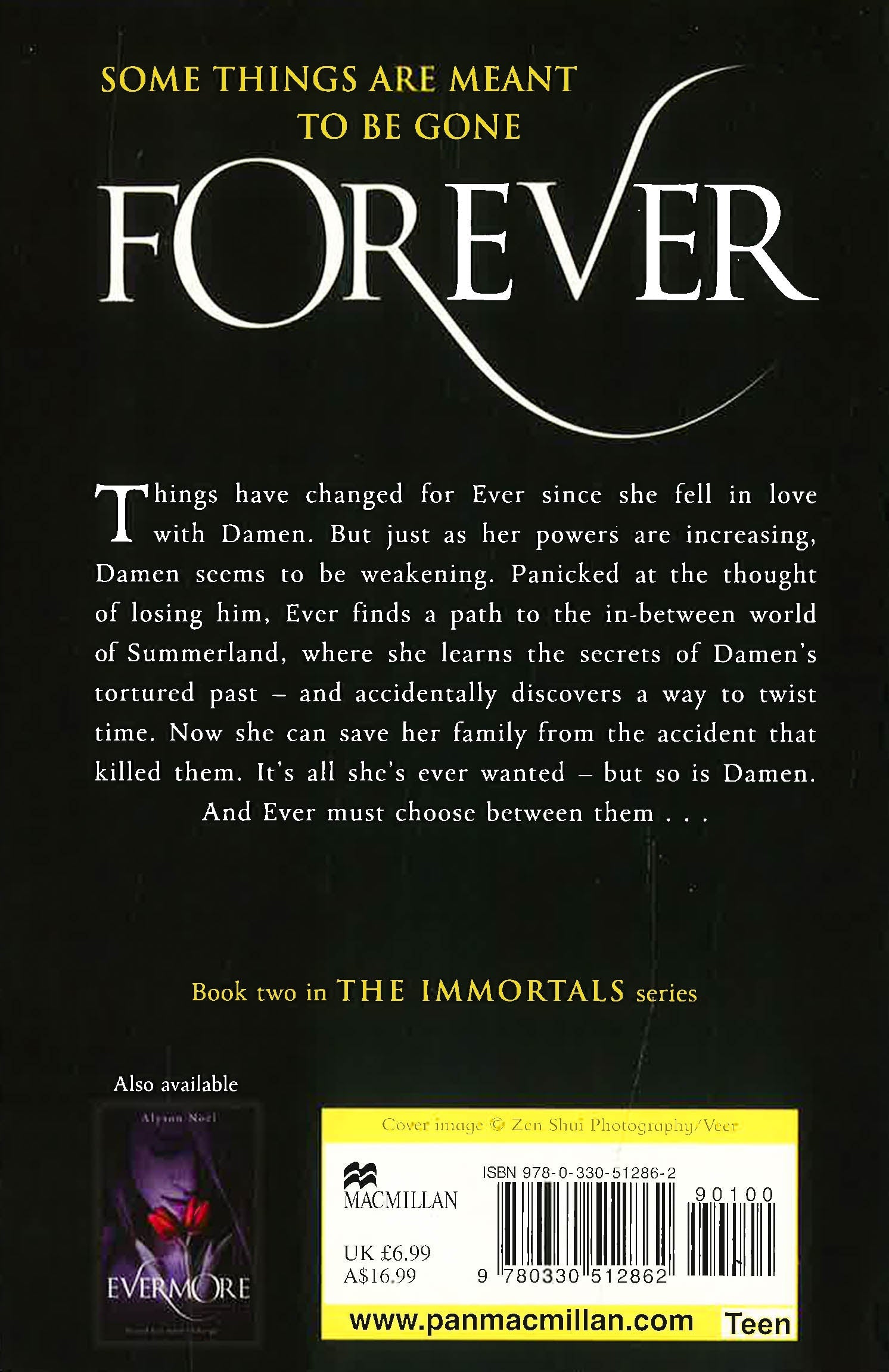 Things have changed for Ever since she met her beloved Damen – not least because she’s got a whole new set of powers, courtesy of her new Immortal status. Just as she's getting stronger, though, Damen seems to be weakening. Panicked at the thought of losing him, Ever finds a path to the in-between world known as Summerland, where she learns the secrets of Damen’s tortured past. But in searching for a cure for him, Ever accidentally discovers a way to twist time so she can save her family from the accident that killed them. It’s all she’s ever wanted – but so is Damen. And Ever must choose between them . . .