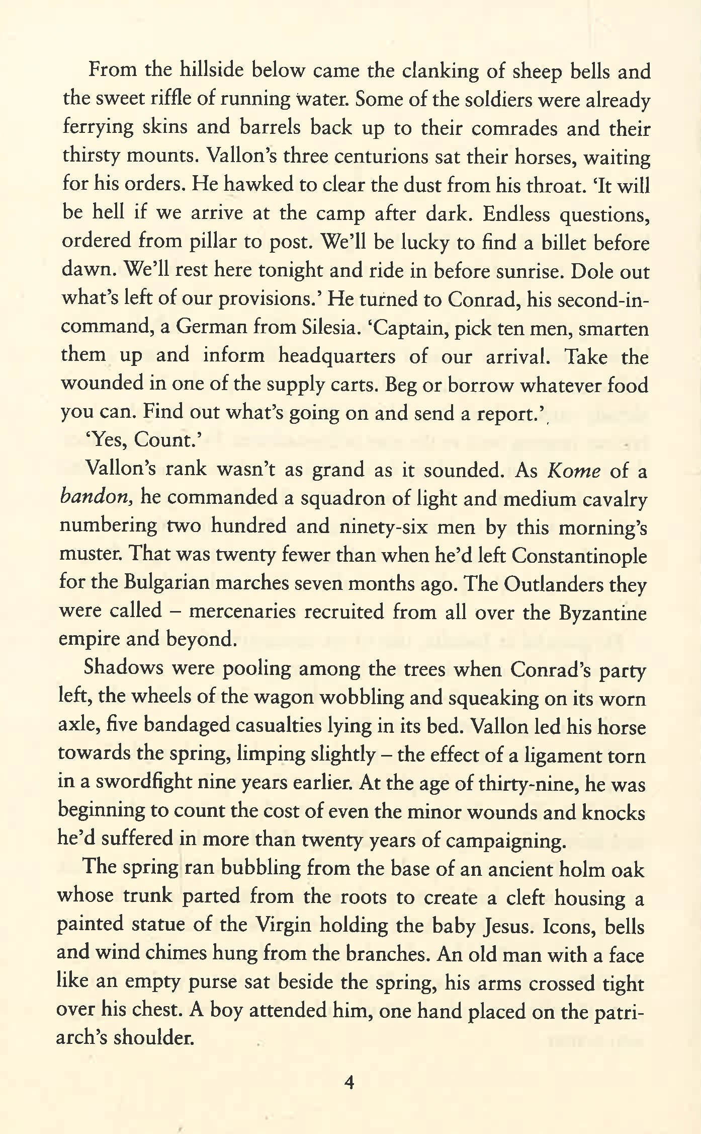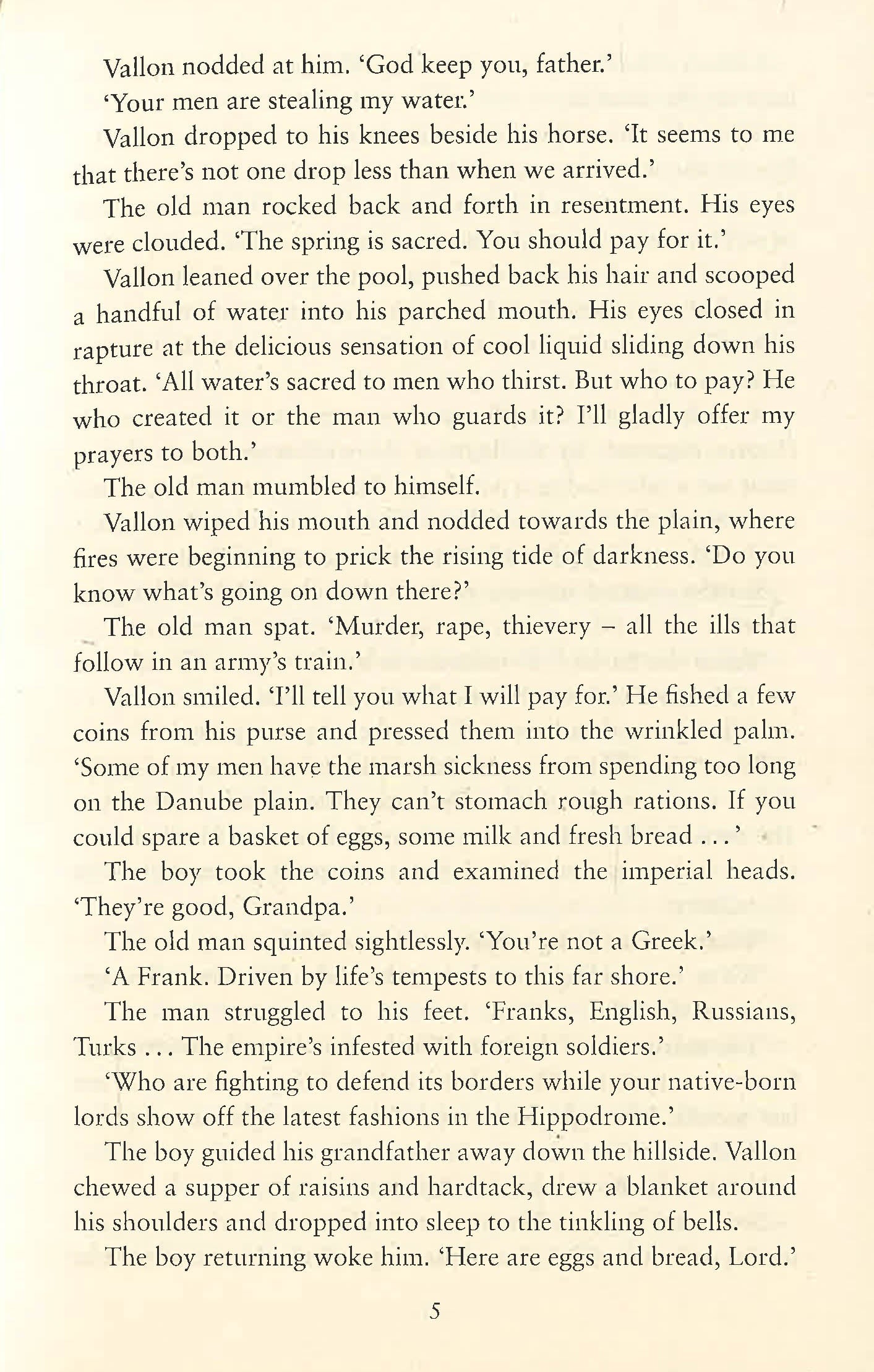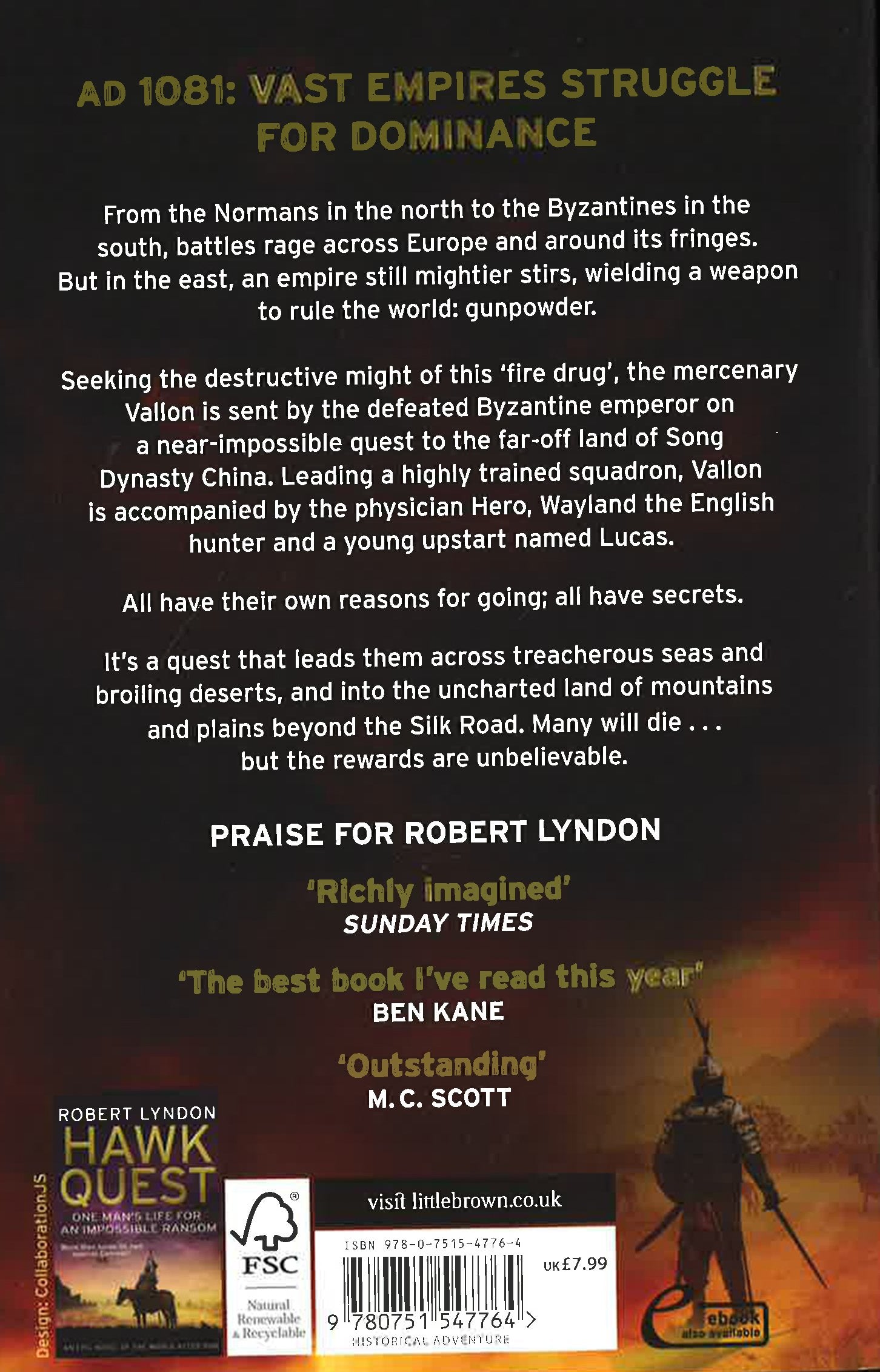 Seeking the destructive might of this 'fire drug', the mercenary Vallon is sent by the defeated Byzantine emperor on a near-impossible quest to the far-off land of Song Dynasty China. Leading a highly trained squadron, Vallon is accompanied by the physician Hero, Wayland the English hunter, and a young upstart named Lucas.