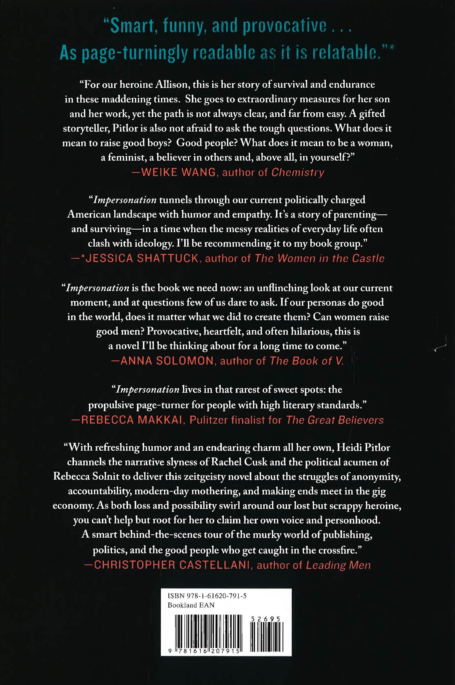 "By turns revealing, hilarious, dishy, and razor-sharp, Impersonation lives in that rarest of sweet spots: the propulsive page-turner for people with high literary standards." --Rebecca Makkai, author of The Great Believers TOGETHER, THEY MAKE THE PERFECT FEMINIST MOTHER Allie Lang is a professional ghostwriter and a perpetually broke single mother to a young boy. Years of navigating her own and America's cultural definition of motherhood have left her a lapsed idealist. Lana Breban is a high-profile lawyer, economist, and advocate for women's rights with designs on elected office. She also has a son. Lana and her staff have decided she needs help softening her image in the eyes of the public and that a memoir about her life as a mother will help. Allie struggles to write Lana's book as obstacles pile up: not enough childcare, looming deadlines, an unresponsive subject, an ill-defined romantic relationship on the verge of slipping away. Eventually, Lana comes to require far too much of Allie and even her son. Allie's ability to stand up for herself and ask for all that she deserves will ultimately determine the power that she can wield over her own life. With the satirical eye of Tom Perrotta's Mrs. Fletcher and the incisiveness of Meg Wolitzer's The Female Persuasion, acclaimed writer Heidi Pitlor tells a timely, bitingly funny, and insightful story of ambition, motherhood, and class.