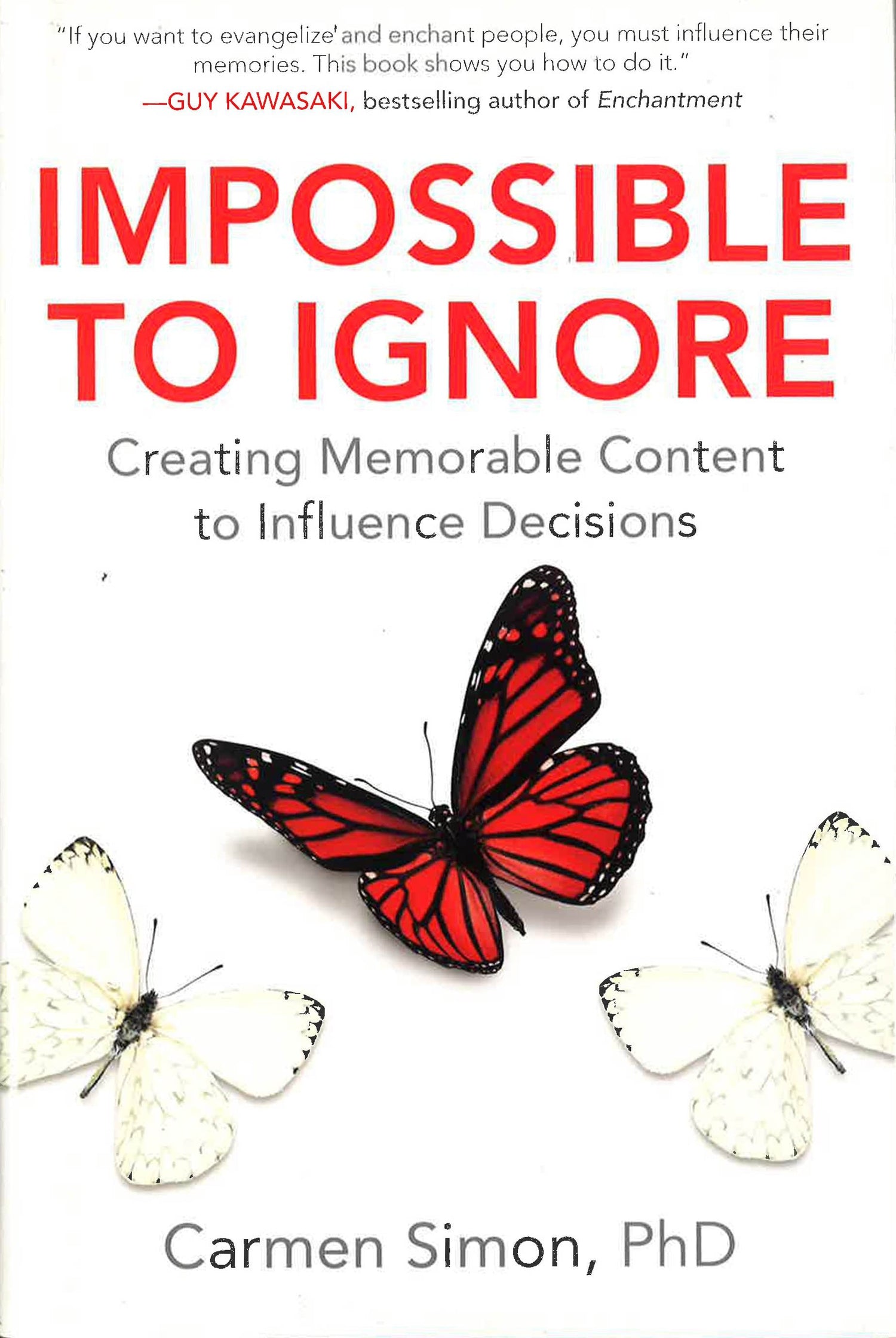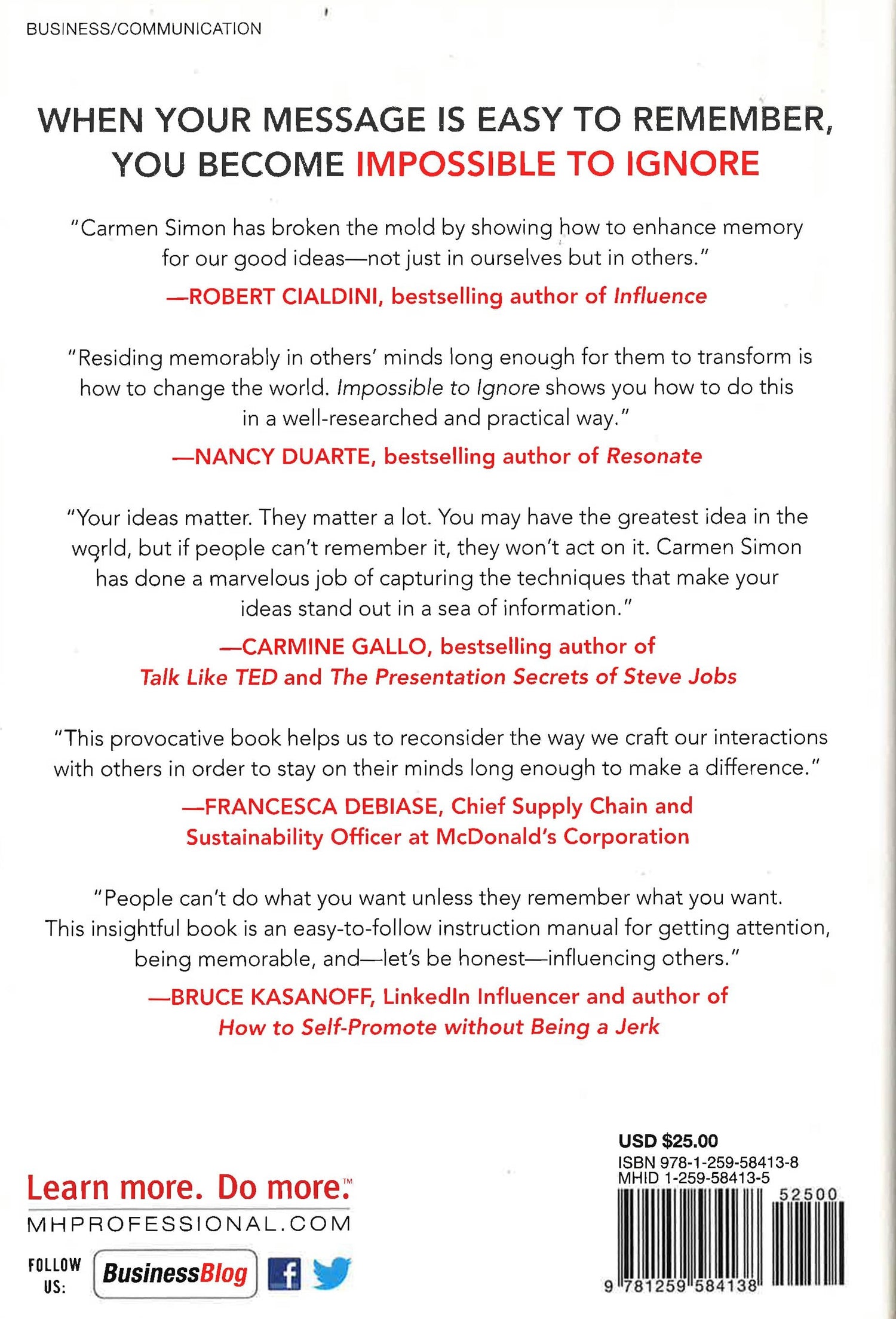A groundbreaking approach to creating memorable messages that are easy to process, hard to forget, and impossible to ignore using the latest in brain science Audiences forget up to 90% of what you communicate. How can your employees and customers decide to act on your message if they only remember a tenth of it? How do you know which tenth they'll remember? How will you stay on their minds long enough to spark the action you need? Many experts have offered techniques on how to improve your own memory, but not how to influence other people's memory-and impact their decisions. Drawing on the latest research in neuroscience and cognitive psychology, Carmen Simon, PhD, reveals how to avoid the hazards of random recall and deliver just the right amount of content. No more redundant meetings, rambling e-mails, or anemic presentations. In Impossible to Ignore, she shows you how to execute a proven three-step plan for persuasion: 1. Create cues that attract attention and connect with your audience's needs 2. Use memory-influencing variables to control what your audience remembers 3. Turn today's intentions into tomorrow's actions This practical guide is filled with case studies, examples, and a checklist to help you put the power of cognitive science to work for your business. Whether you're giving a presentation, conducting a meeting, delivering training, making a sales pitch, or creating a marketing campaign, these field-tested techniques will help you develop content that speaks to people's hearts, stays in their heads, and influences their decisions. It's not just memorable-it's Impossible to Ignore.