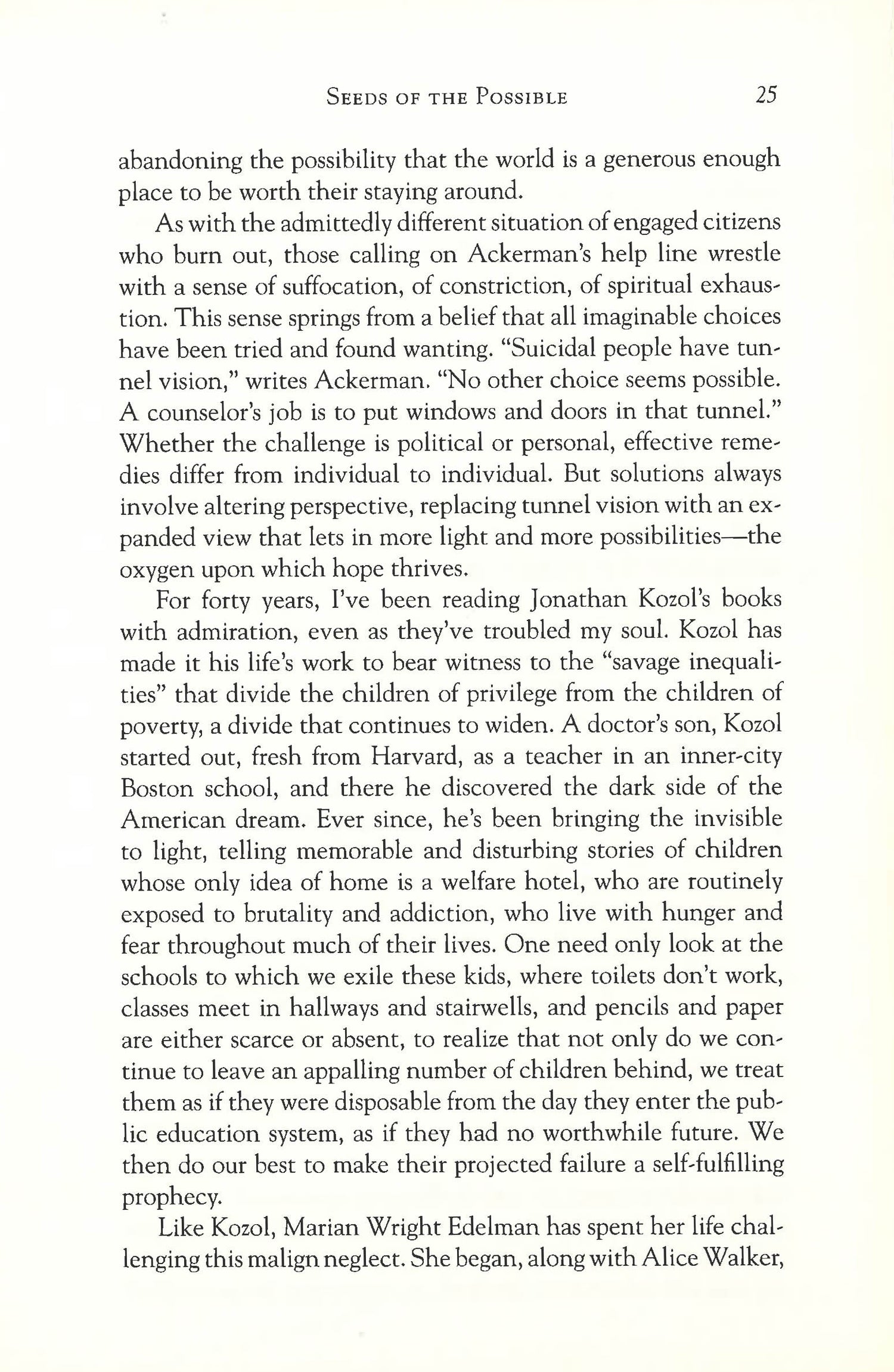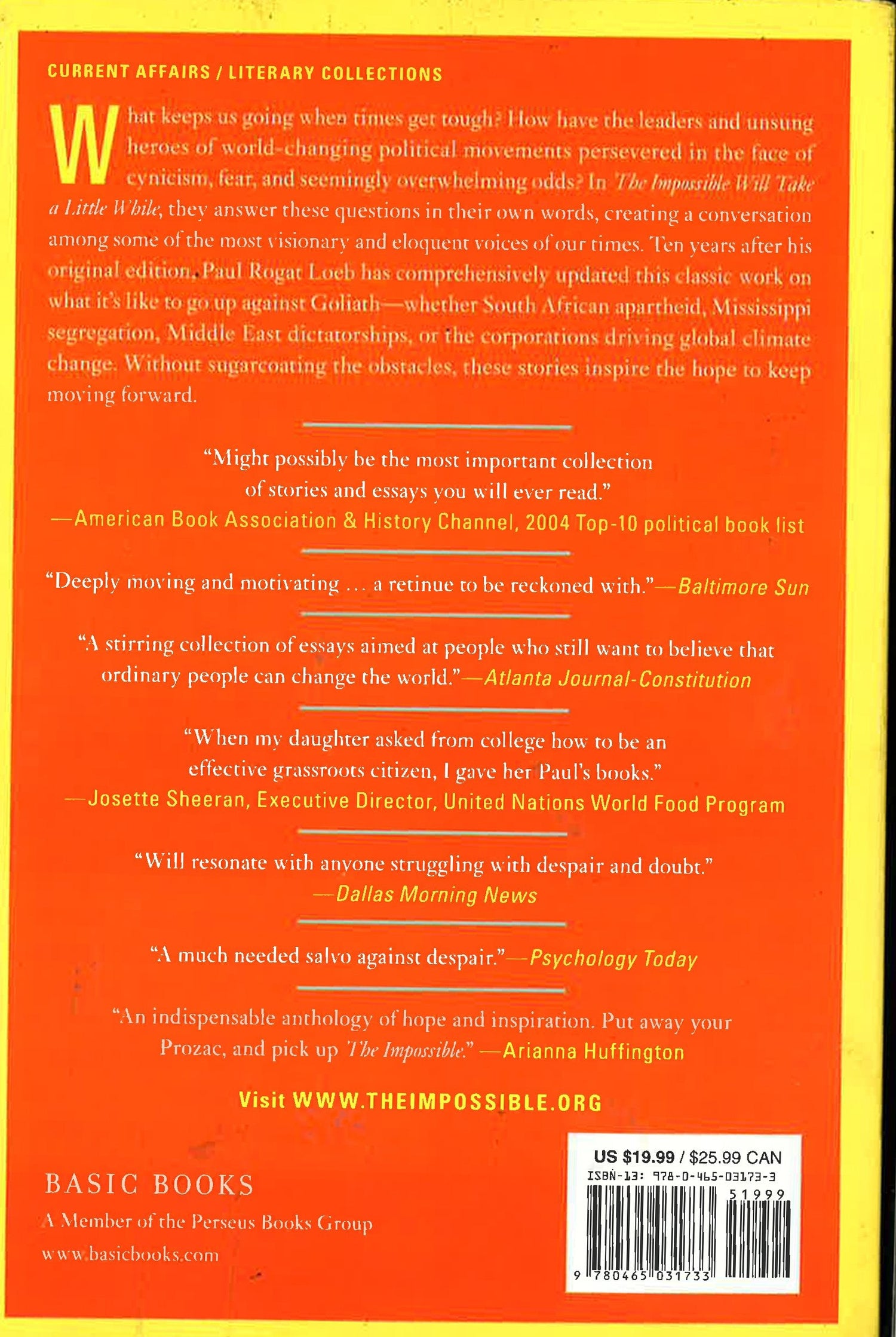 More relevant than ever, this seminal collection of essays encourages us to believe in the power of ordinary citizens to change the world.In today's turbulent world it's hard not to feel like we're going backwards; after decades of striving, justice and equality still seem like far off goals. What keeps us going when times get tough? How have the leaders and unsung heroes of world-changing political movements persevered in the face of cynicism, fear, and seemingly overwhelming odds? In The Impossible Will Take a Little While, they answer these questions in their own words, creating a conversation among some of the most visionary and eloquent voices of our times. Today, more than ever, we need their words and their wisdom. In this revised edition, Paul Rogat Loeb has comprehensively updated this classic work on what it's like to go up against Goliath--whether South African apartheid, Mississippi segregation, Middle East dictatorships, or the corporations driving global climate change. Without sugarcoating the obstacles, these stories inspire hope to keep moving forward. Think of this book as a conversation among some of the most visionary and eloquent voices of our times--or any time: Contributors include Maya Angelou, Diane Ackerman, Marian Wright Edelman, Wael Ghonim, Václav Havel, Paul Hawken, Seamus Heaney, Jonathan Kozol, Tony Kushner, Audre Lorde, Nelson Mandela, Bill McKibben, Bill Moyers, Pablo Neruda, Mary Pipher, Arundhati Roy, Dan Savage, Desmond Tutu, Alice Walker, Cornel West, Terry Tempest Williams, and Howard Zinn.