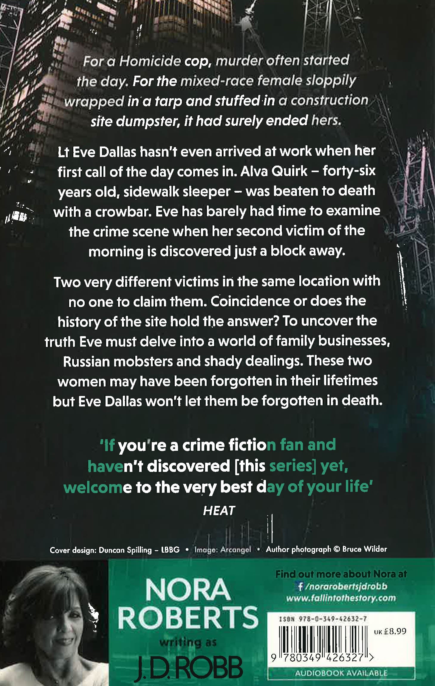 Two very different victims in the same location with no-one to claim them. Coincidence or does the history of the site hold the answer? To uncover the truth Eve must delve into a world of family businesses, Russian mobsters and shady dealings. These two women may have been forgotten in their lifetimes but Eve Dallas won't let them be forgotten in death