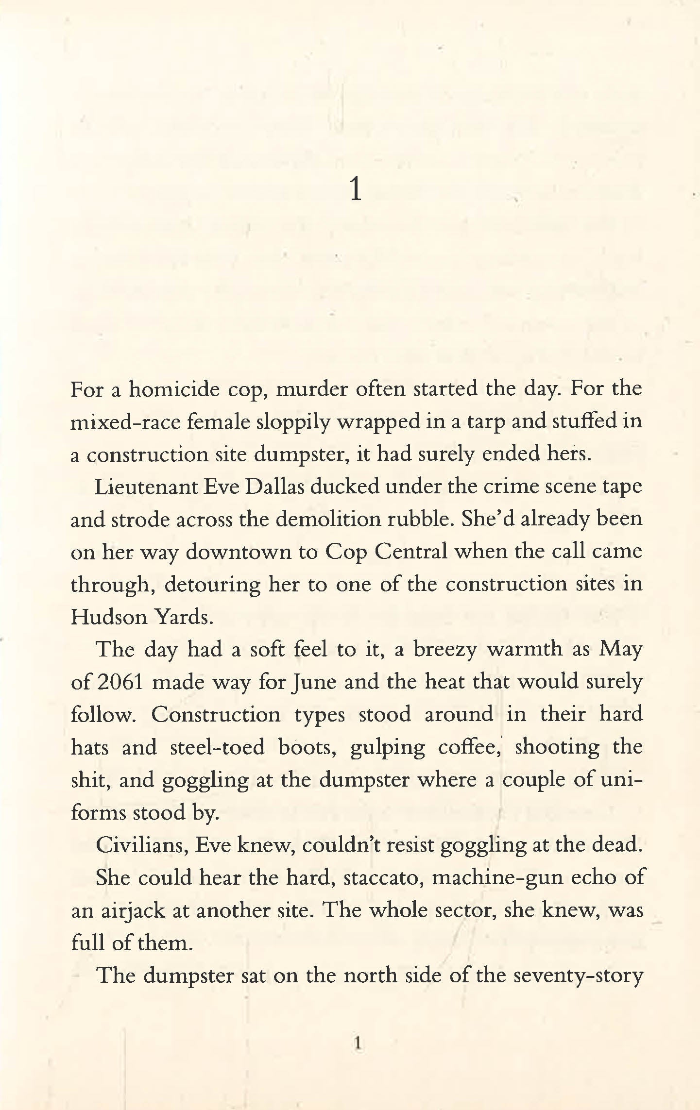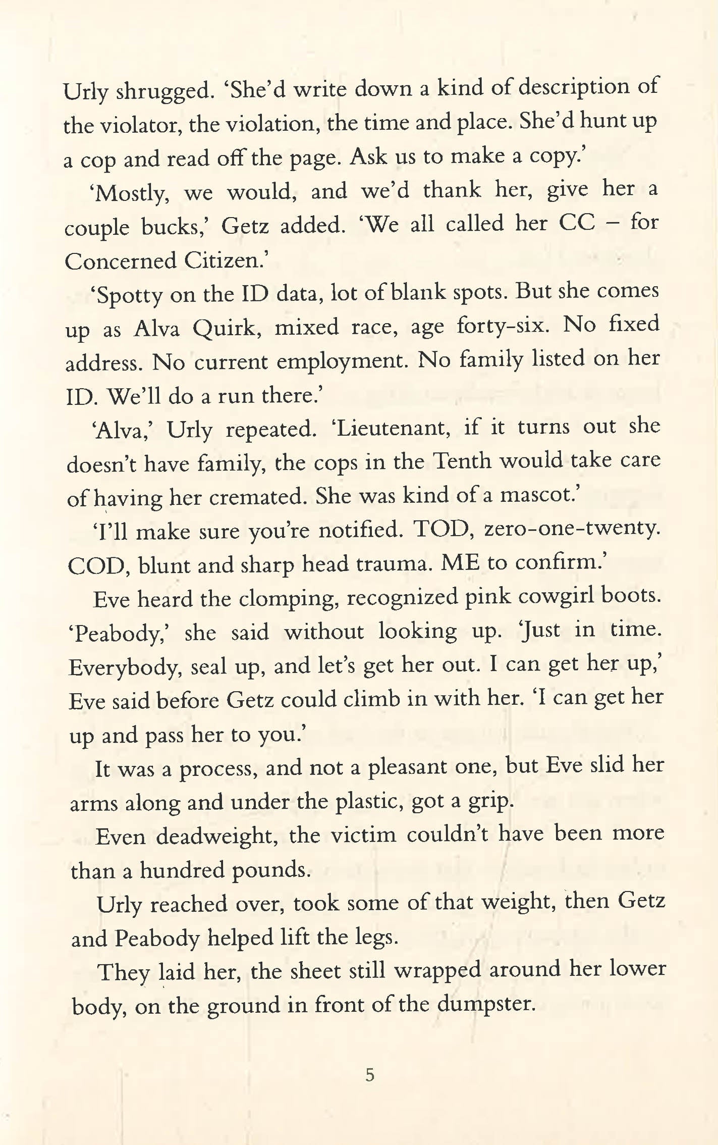 Lt. Eve Dallas hasn't even arrived at work when her first call of the day comes in. Alva Quirk - forty-six years old, sidewalk sleeper - was beaten to death with a crowbar. Known to the local cops for handing out origami flowers to anyone who gives her change, Alva was well-liked but with no fixed address, no job and no family, there's noone to remember her.