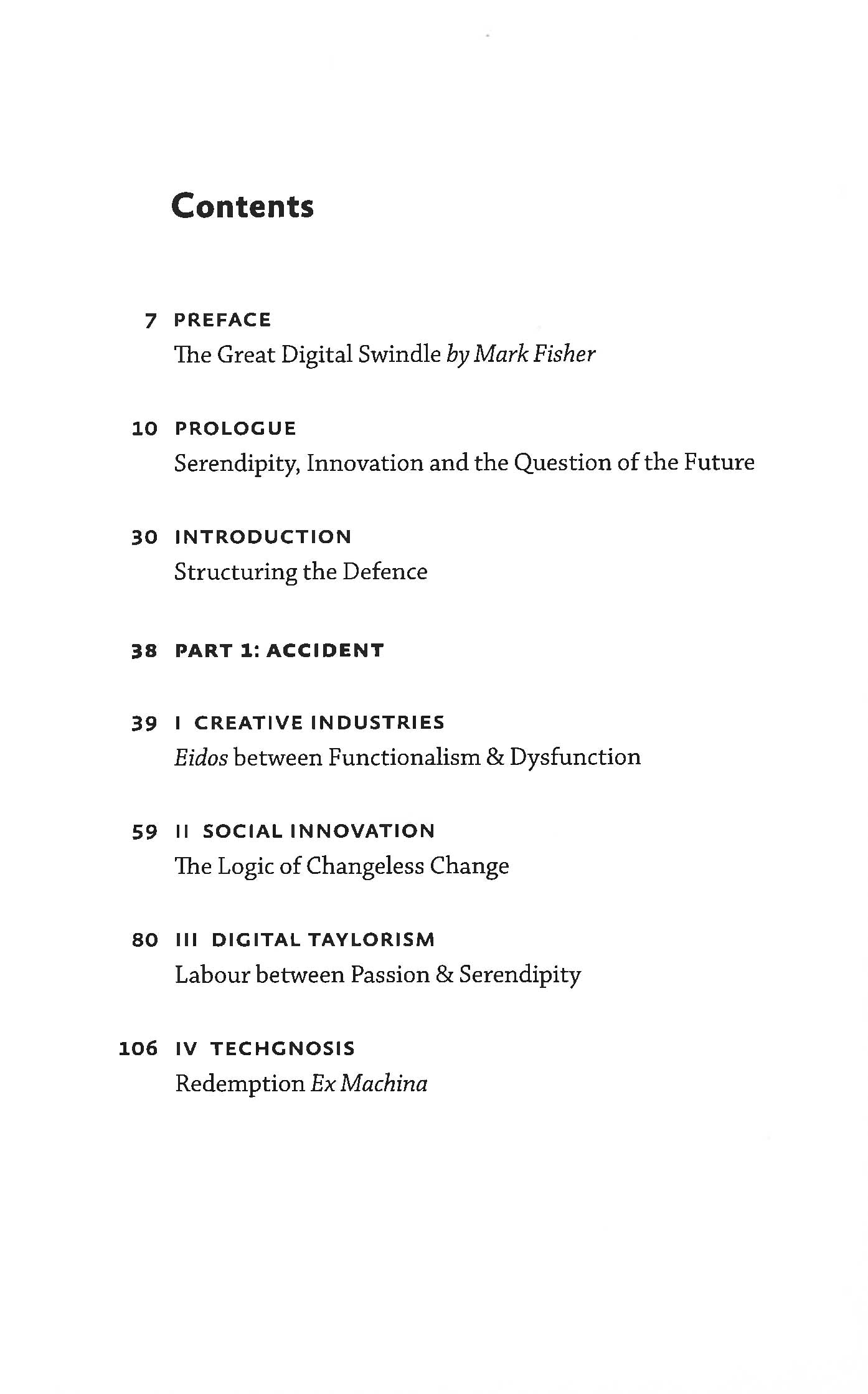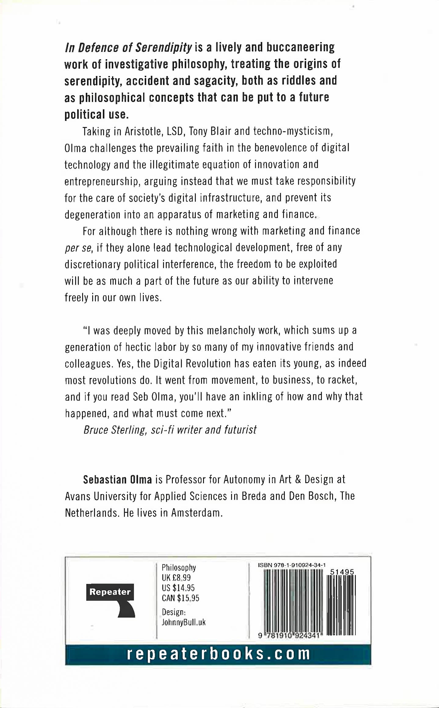"In Defence of Serendipity" is a lively and buccaneering work of investigative philosophy, treating the origins of serendipity, accident and sagacity, both as riddles and philosophical concepts that can be put to a future political use. Taking in Aristotle, LSD, Tony Blair and techno-mysticism, Olma challenges the prevailing faith in the benevolenceof digital technology and the illegitimate equation of innovation and entrepreneurship, arguing instead that we musttake responsibility for the care of society s digital infrastructure, and prevent its degeneration into an apparatus of marketing and finance. For although there is nothing wrong with marketing and finance"per se, "if they alone lead technological development, free of any discretionary political interference, the freedom to be exploited will be as much a part of the future as our ability to intervene freely in our lives, will be a thing of the past."