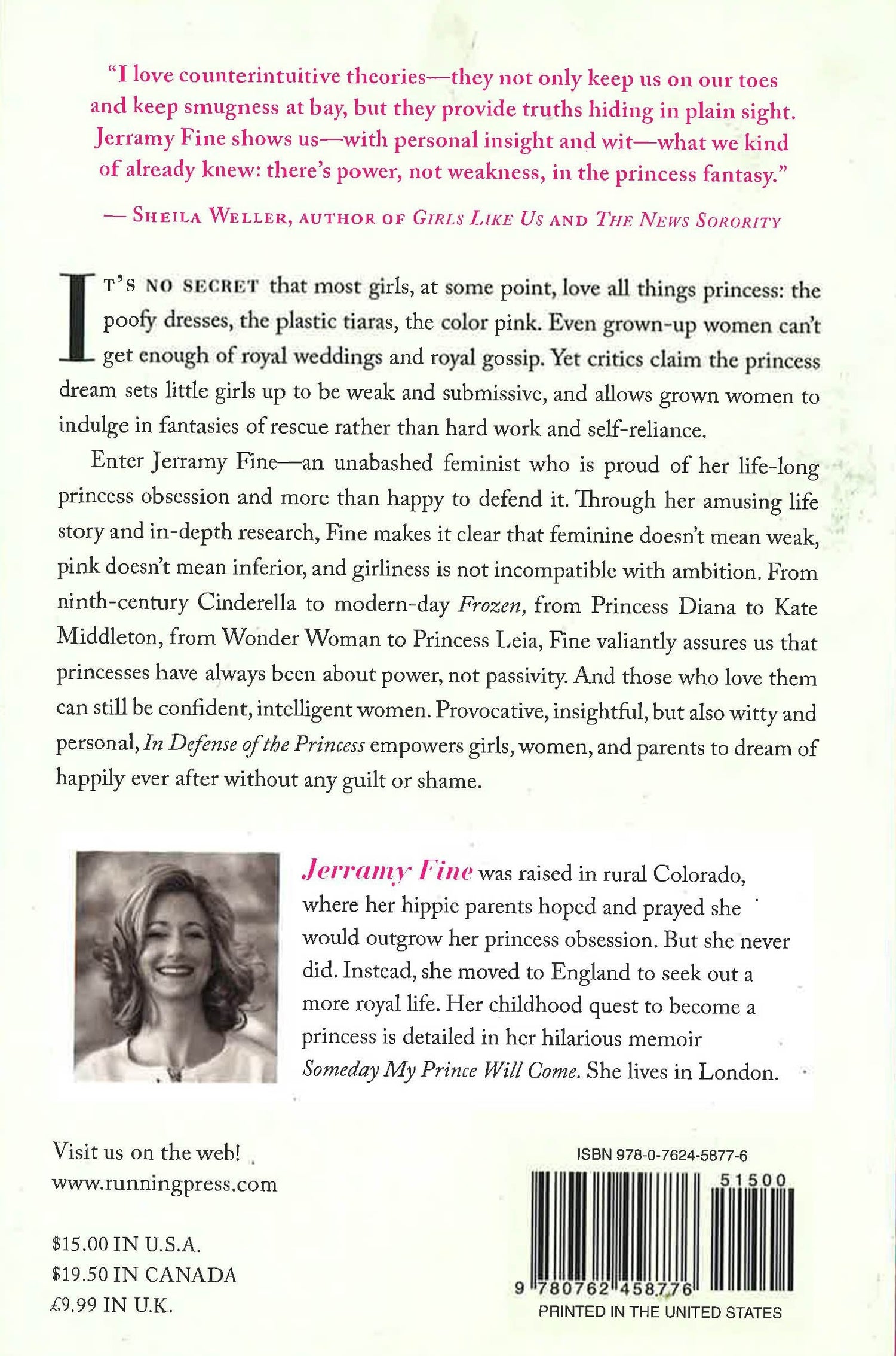 It's no secret that most girls, at some point, love all things princess: the poofy dresses, the plastic tiaras, the colour pink. Even grown-up women can't get enough of royal weddings and royal gossip. Yet critics claim the princess dream sets little girls up to be weak and submissive, and allows grown women to indulge in fantasies of rescue rather than hard work and self-reliance. Enter Jerramy Fine - an unabashed feminist who is proud of her life-long princess obsession and more than happy to defend it. Through her amusing life story and in-depth research, Fine makes it clear that feminine doesn't mean weak, pink doesn't mean inferior, and girliness is not incompatible with ambition. From 9th century Cinderella to modern-day Frozen , from Princess Diana to Kate Middleton, from Wonder Woman to Princess Leia, Fine valiantly assures us that princesses have always been about power, not passivity. And those who love them can still be confident, intelligent women. Provocative, insightful, but also witty and personal, In defence of the Princess empowers girls, women, and parents to dream of happily ever after without any guilt or shame.