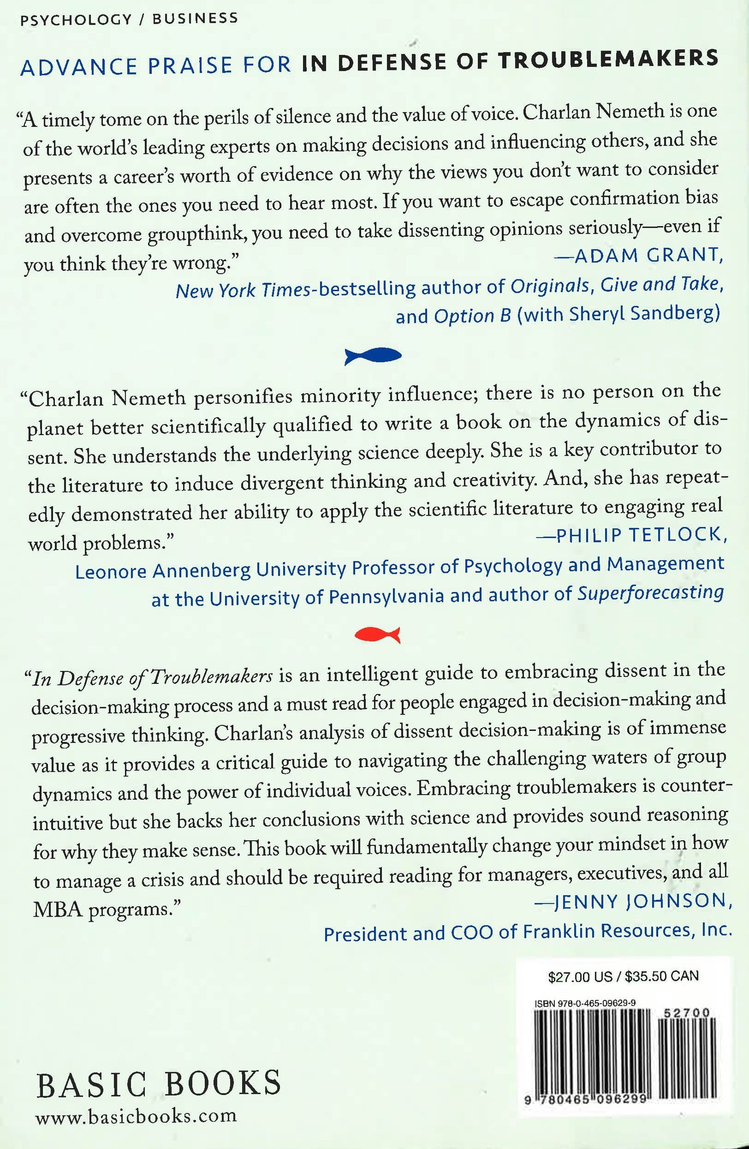 We've decided by consensus that consensus is good. In In Defense of Troublemakers, psychologist Charlan Nemeth argues that this principle is completely wrong: left unchallenged, the majority opinion is often biased, unoriginal, or false. It leads planes and markets to crash, causes juries to convict innocent people, and can quite literally make people think blue is green. In the name of comity, we embrace stupidity. We can make better decisions by embracing dissent. Dissent forces us to question the status quo, consider more information, and engage in creative decision-making. From Twelve Angry Men to Edward Snowden, lone objectors who make people question their assumptions bring groups far closer to truth--regardless of whether they are right or wrong. Essential reading for anyone who works in groups, In Defense of Troublemakers will radically change the way you think, listen, and make decisions.