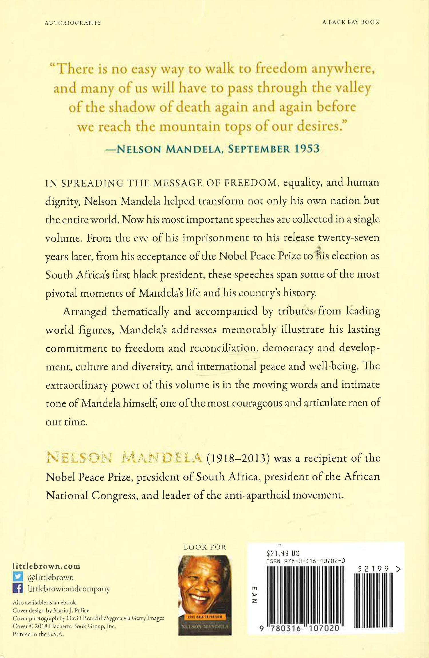 In spreading the message of freedom, equality, and human dignity, Nelson Mandela helped transform not only his own nation, but the entire world. Now his most important speeches are collected in a single volume. From the eve of his imprisonment to his release twenty-seven years later, from his acceptance of the Nobel Peace Prize to his election as South Africa's first black president, these speeches span some of the most pivotal moments of Mandela's life and his country's history. Arranged thematically and accompanied by tributes from leading world figures, Mandela's addresses memorably illustrate his lasting commitment to freedom and reconciliation, democracy and development, culture and diversity, and international peace and well-being. The extraordinary power of this volume is in the moving words and intimate tone of Mandela himself, one of the most courageous and articulate men of our time. "There is no easy way to walk to freedom anywhere, and many of us will have to pass through the valley of the shadow of death again and again before we reach the mountain tops of our desires." -- Nelson Mandela, September 1953