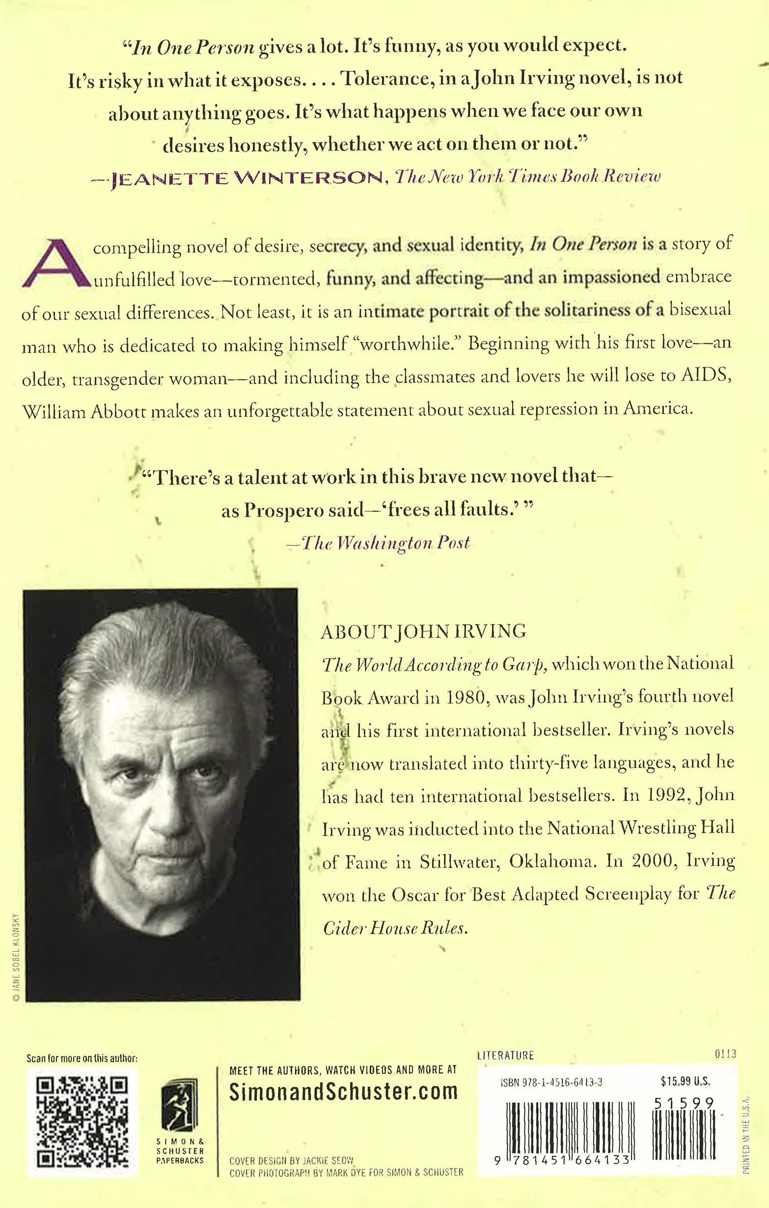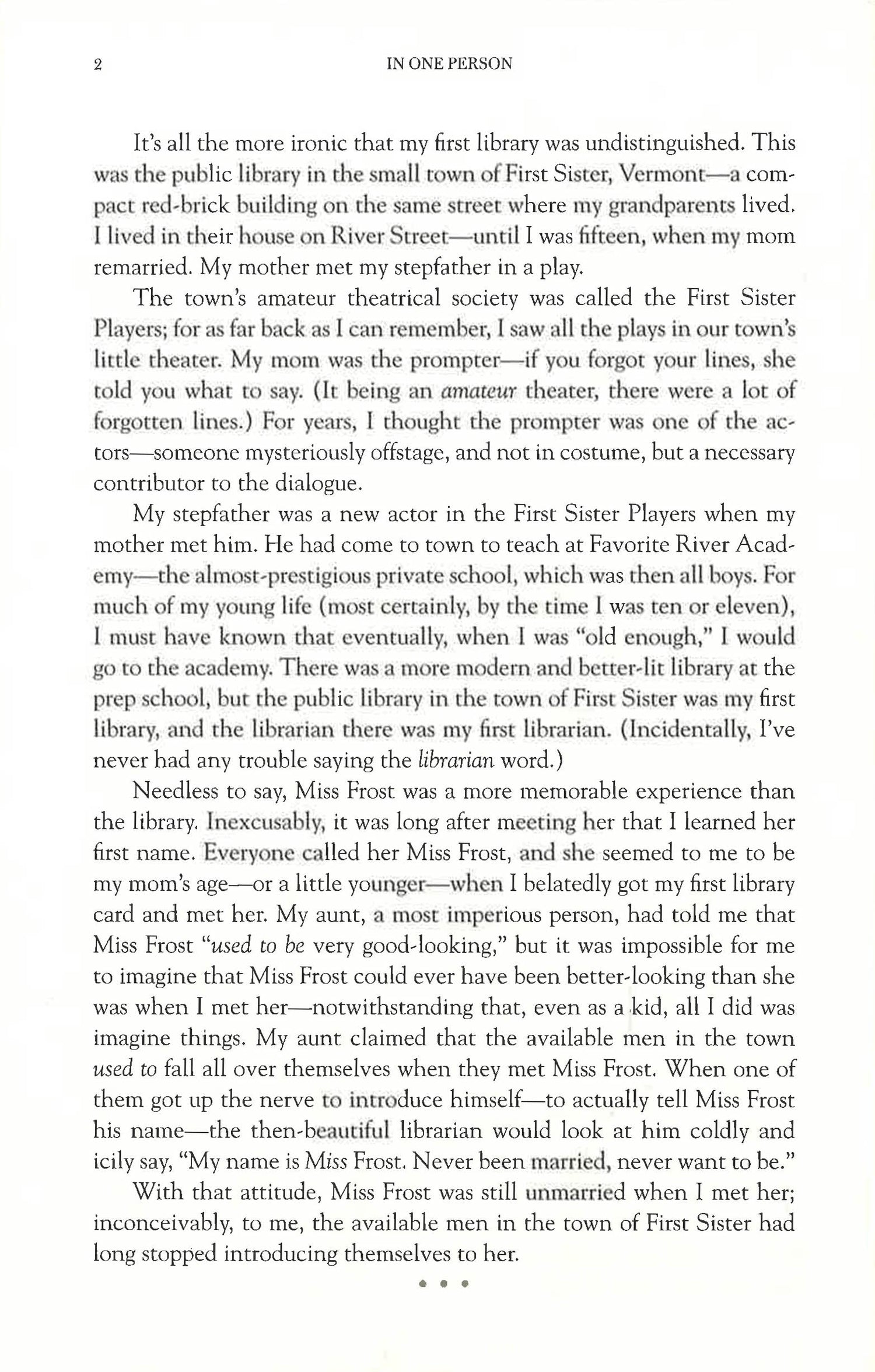 A New York Times bestselling novel of desire, secrecy, and sexual identity, In One Person is a story of unfulfilled love - tormented, funny, and affecting - and an impassioned embrace of our sexual differences. Billy, the bisexual narrator and main character of In One Person, tells the tragicomic story (lasting more than half a century) of his life as a "sexual suspect," a phrase first used by John Irving in 1978 in his landmark novel of "terminal cases," The World According to Garp. In One Person is a poignant tribute to Billy’s friends and lovers - a theatrical cast of characters who defy category and convention. Not least, In One Person is an intimate and unforgettable portrait of the solitariness of a bisexual man who is dedicated to making himself "worthwhile."