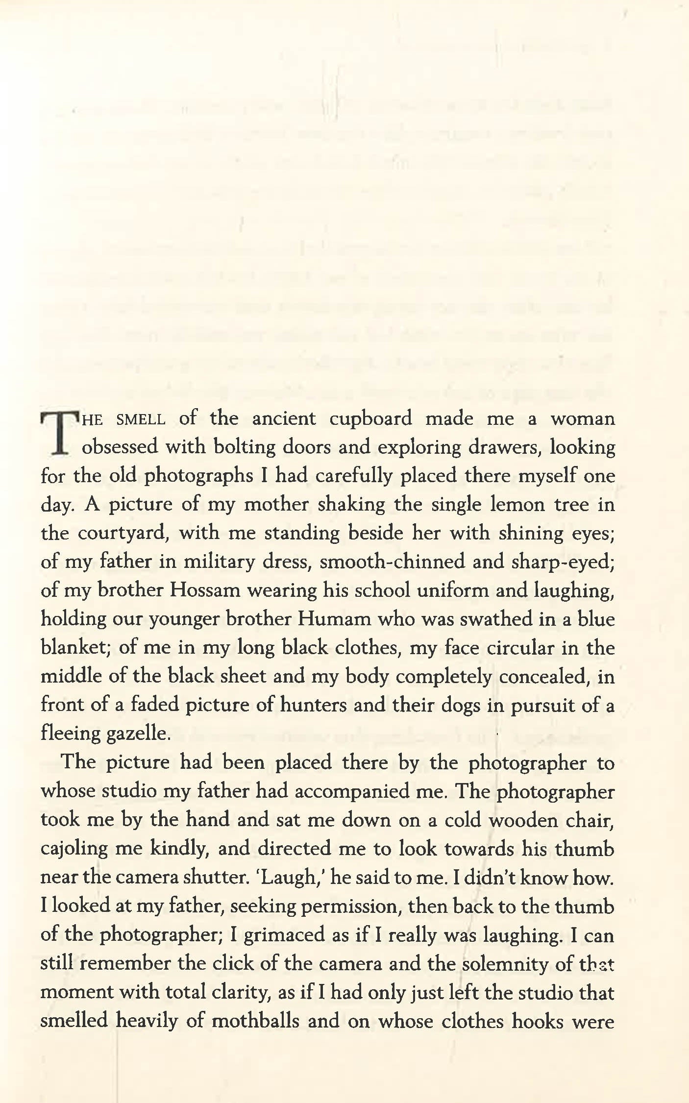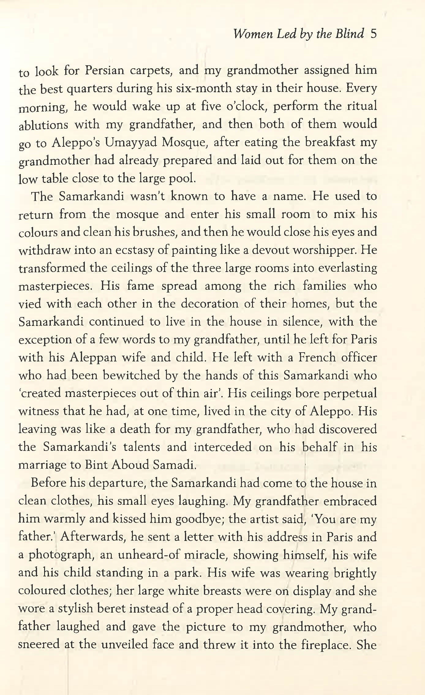 1980s Syria, our young narrator is living a secluded life behind the veil in the vast and perfumed house of her grandparents in Aleppo. Her three aunts, Maryam the pious one; Safaa, the liberal; and the free-spirited Marwa, bring her up with the aid of their ever-devoted blind servant.