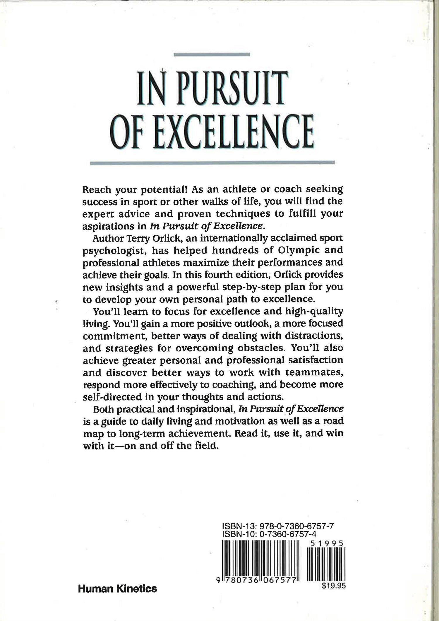Author Terry Orlick, an internationally acclaimed sport psychologist, has helped hundreds of Olympic and professional athletes maximise their performances and achieve their goals. In this fourth edition, Orlick provides new insights and a powerful step-by-step plan for the reader to develop their own personal path to excellence.The reader will learn to focus for excellence and high-quality living. Through this book, the reader will gain a more positive outlook, a more focused commitment, better ways of dealing with distractions and strategies for overcoming obstacles.This new fourth edition guides readers to achieve greater personal and professional satisfaction and discover better ways to work with team-mates, respond more effectively to coaching and become more self-directed in thoughts and actions.Both practical and inspirational, In Pursuit of Excellence is a guide to daily living and motivation as well as a road map to long-term achievement. Read it, use it and win with it - on and off the field.