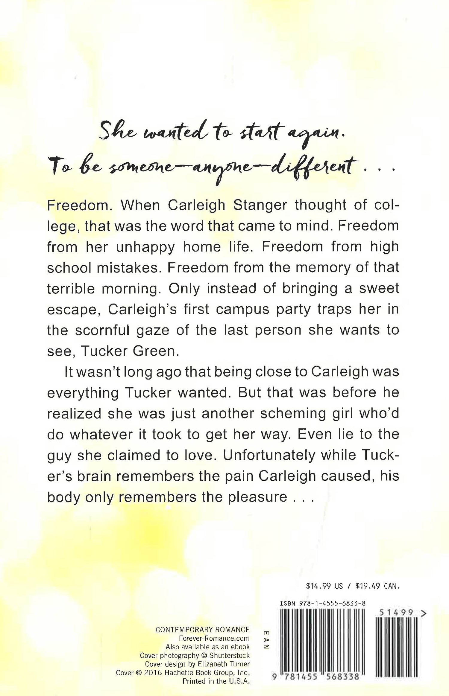 Freedom. When Carleigh Stanger thought of college, that was the word that came to mind. Freedom from her unhappy home life. Freedom from high school mistakes. Freedom from the memory of that terrible morning. Only instead of bringing a sweet escape, Carleigh's first campus party traps her in the scornful gaze of the last person she wants to see, Tucker Green.