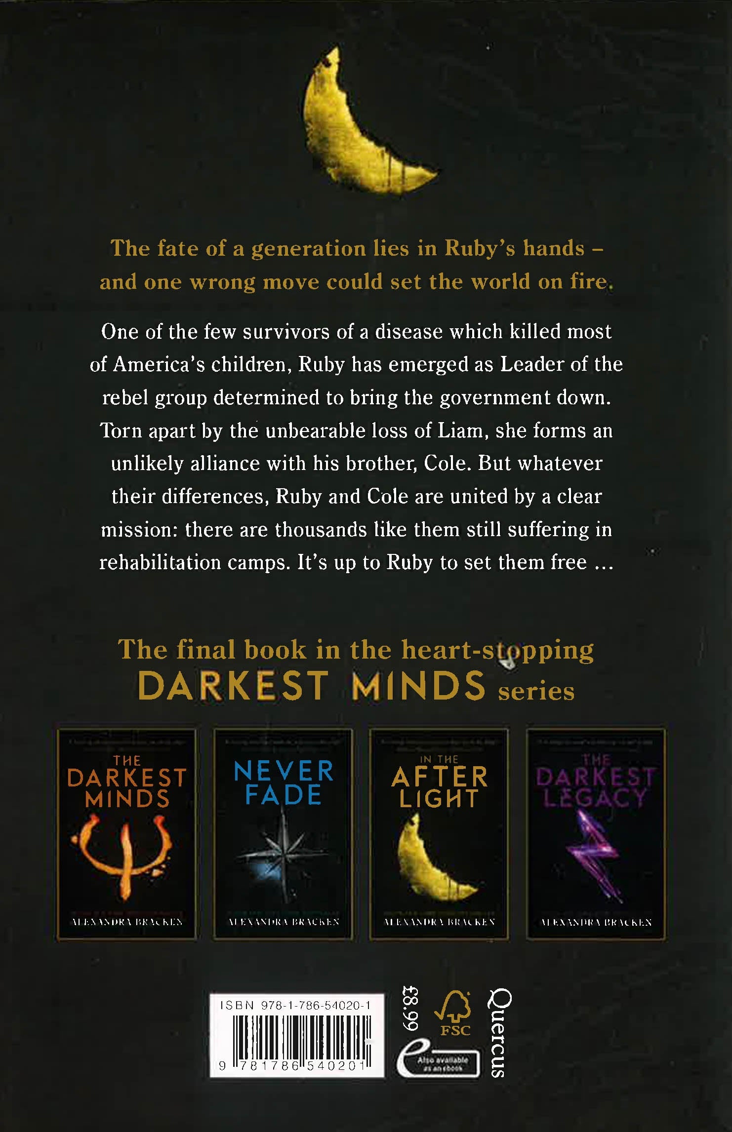The third book in the heart-stopping The Darkest Minds trilogy. The third book in the heart-stopping The Darkest Minds trilogy, by New York Times bestselling author of Passenger, for fans of Divergent and The Hunger Games.The fate of a generation lies in Ruby's hands - and one wrong move could set the world on fire.One of the few survivors of a disease which killed most of America's children, Ruby has emerged as Leader of the rebel group determined to bring the government down. Torn apart by the unbearable loss of Liam, she forms an unlikely alliance with his brother, Cole. But whatever their differences, Ruby and Cole are united by a clear mission: there are thousands like them still suffering in 'rehabilitation camps'. It's up to Ruby to set them free ...'A riveting emotional read that kept me on the edge.' - Melissa Marr, author of Wicked LovelyAlexandra Bracken is the New York Times bestselling author of Passenger, Wayfarer and The Darkest Minds series. Visit her online at www.alexandrabracken.com and on Twitter @alexbracken.