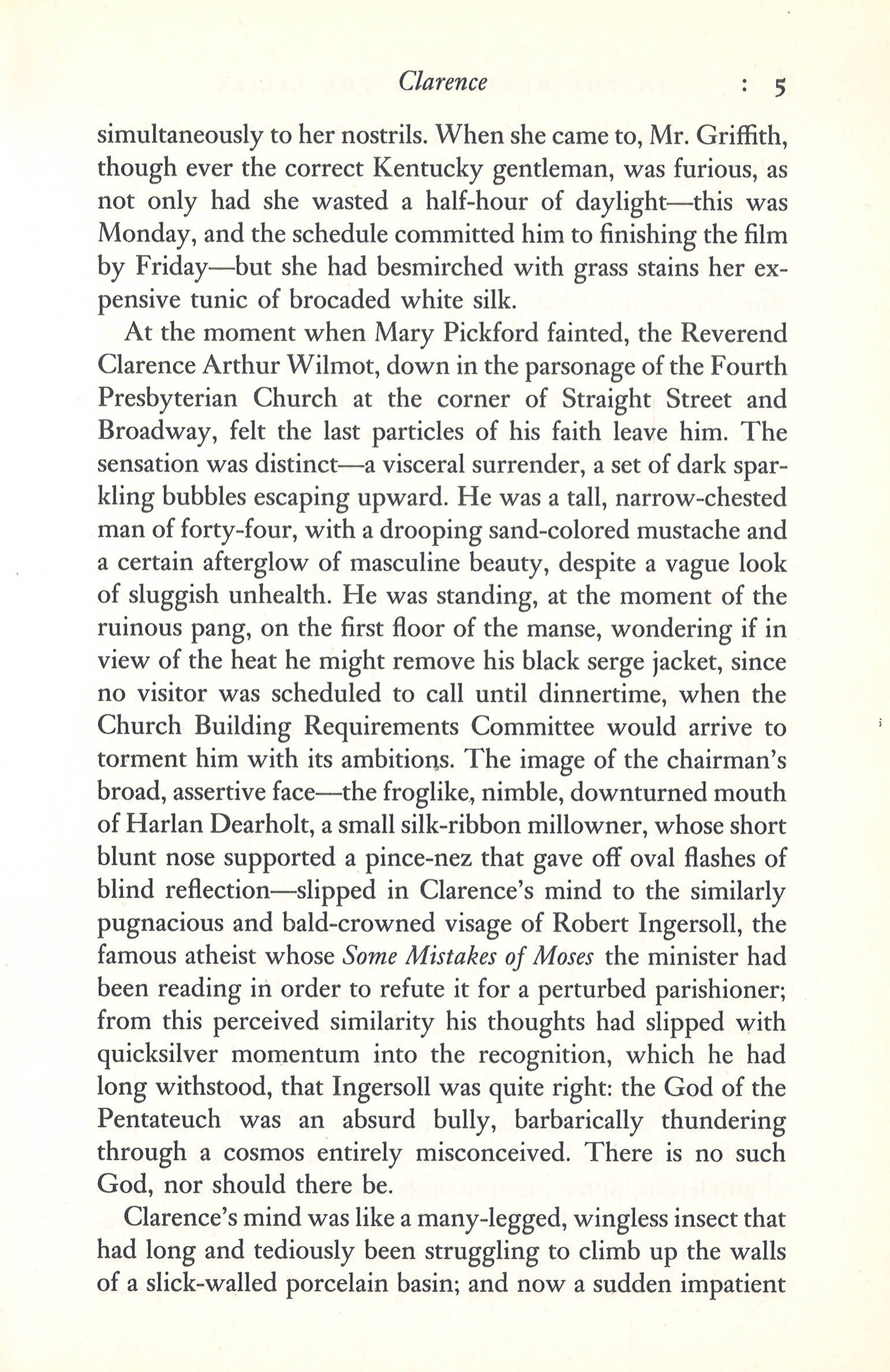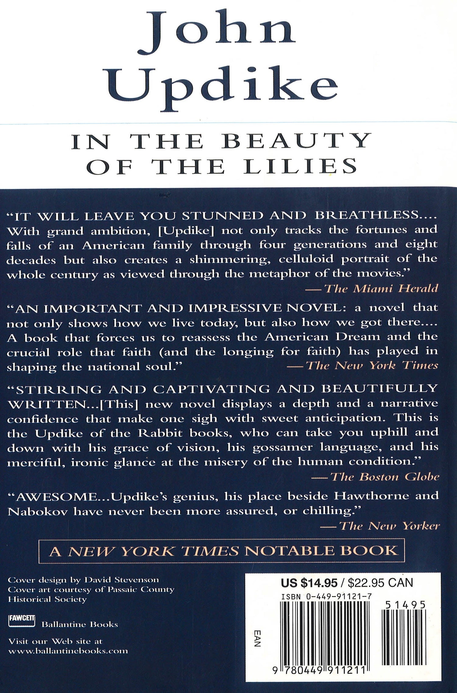 In the Beauty of the Lilies begins in 1910 and traces God's relation to four generations of American seekers, beginning with Clarence Wilmot, a clergyman in Paterson, New Jersey. He loses his faith but finds solace at the movies, respite from "the bleak facts of life, his life, gutted by God's withdrawal." His son, Teddy, becomes a mailman who retreats from American exceptionalism, religious and otherwise, into a life of studied ordinariness. Teddy has a daughter, Esther, who becomes a movie star, an object of worship, an All-American goddess. Her neglected son, Clark, is possessed of a native Christian fervor that brings the story full circle: in the late 1980s he joins a Colorado sect called the Temple, a handful of "God's elect" hastening the day of reckoning. In following the Wilmots' collective search for transcendence, John Updike pulls one wandering thread from the tapestry of the American Century and writes perhaps the greatest of his later novels.