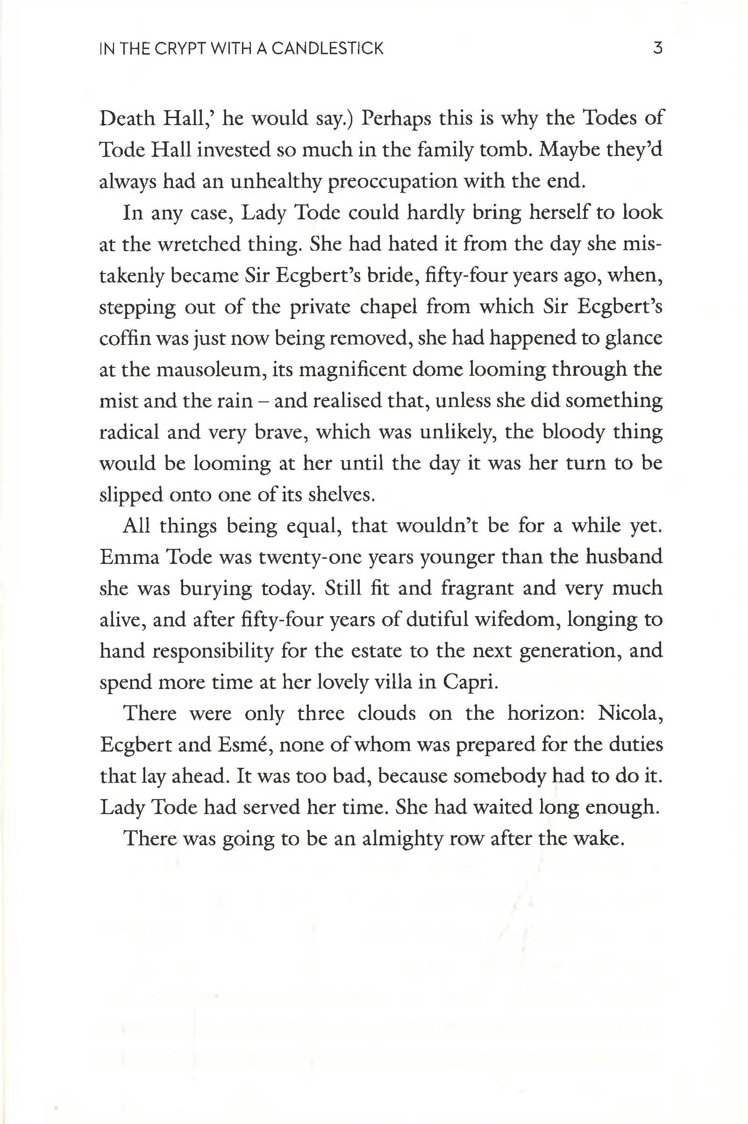 Sir Ecgbert Tode of Tode Hall has survived to a grand old age--much to the despair of his younger wife, Emma. But at age ninety-three he has, at last, shuffled off the mortal coil.