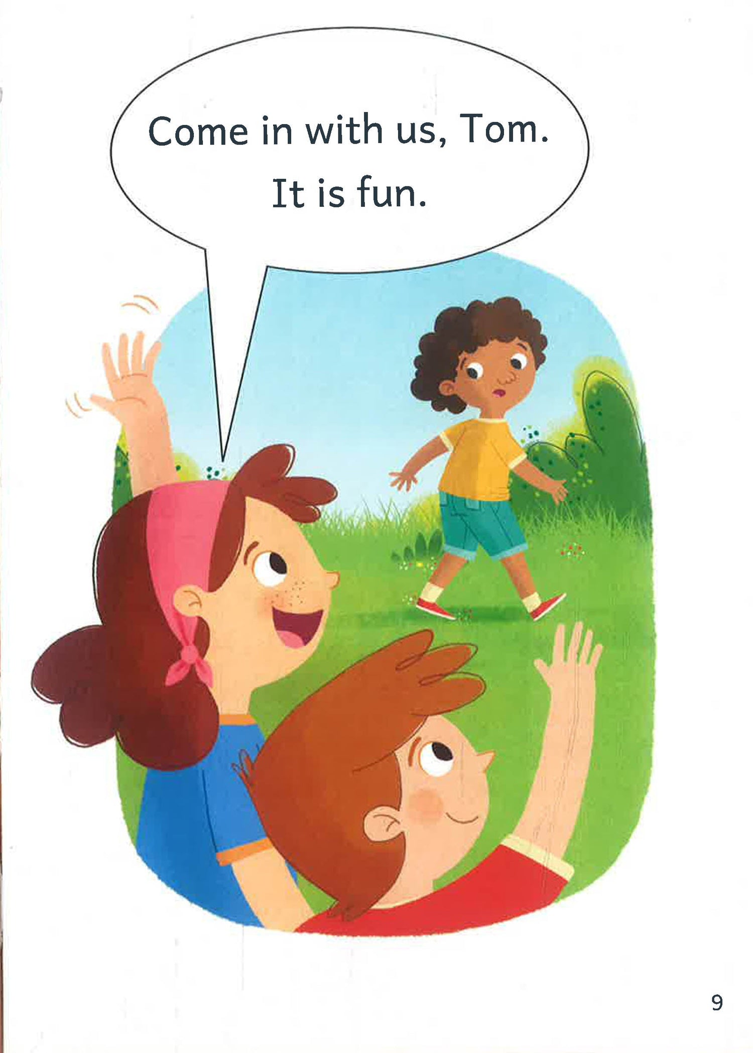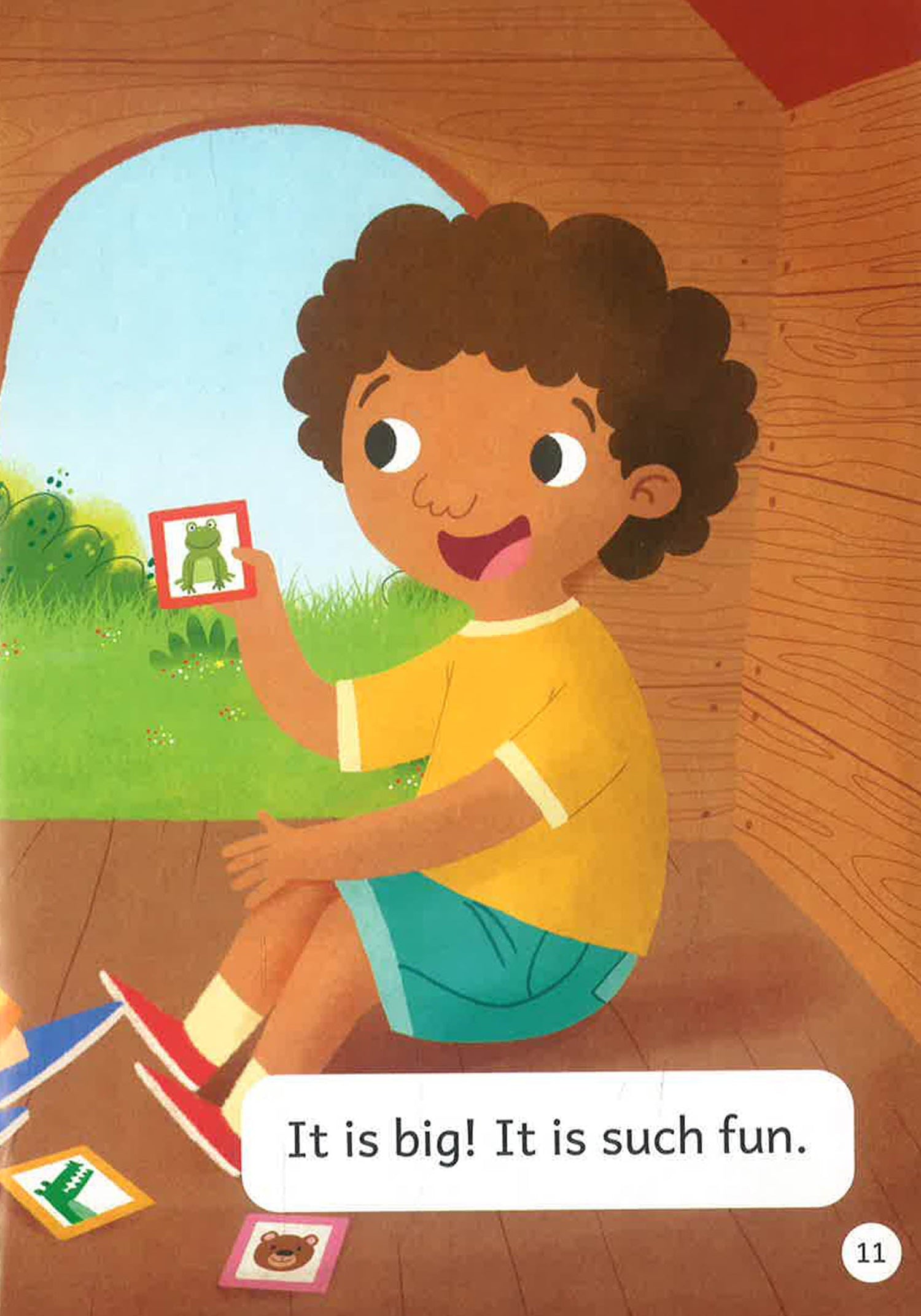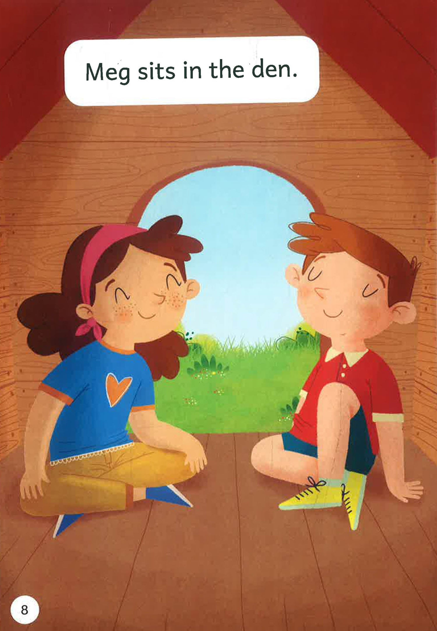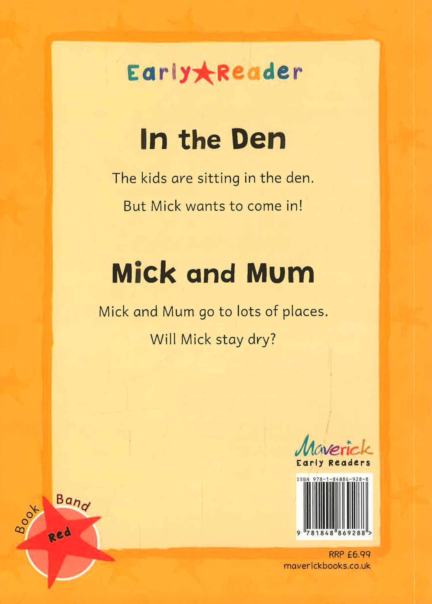 The kids are sitting in the den. But Mick wants to come in! Mick and Mum go to lots of places. Will Mick stay dry?