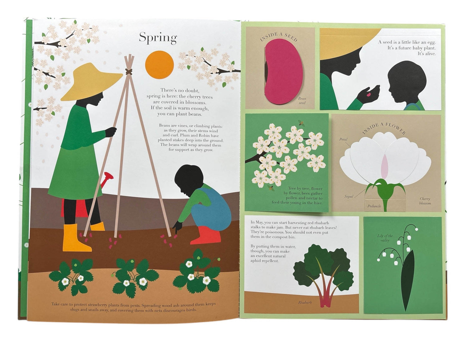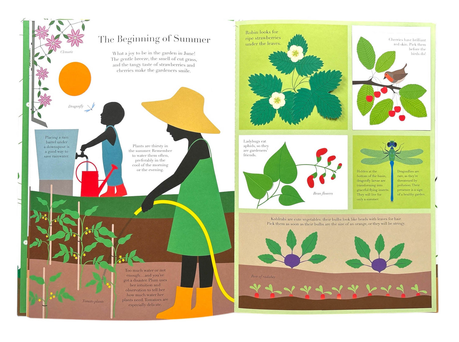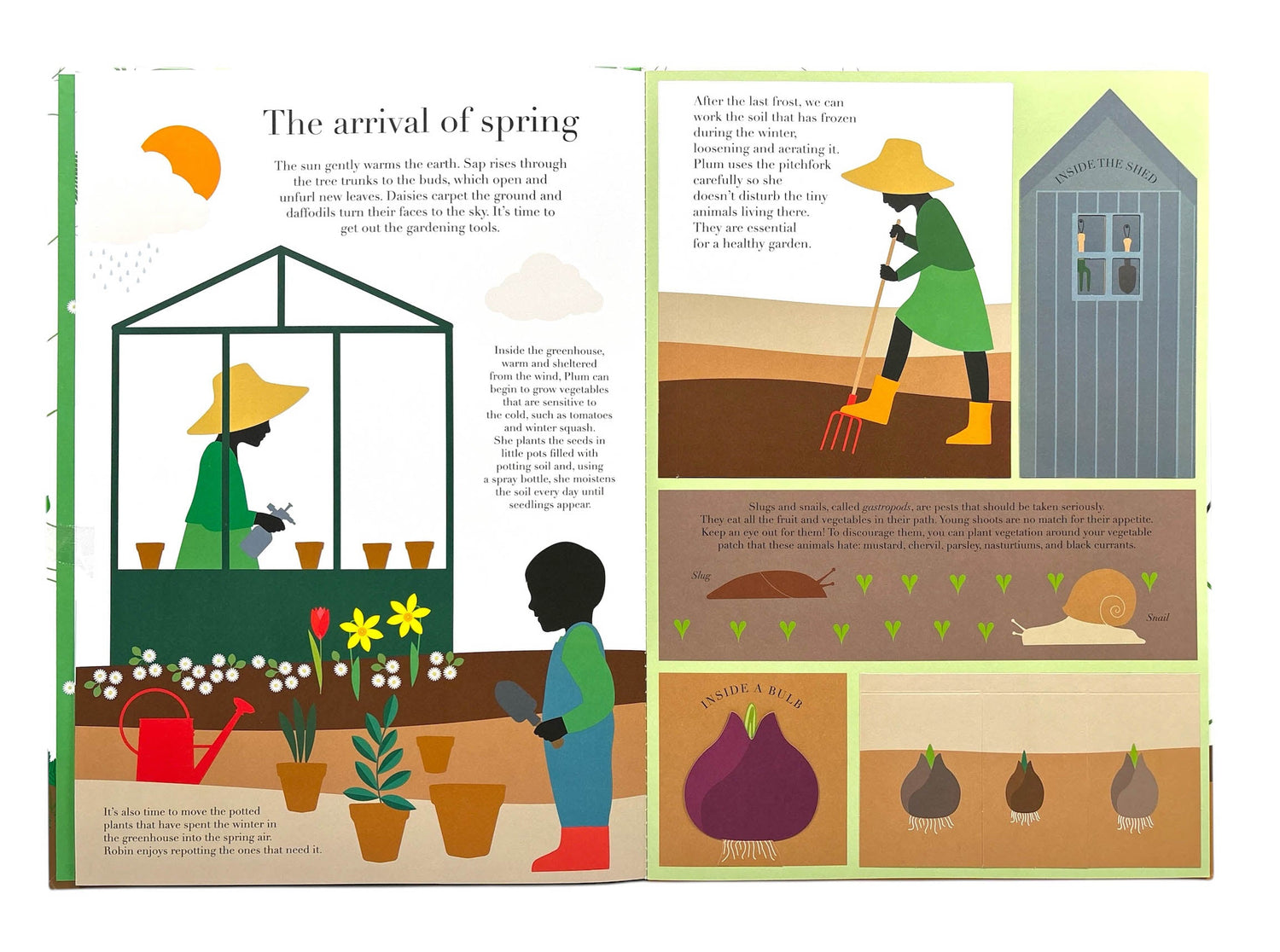 Marvelous wonders await in this extraordinary garden book. From season to season, children follow the life of a garden as each page reveals new treasures hiding under lift-up flaps. Peek inside the curious tulip bulb and discover the peas inside a peapod. Watch a ladybug help with pesky aphids and search for ripe strawberries under the leaves. Rich in detail, Emma Giuliani's bright, immersive illustrations and flaps in fantastic shapes, sizes, and colors carry the reader into the enchanted world of gardening. Discovering different facets of the garden-fauna, flora, and the work necessary to help it grow and thrive-will delight gardeners of all ages.