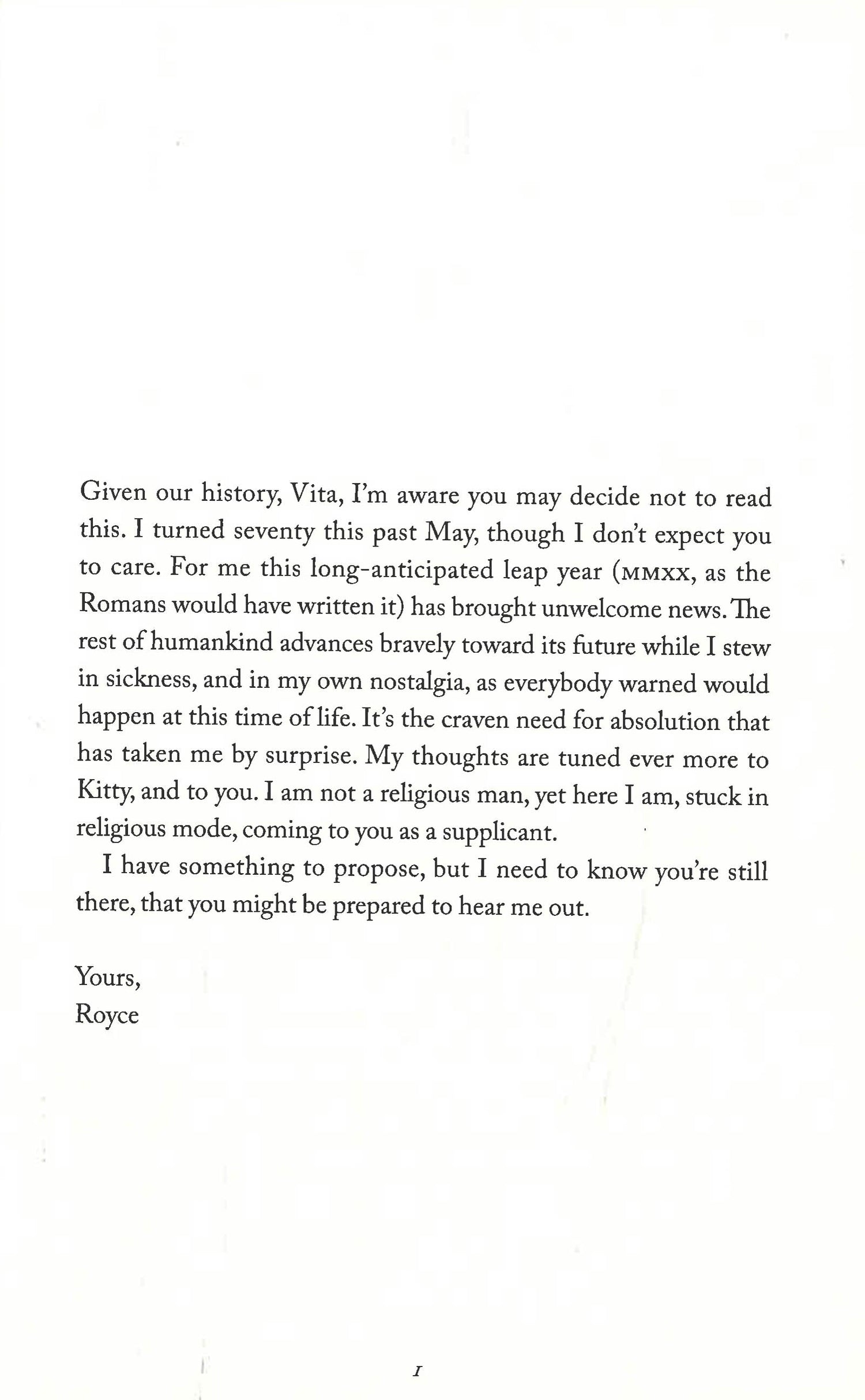 Almost twenty years after forbidding him to contact her, Vita receives a letter from a man who has long stalked her from a distance. Once, Royce was her benefactor and she was one of his brightest protégées. Now Royce is ailing and Vita's career as a filmmaker has stalled, and both have reasons for wanting to settle accounts. They enter into an intimate game of words, played according to shifting rules of engagement.