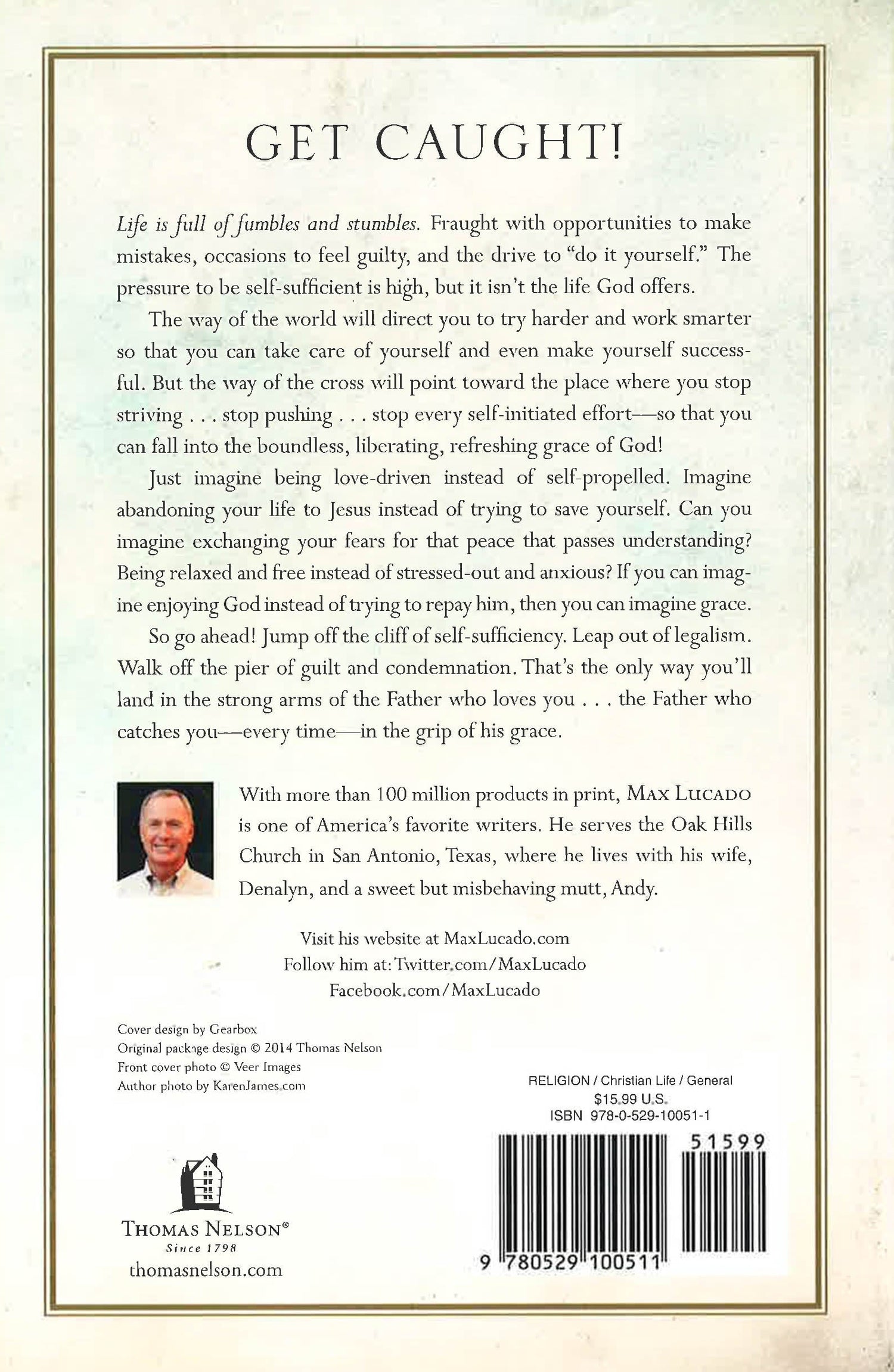 Get caught! Life is full of fumbles and stumbles. Fraught with opportunities to make mistakes, occasions to feel guilty, and the drive to "do it yourself." The pressure to be self-sufficient is high, but it isn't the life God offers. The way of the world will direct you to try harder and work smarter so that you can take care of yourself and even make yourself successful. But the way of the cross will point toward the place where you stop striving . . . stop pushing . . . stop every self-initiated effort-so that you can fall into the boundless, liberating, refreshing grace of God! Just imagine being love-driven instead of self-propelled. Imagine abandoning your life to Jesus instead of trying to save yourself. Can you imagine exchanging your fears for that peace that passes understanding? Being relaxed and free instead of stressed-out and anxious? If you can imagine enjoying God instead of trying to repay him, then you can imagine grace. So go ahead! Jump off the cliff of self-sufficiency. Leap out of legalism. Walk off the pier of guilt and condemnation. That's the only way you'll land in the strong arms of the Father who loves you . . . the Father who catches you-every time-in the grip of his grace.