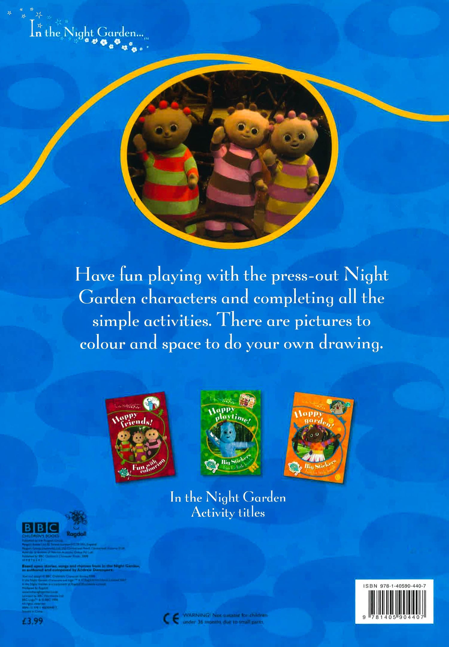 This book contains lots of fun activities and press-out pieces for little "In the Night Garden" fans. Plenty of space to draw, colour and scribble, the simple activities (such as such as pencil control practice using lines and shapes) are perfect for little hands. The big press-out pieces are ideal for interactive play using the Night Garden scenes on the gatefold cover. It is a fantastic value activity book.