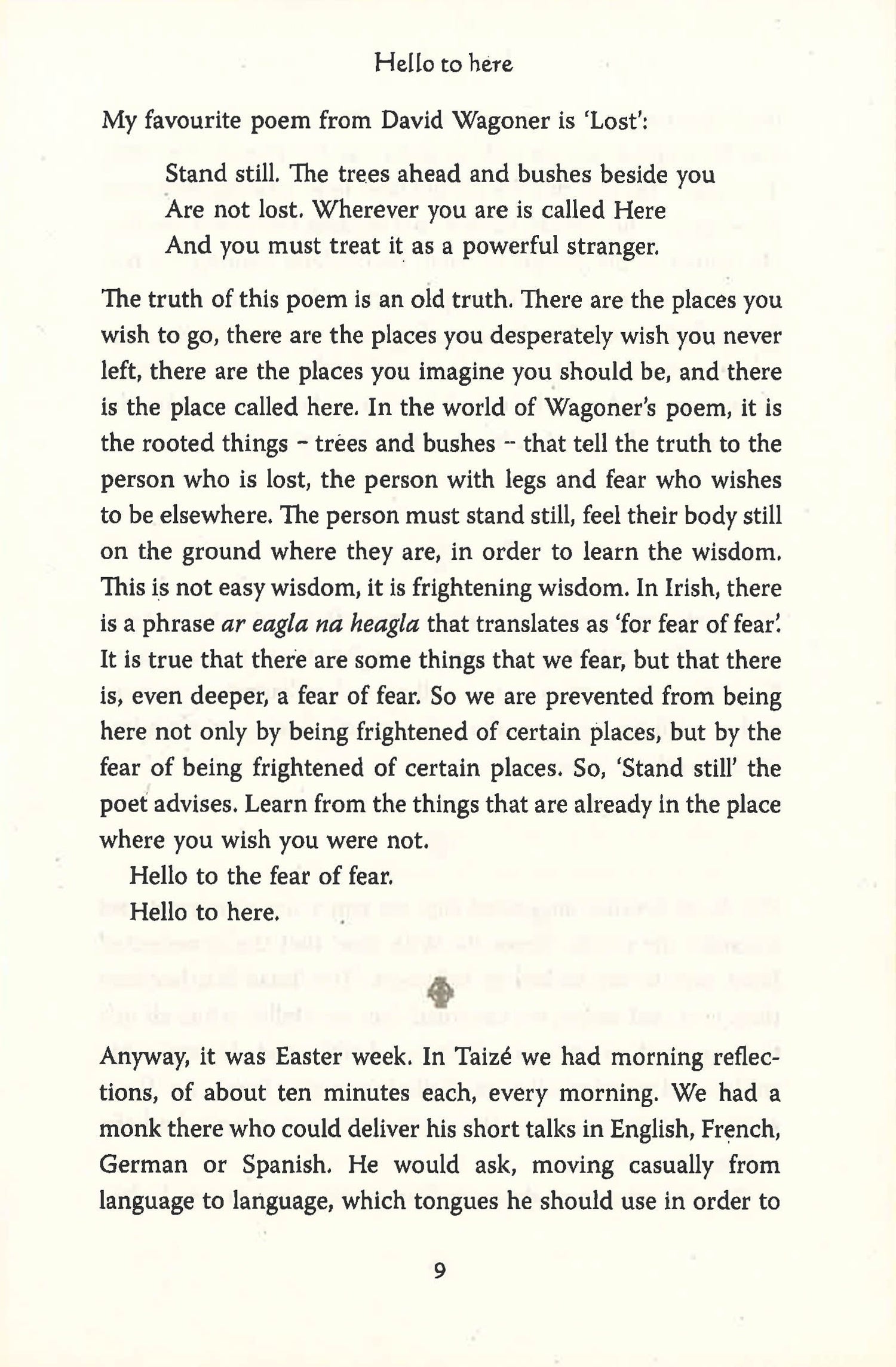 The fourth gospel tells of Jesus arriving in the room where the disciples are gathered, full of fear, on Easter Sunday. He does not chide or admonish; instead he says 'Peace be with you', which, in the Aramaic of his day, was simply a greeting. To people locked in a room of fear he said 'Hello,' welcoming them to a place of deep encounter: encounter with themselves, with their fear, with each other and with the incarnate one in their midst.