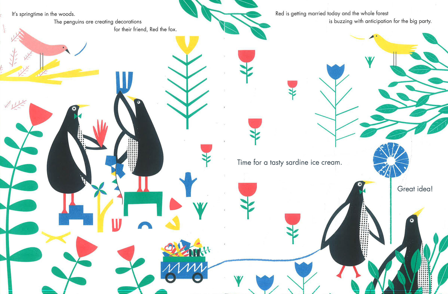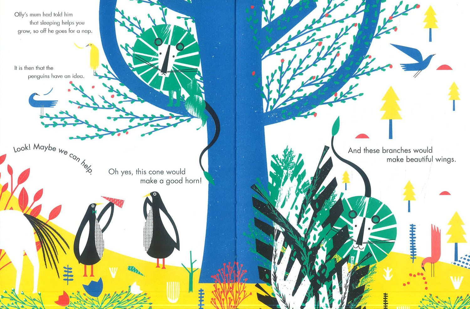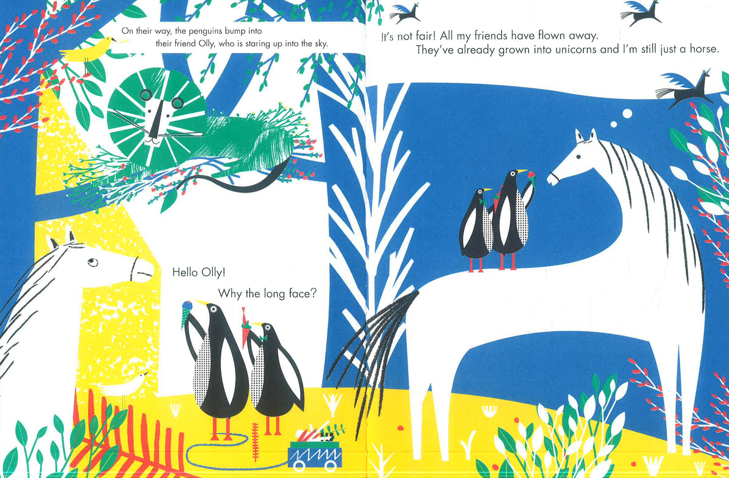 The woods are abuzz with activity as all the animals get ready for a very special event: Red the fox’s wedding day. But as the penguins are collecting the decorations, they realize not everyone is feeling happy in themselves. Olly the horse is upset that he is the only one of his friends not to have turned into a unicorn; Lionel the lion has lost his pride and glory – his mane; and on the morning of her wedding, the cake Red fox had spent hours making is stolen by the big bad wolf.