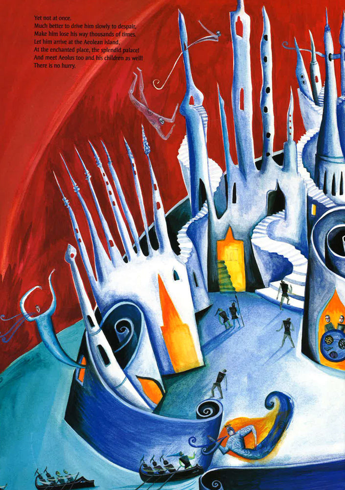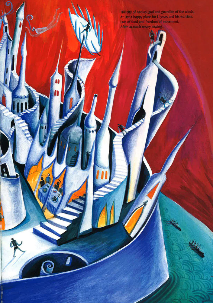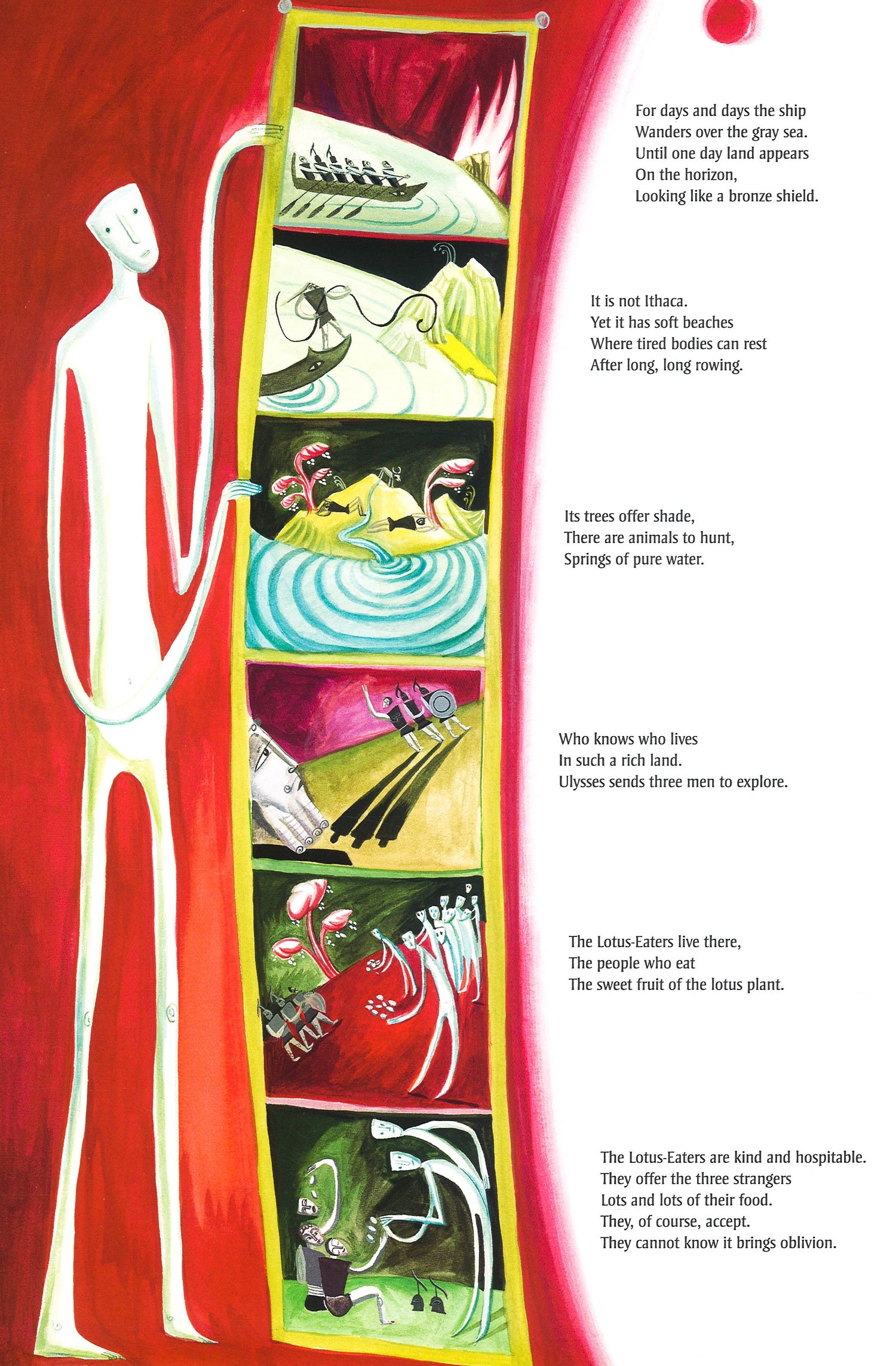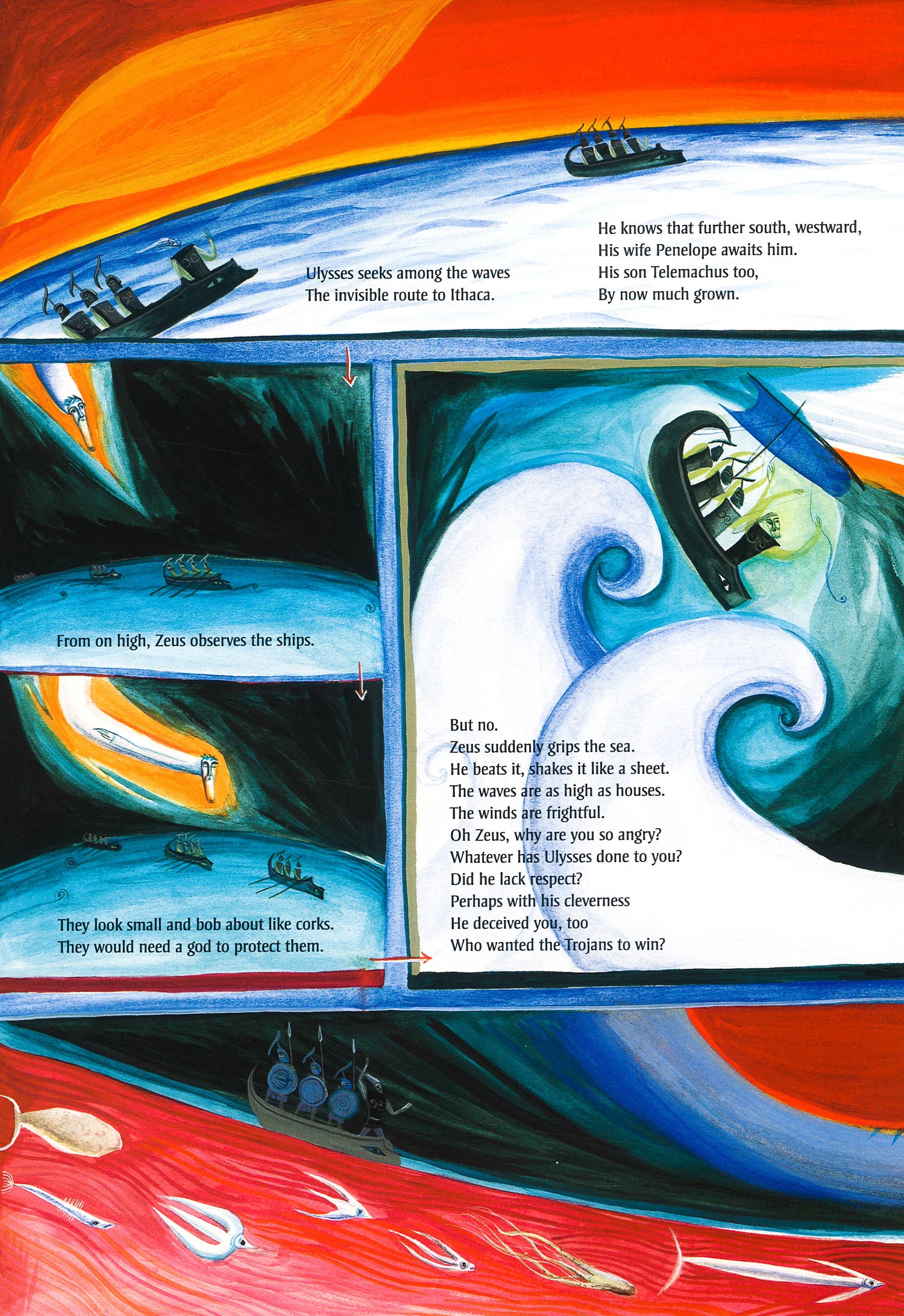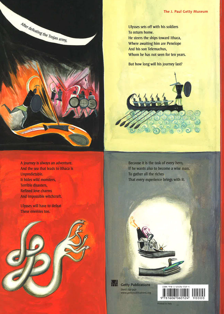 Offers a retelling of the Greek poet Homer's epic tale that is accompanied by illustrations reminiscent of ancient Greek art. This title creates a world filled with drama and mystery that is suitable for young readers. This retelling of the Greek poet Homer's epic tale is accompanied by beautiful and bold illustrations reminiscent of ancient Greek art. The graphic-novel-like style of the book, in which text and illustrations are tightly interwoven, creates a compelling world filled with drama and mystery certain to draw in young readers. After defeating the Trojans in an intense, ten-year war, the Greeks' courageous leader, Ulysses, king of Ithaca, begins the voyage home with his soldiers. There his faithful wife, Penelope, and his young son, Telemachus, await him. Ulysses never imagines that the journey home will be another ten-year quest in which he must confront all kinds of terrifying obstacles, including giant cannibals, one-eyed monsters, an enchantress who turns his men into pigs, and the tempting song of sea nymphs who try to lure him and his men to their death. But Ulysses is a daring and clever man, willing to take on all that life and the gods put in his path in order to reach his home.