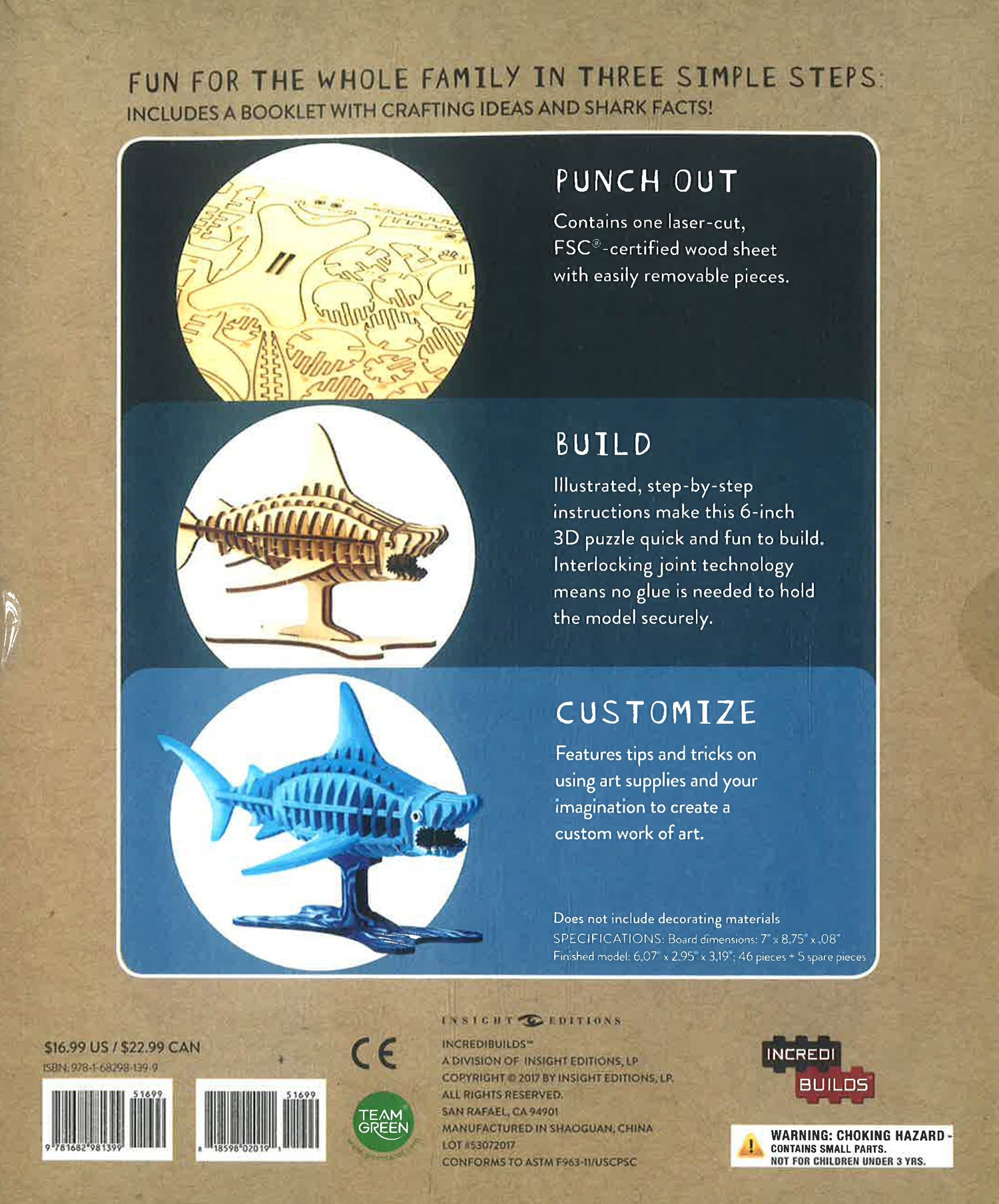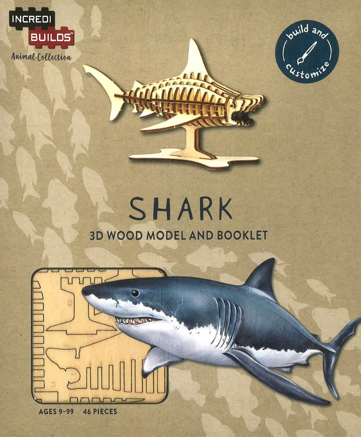 "With seven impressive layers of teeth, the great white shark is the largest known predatory fish! Now take the chance to explore your creativity with this exciting IncrediBuildsTM wood model set and craft your own unique, displayable shark. The wood model is easy to assemble and snaps together to form a dynamic 3D model. No glue or tools needed! Despite being the ocean s biggest predator, the great white shark is on the cusp of becoming an endangered species. IncrediBuilds TM is partnering with the World Wildlife Fund, the world s leading conservation organization, to raise awareness of these magnificent creatures and help protect this animal s future."