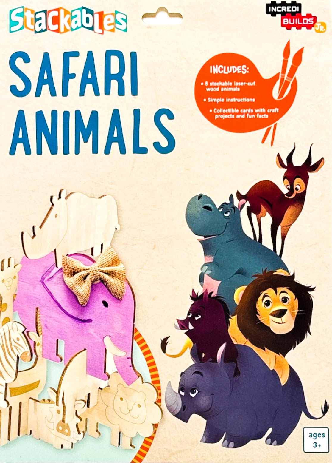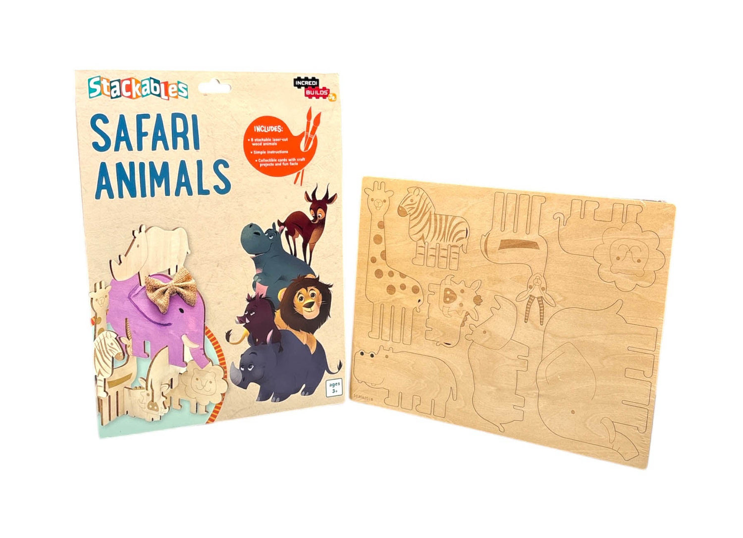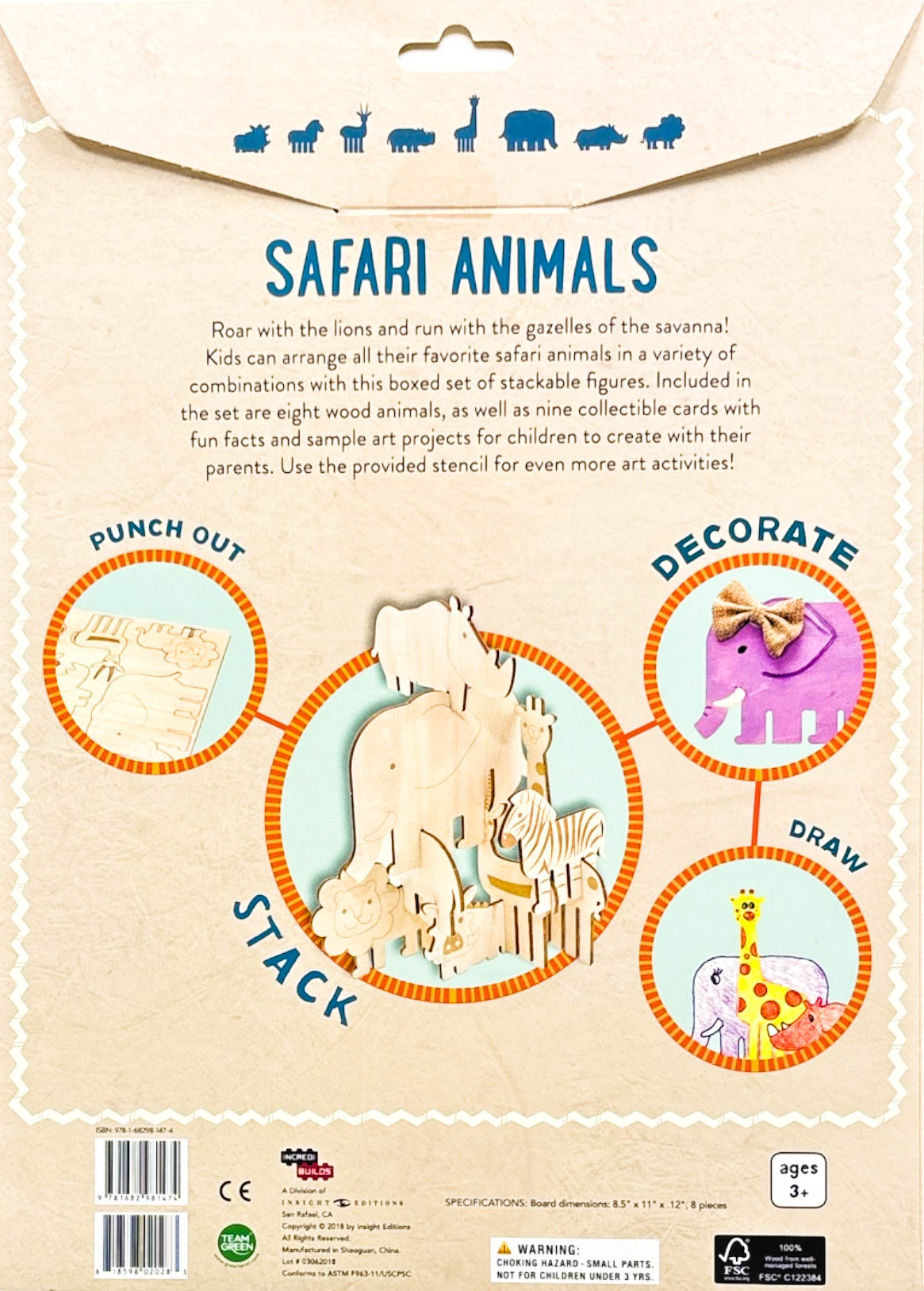 "Roar with the lions and run with the gazelles of the savanna! Kids can arrange all their favorite safari animals in an endless number of combinations with this boxed set of stackable wood figures. Each box comes with a giraffe, elephant, lion, gazelle, rhino, hippo, zebra, and warthog, as well as nine fun fact and craft cards with sample art projects for parents to do with their kids to make each animal their own. Sturdy, all-natural wood is perfect for repeated stacking, making this a great activity for parents and young IncrediBuilders alike!"