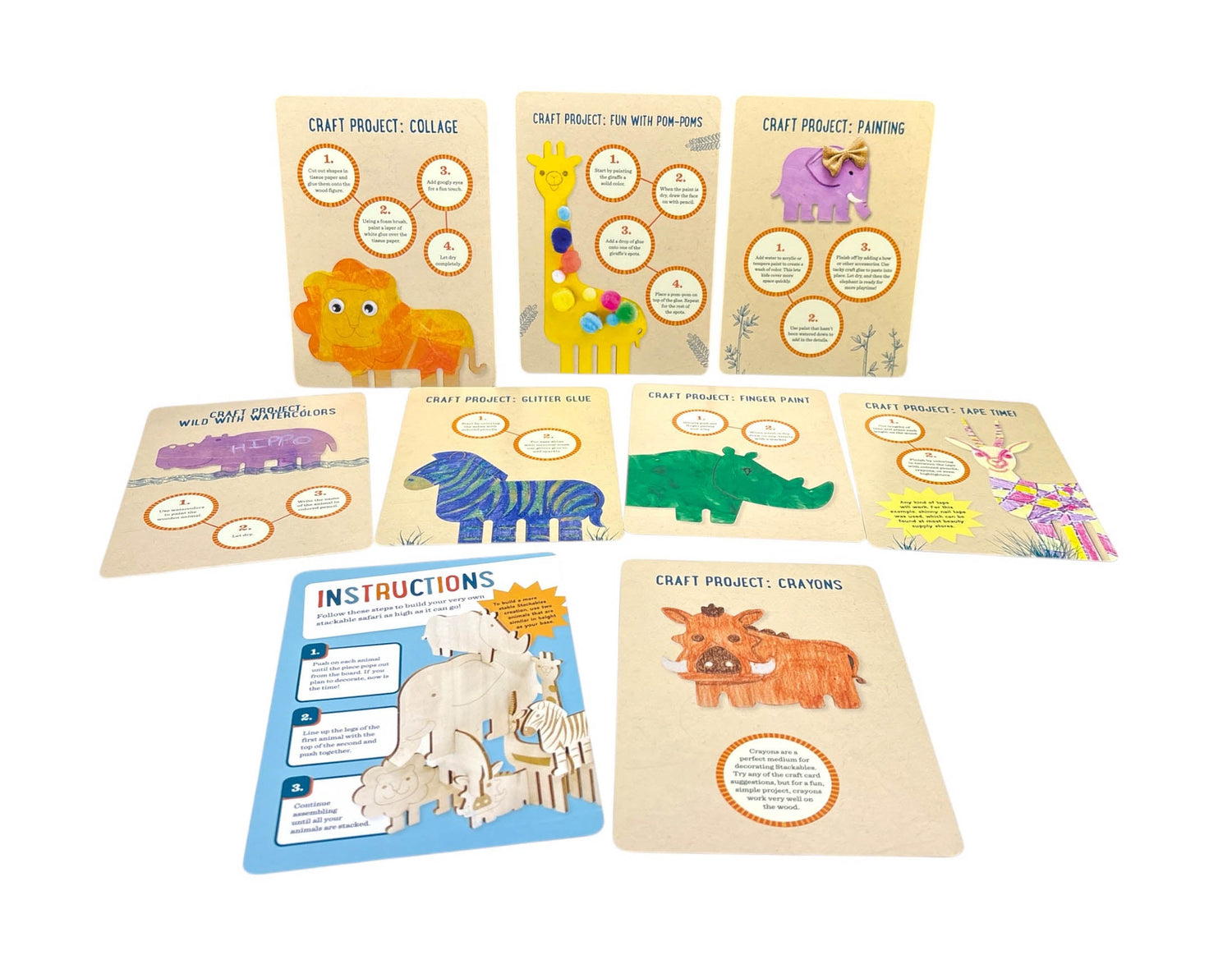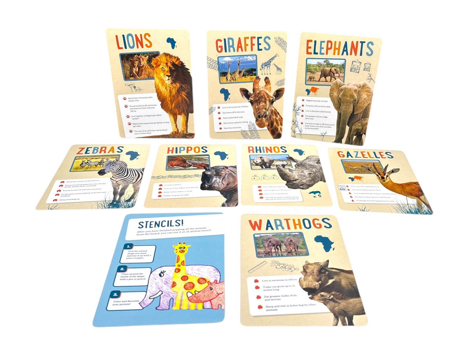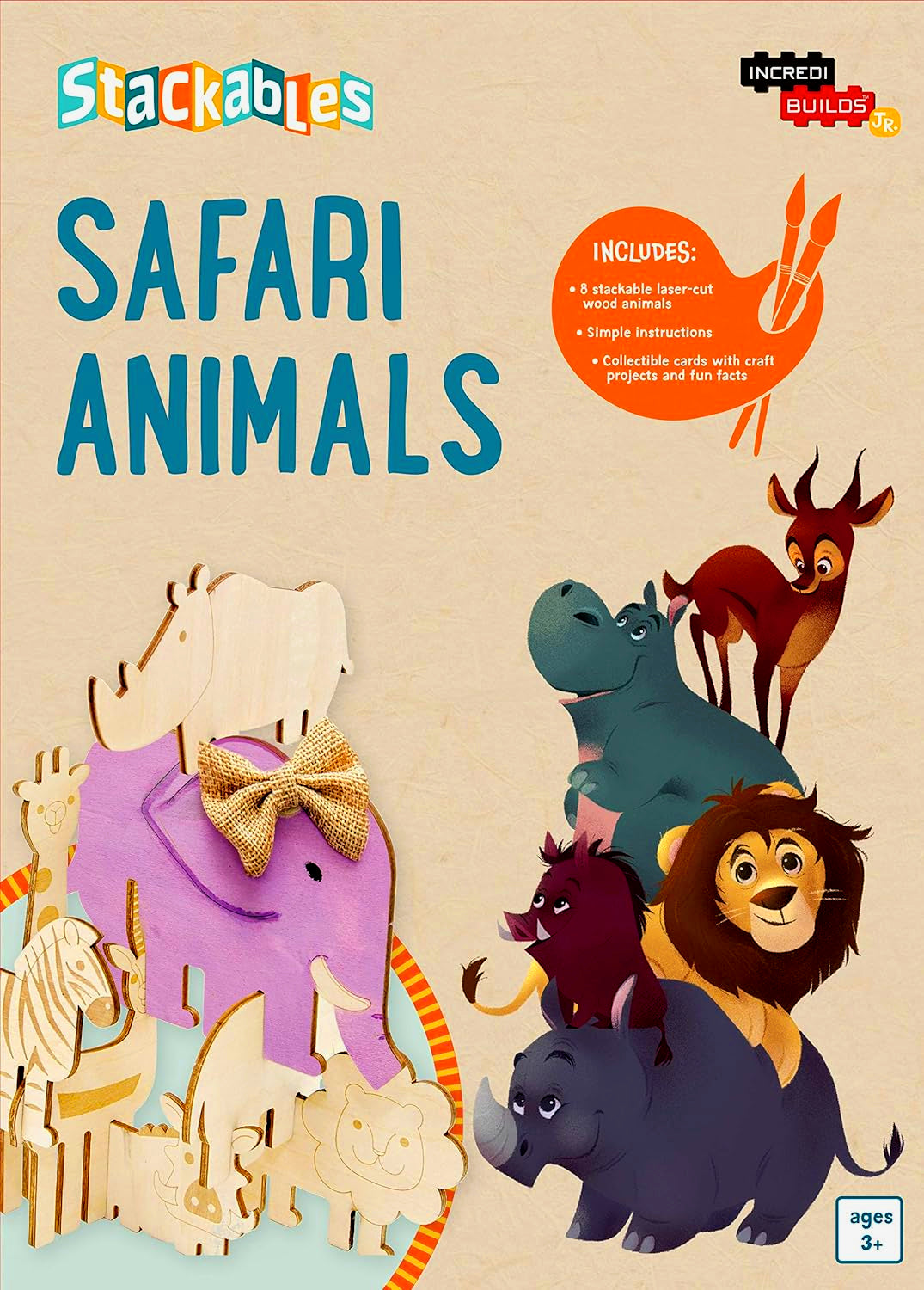 "Roar with the lions and run with the gazelles of the savanna! Kids can arrange all their favorite safari animals in an endless number of combinations with this boxed set of stackable wood figures. Each box comes with a giraffe, elephant, lion, gazelle, rhino, hippo, zebra, and warthog, as well as nine fun fact and craft cards with sample art projects for parents to do with their kids to make each animal their own. Sturdy, all-natural wood is perfect for repeated stacking, making this a great activity for parents and young IncrediBuilders alike!"
