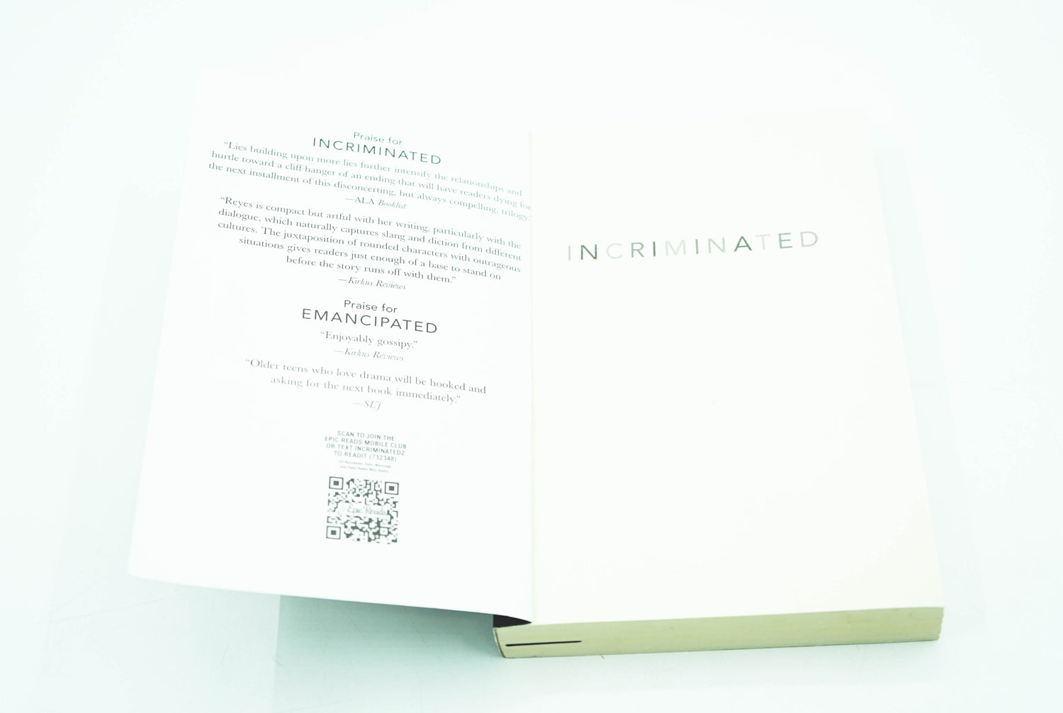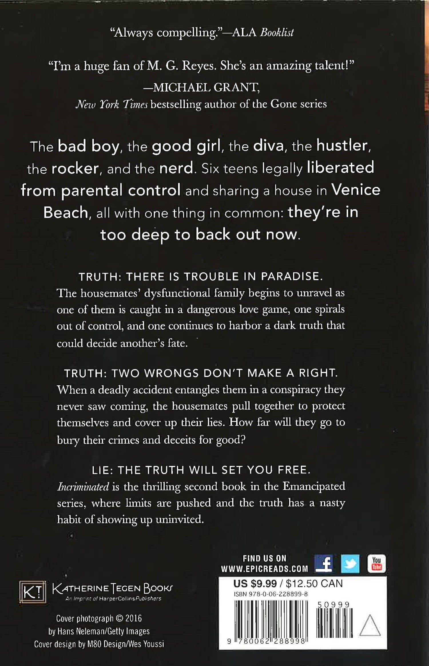 Incriminated is the thrilling second book in the Emancipated trilogy, where limits are pushed, friendships are tested, and the truth has a nasty way of showing up uninvited. There’s trouble in paradise. After a streak of hookups, heartbreaks, and bad decisions, the Venice Beach housemates’ once-perfect lives are falling apart. One is caught in a forbidden romance with a Hollywood heartthrob, while another puts her dreams on the line for one little kiss. One harbors a dark truth that could save a life, while another’s risky business puts all their lives in danger. And before they know it, the friends are fighting like family.But when an uninvited houseguest and a deadly accident entangle them in a conspiracy none of them saw coming, pulling together is the only way out. Alone, none of them can cover up their lies. Together, none of them can be trusted.Told from multiple perspectives, this gripping sequel is packed with scandal, romance, treachery, and murder. And no one else is going to clean up their messes.