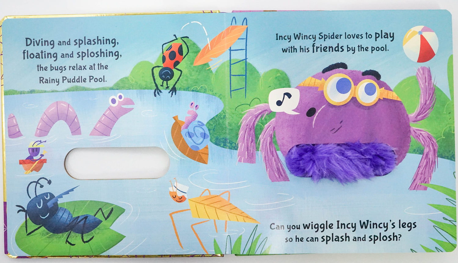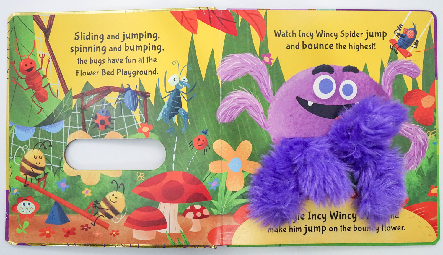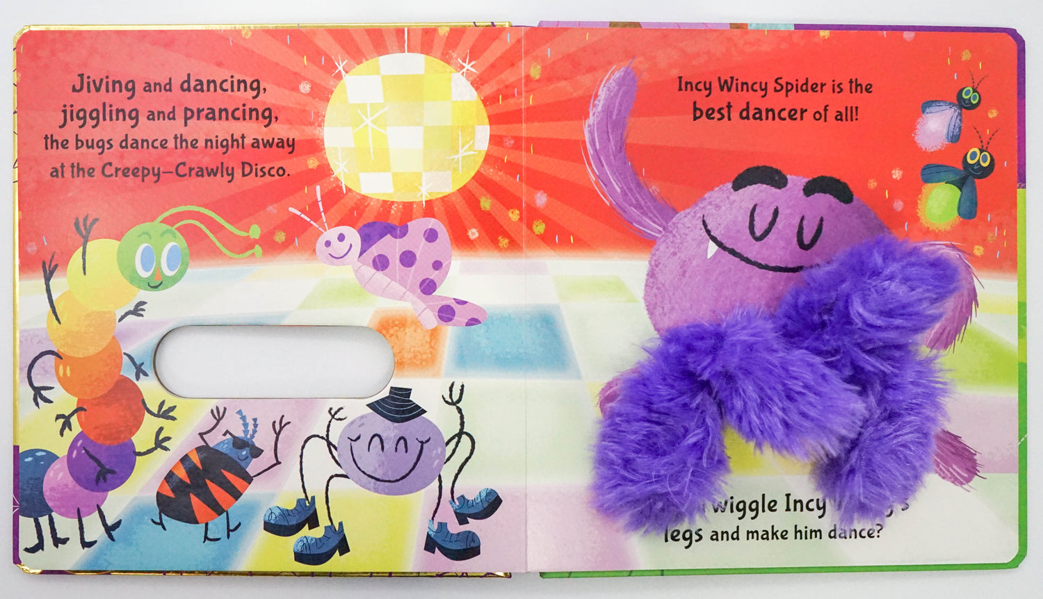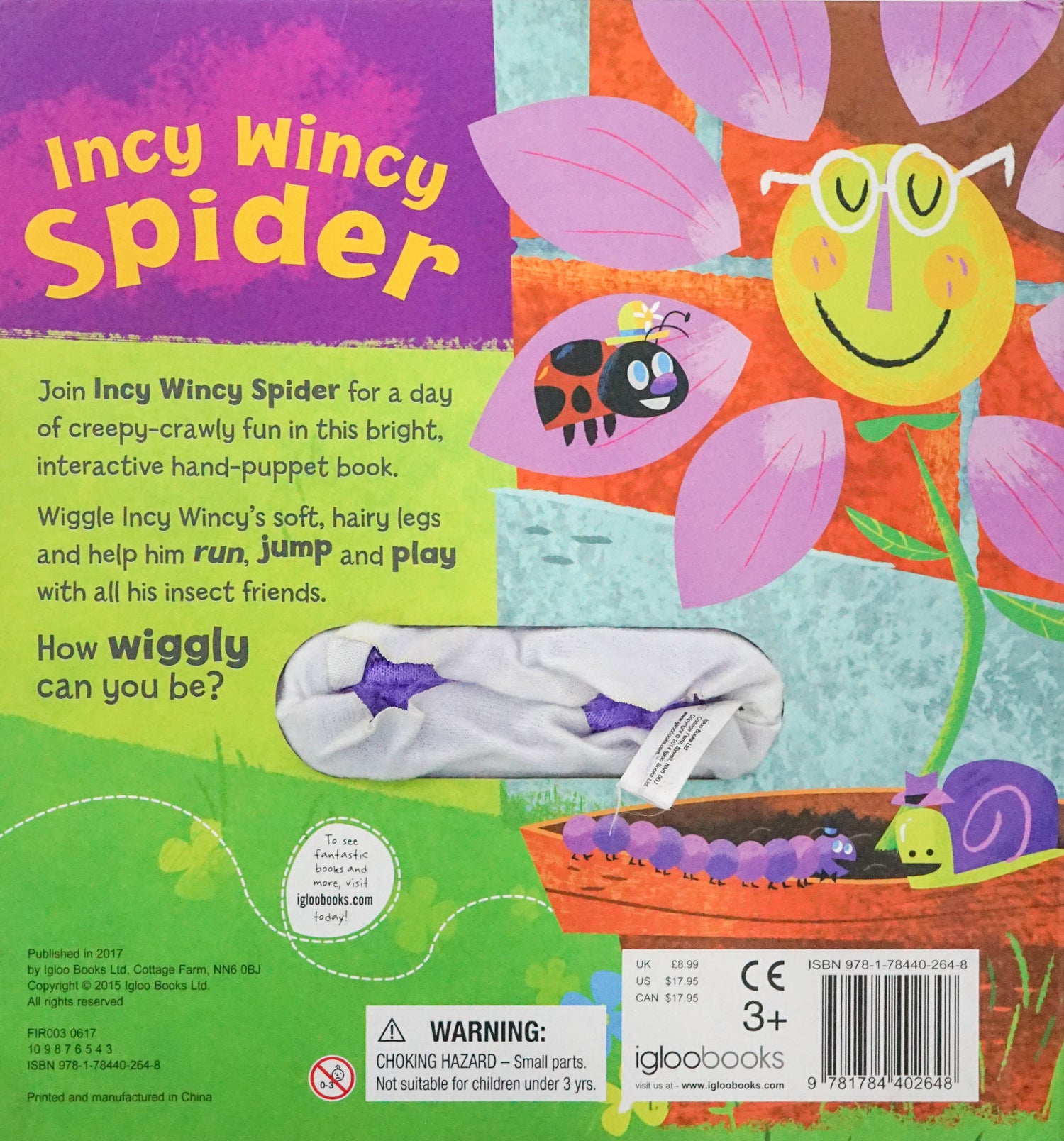 Join Incy Wincy Spider for a day of creepy-crawly fun in this bright, interactive hand-puppet book. Wiggle Incy Wincy's soft, hairy legs and help him run, jump and play with all his insect friends. How wiggly can you be?