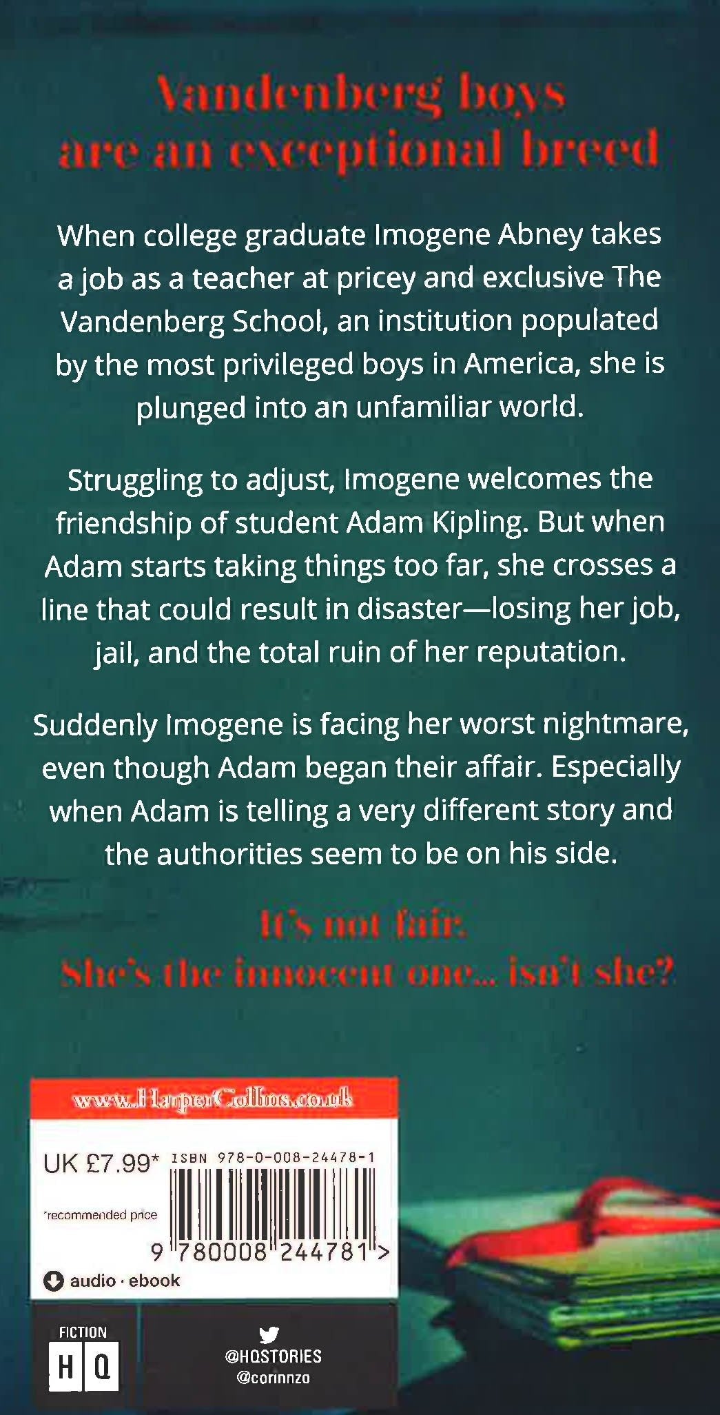 A twisty read following an affair between a young female teacher and male boarding school student that fans of Katerina Diamond and Louise Jensen will devour. She's a teacher. She knows the rules. When recent college graduate Imogene Abney takes a job as a teacher at pricey and exclusive The Vandenberg School, an institution populated by the most privileged boys in America, she is plunged into an unfamiliar world. Struggling to adjust, Imogene welcomes the friendship of student Adam Kipling. But when Adam starts taking things too far, she crosses a line that could result in disaster -losing her job, jail, and the total ruin of her reputation. Suddenly Imogene is facing her worst nightmare, even though Adam began their affair, which hardly seems fair to Imogene. Especially when Adam is telling a very different story and the authorities seem to be on his side. She's the innocent one...Isn't she?